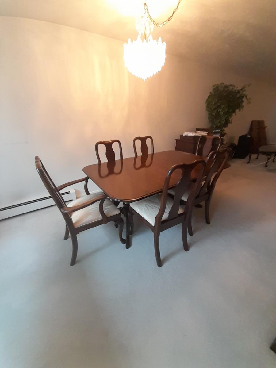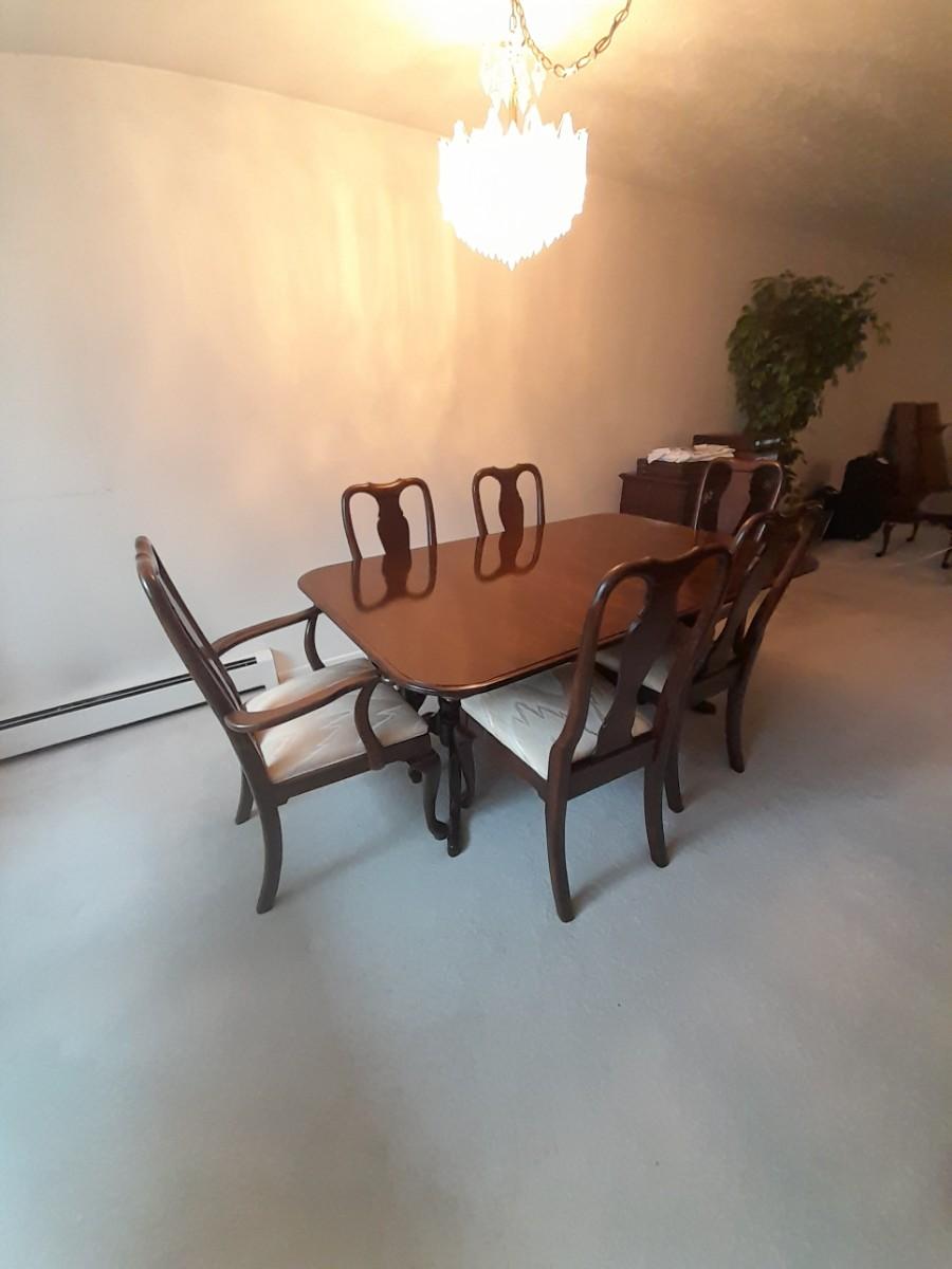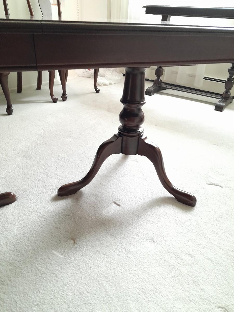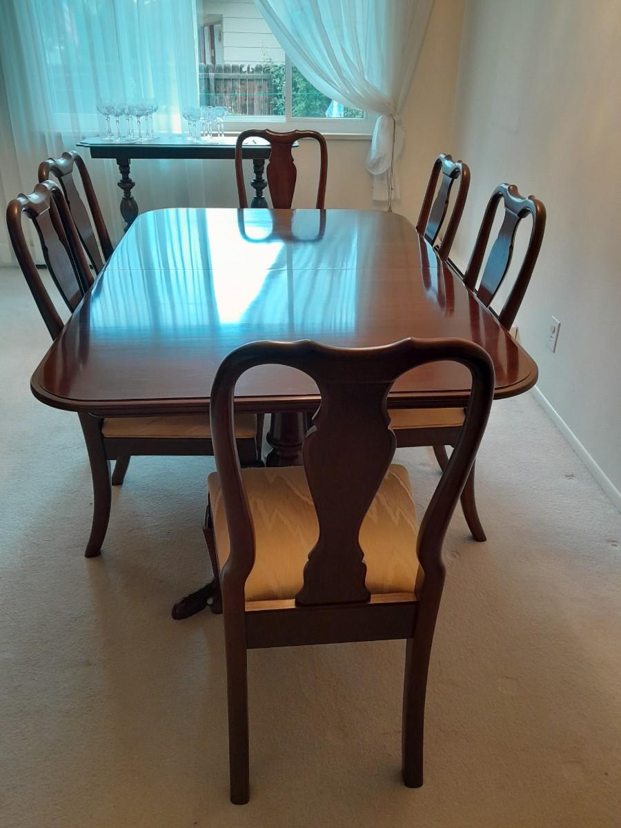 ETHAN ALLEN TABLE 29" X 66" X 42" TWO LEAVES 42" X 18" EACH. 6 CHAIRS, AND TOP PROTECTORS.
