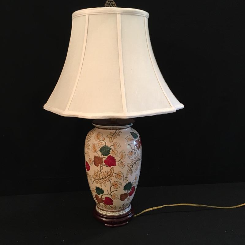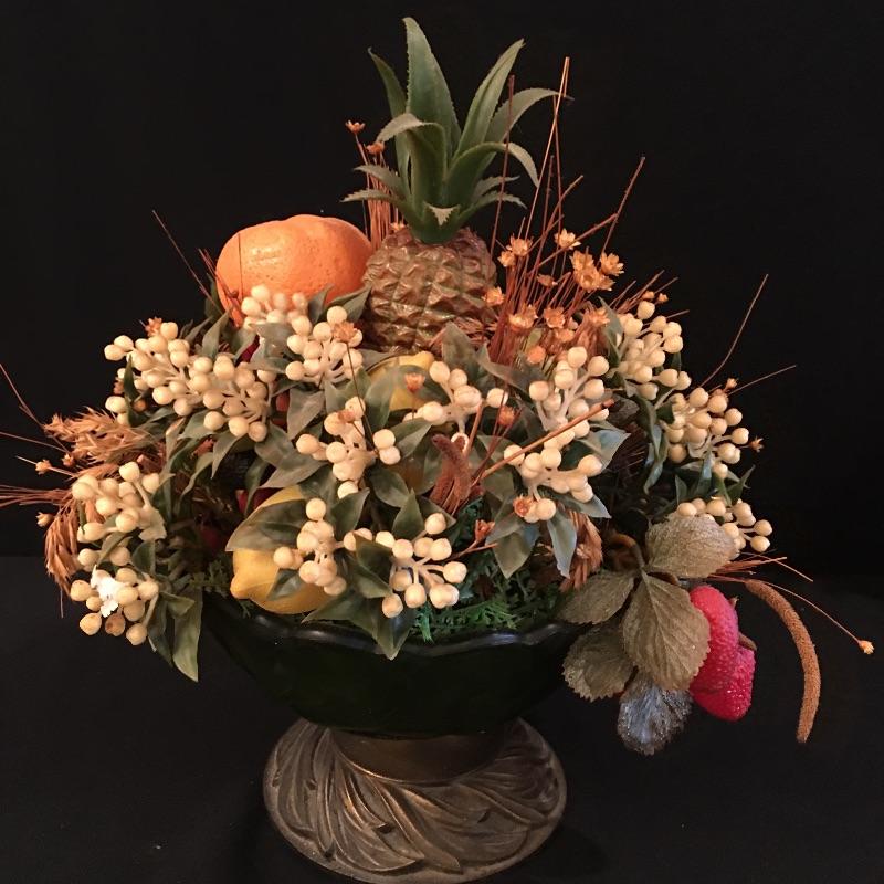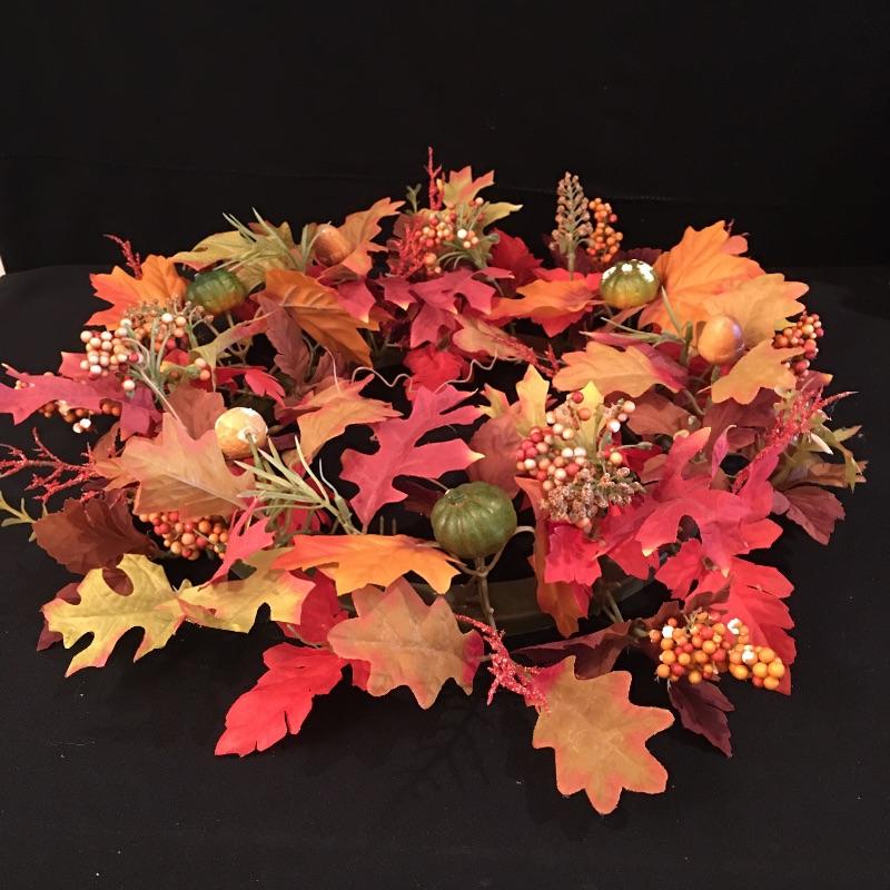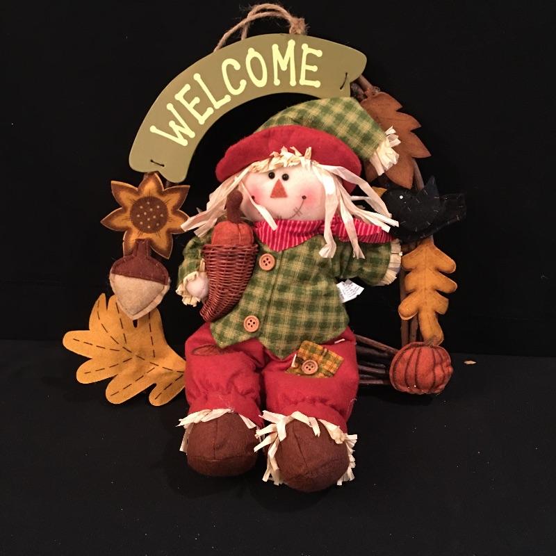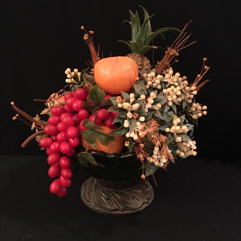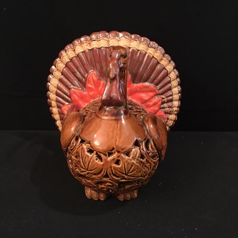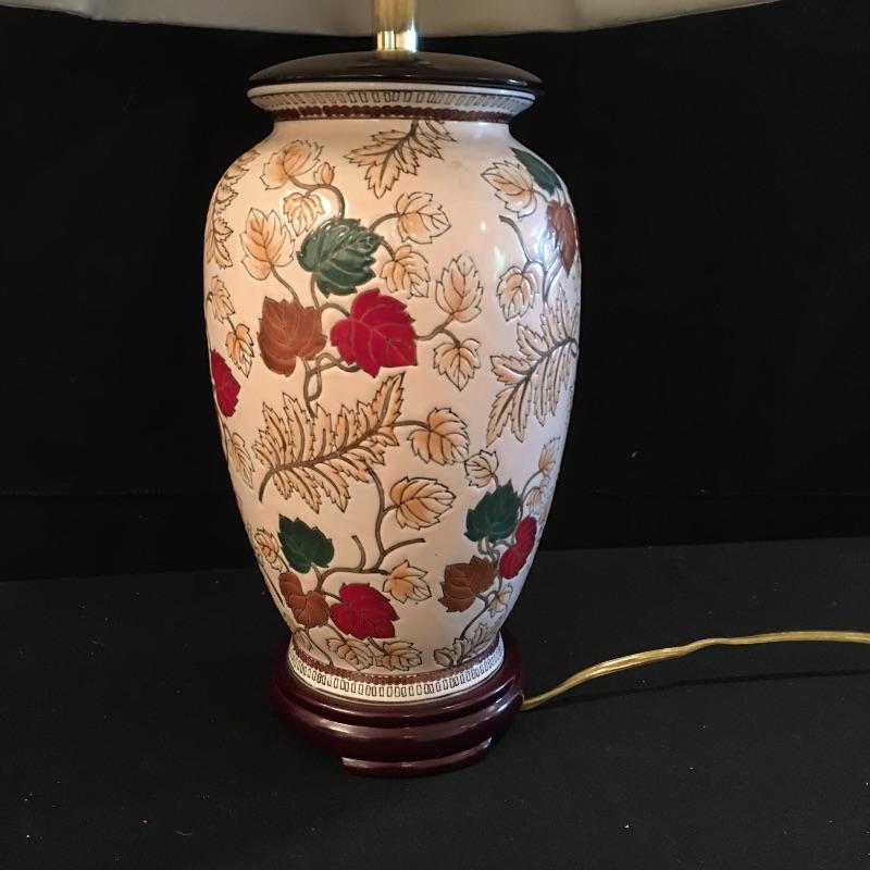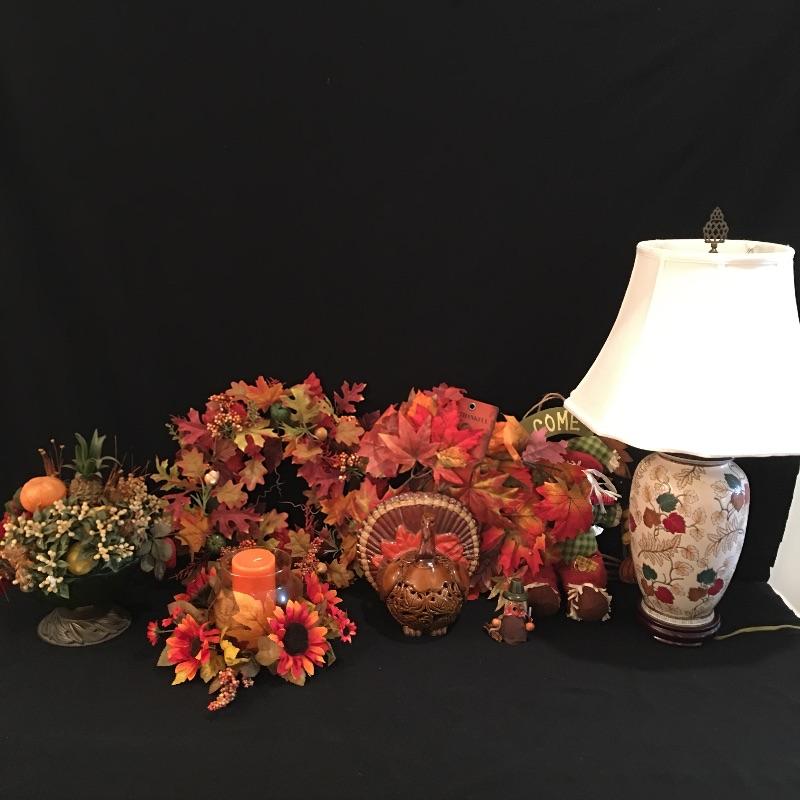 Get ready for thanksgiving and the fall with this cornucopia of fall decor. Lot includes working lamp, turkey welcome sign, candle in glass with fall colors faux plants, faux plant garland and a faux fruit and plant centerpiece with glass and metal bowl. Lamp measures 7”D x 28” tall.