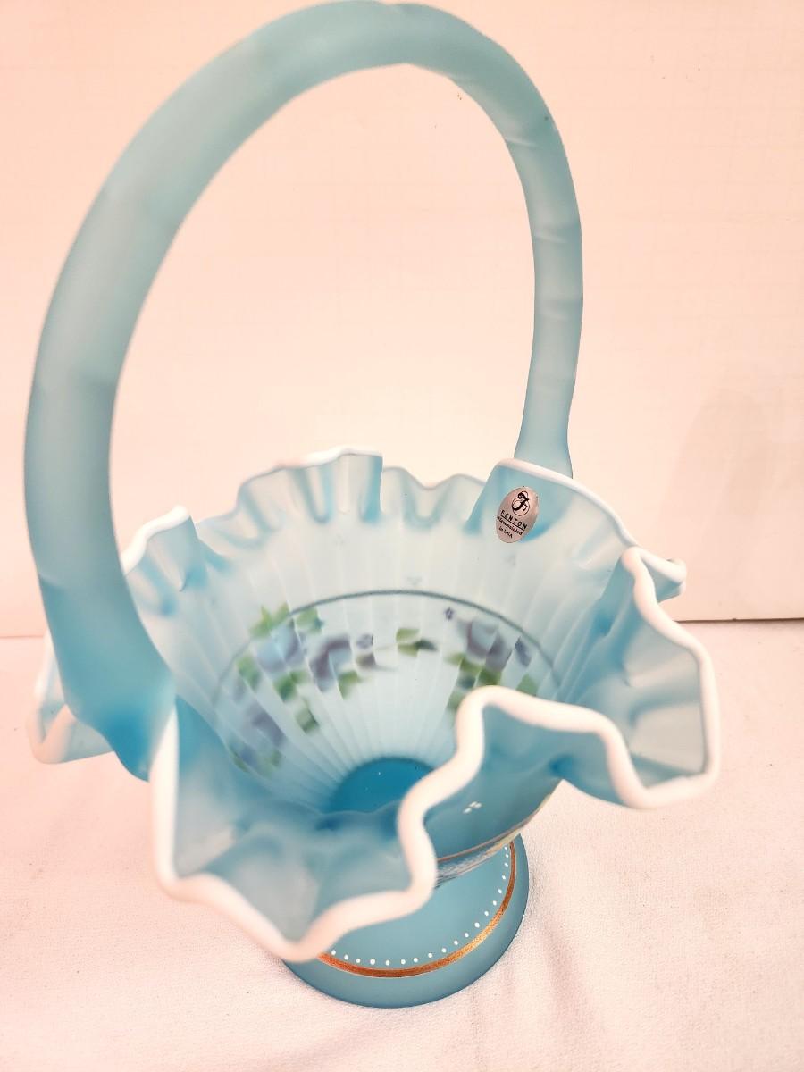 Fenton Art Glass 2002 Satin finish Charlston Collection basket - has label, signed. 9.5" tall, good condition.