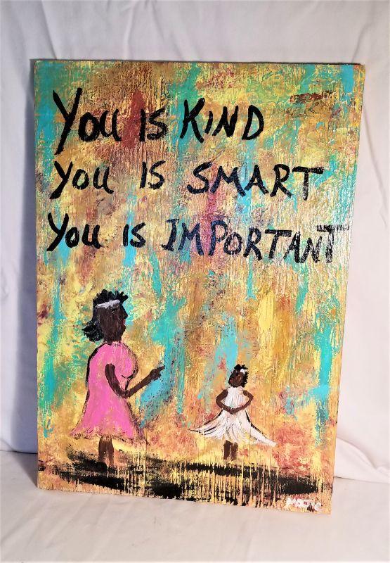 Black Americana folk art paining on board. Signature seems to read "Moore." Measures 21" tall, 15" wide.