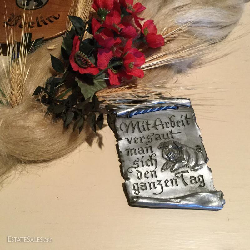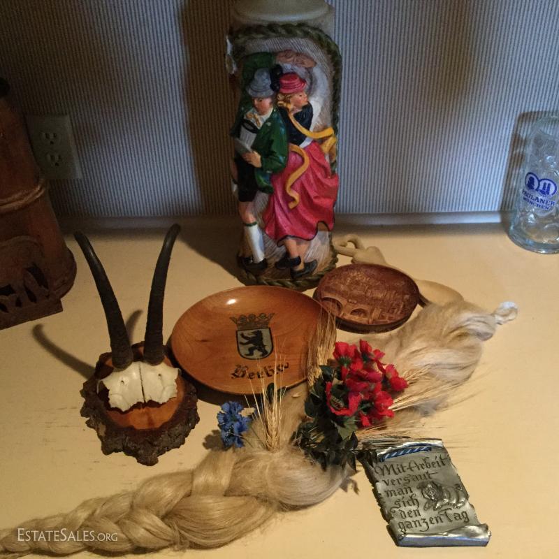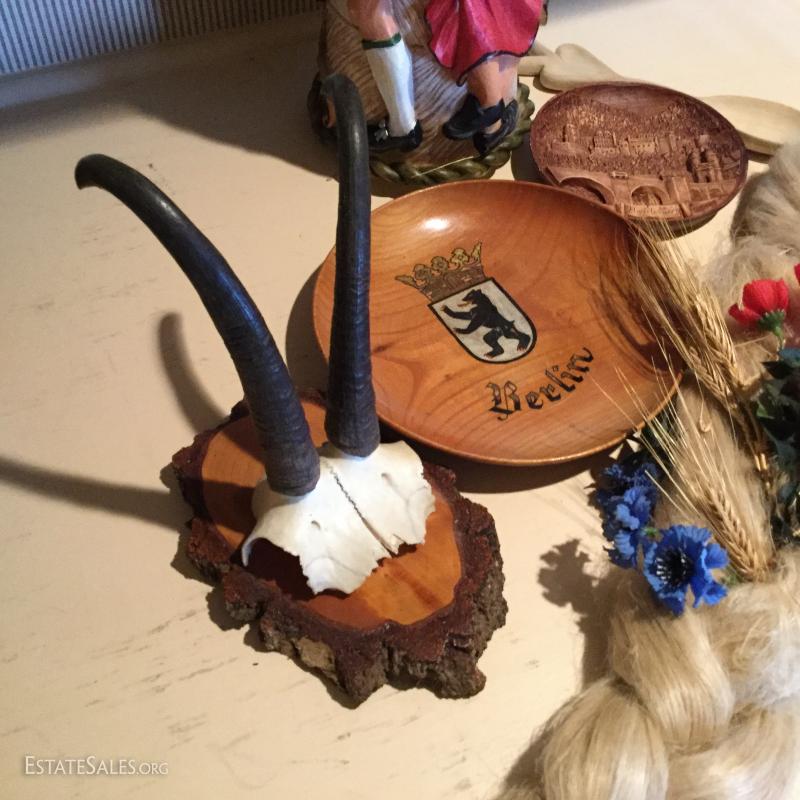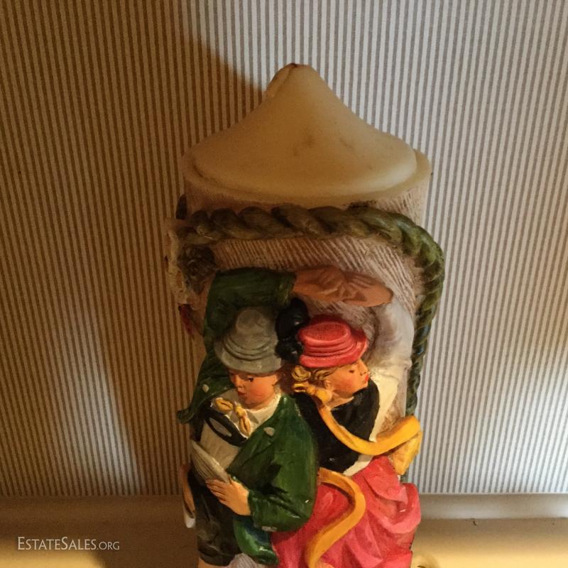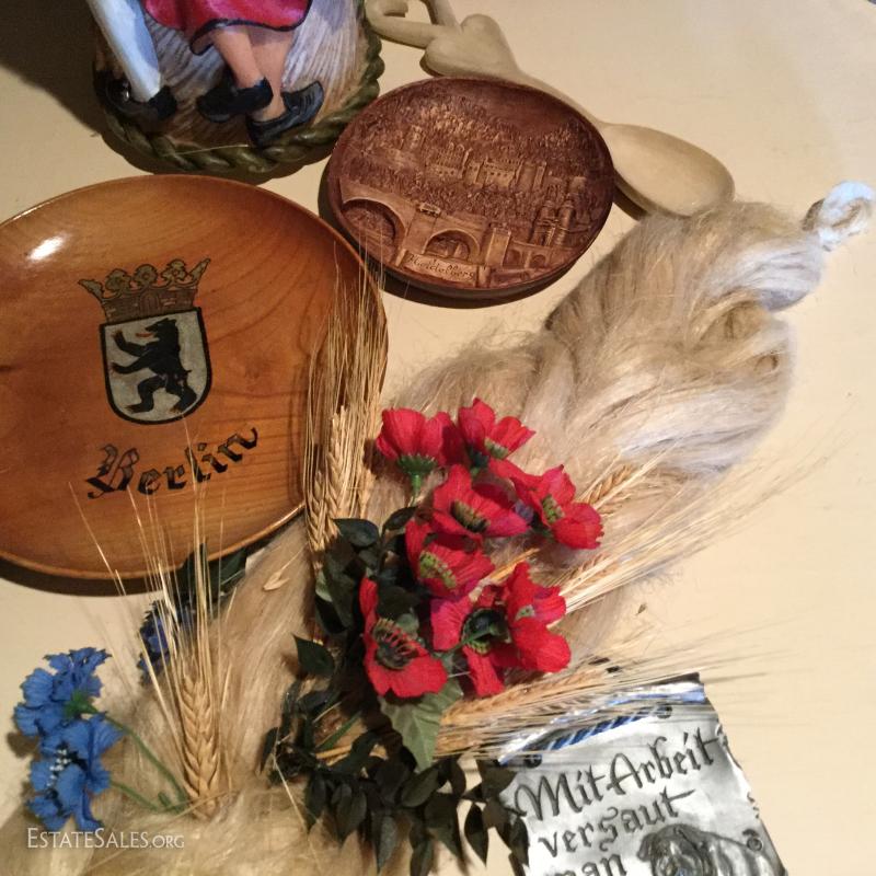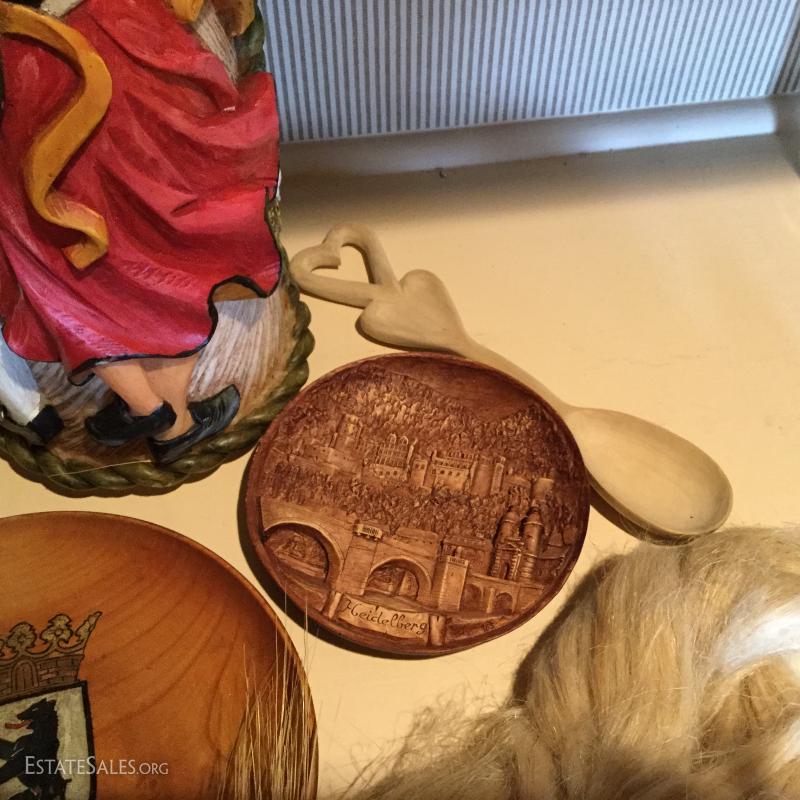 Large candle with German dancers, 18" tall. Two collectible plates. Antler Plaque. Decorative piece made of faux blonde hair, and more! Seven collector items in total.