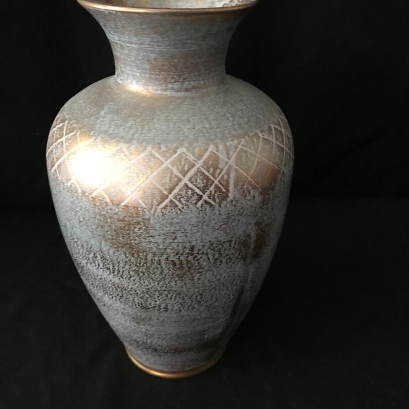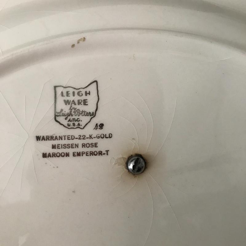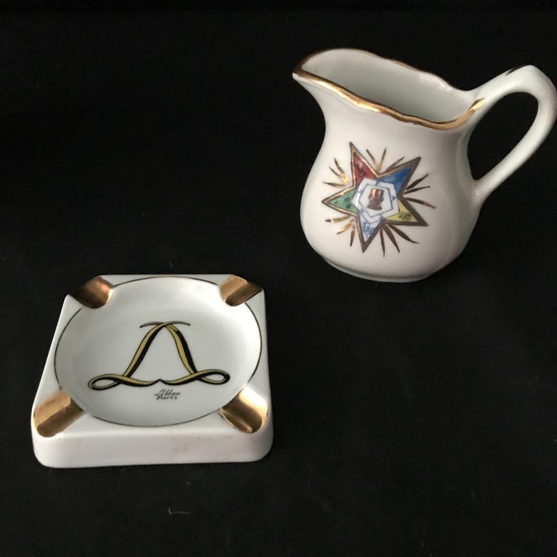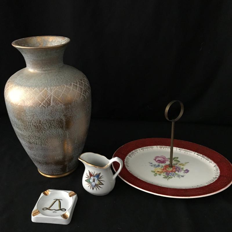 Stangl Pottery vase stands 12.5” tall, Limoges ashtray, Sterling China Co. mini pitcher and Leighware platter with metal handle in the middle. Lot is available for local pick up in Maggie Valley, NC only.
