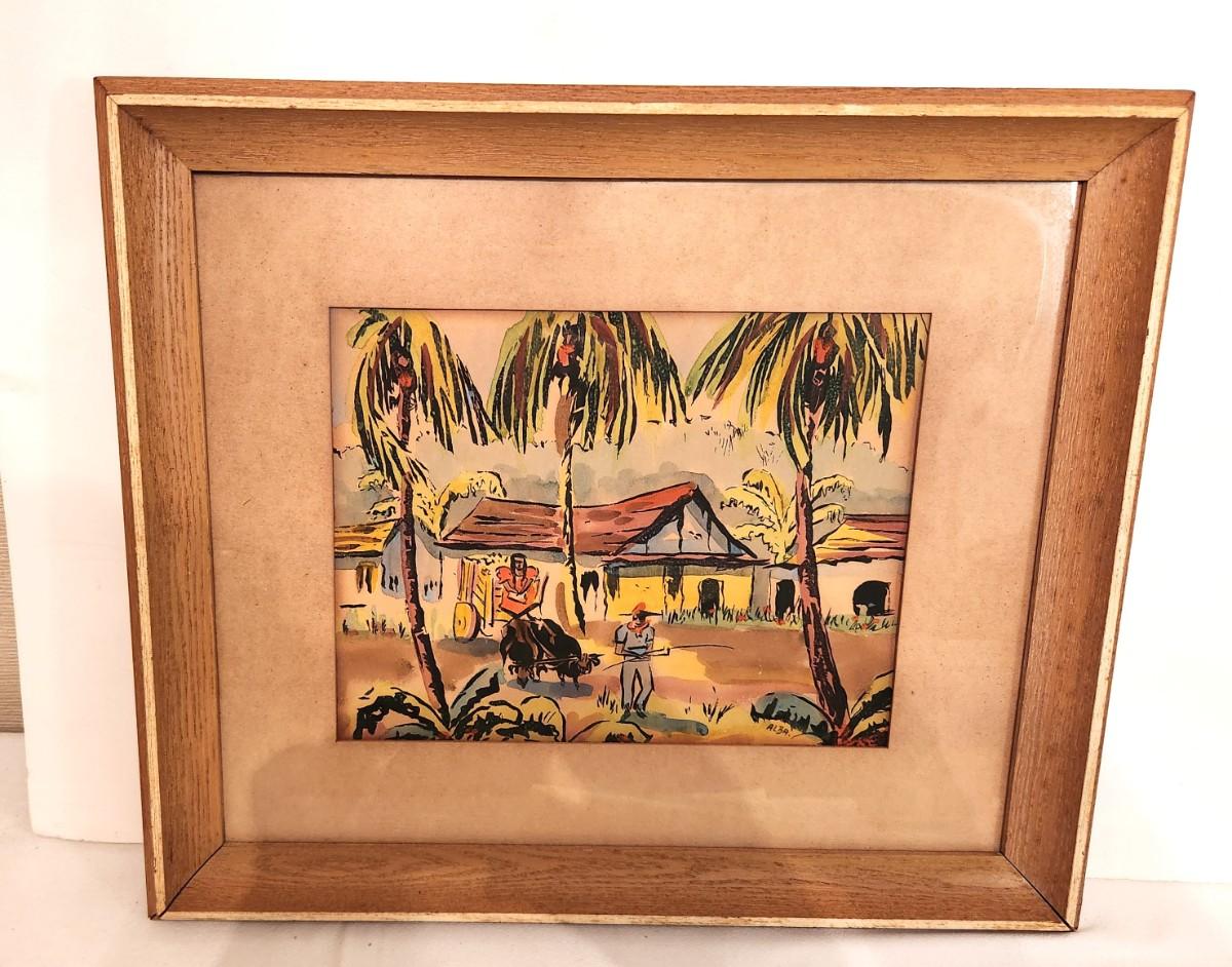 Wonderful Mid-Century Modern Watercolor in frame - tropical scene signed by "Abla". Perfect for your sunroom, covered patio, beach house, or tiki bar - 21" x 18" - good condition.