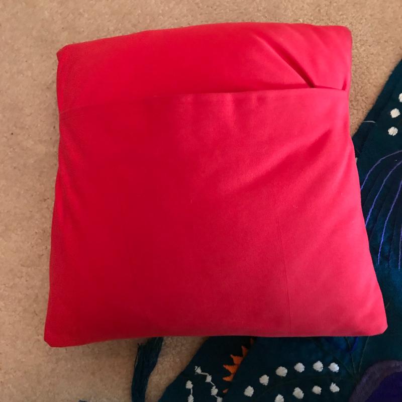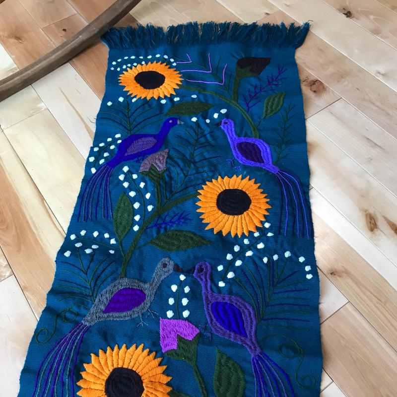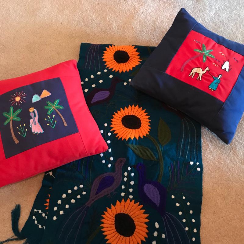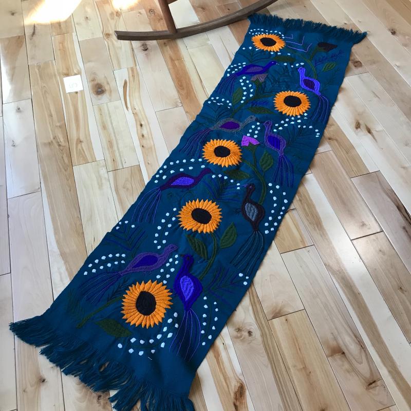 These three hand-embroidered pieces will add color and culture to your home. Pillows are approx. 14” square with removable pillow cases. Runner is approx. 60” long plus fringe. Runner is from southern Mexico.