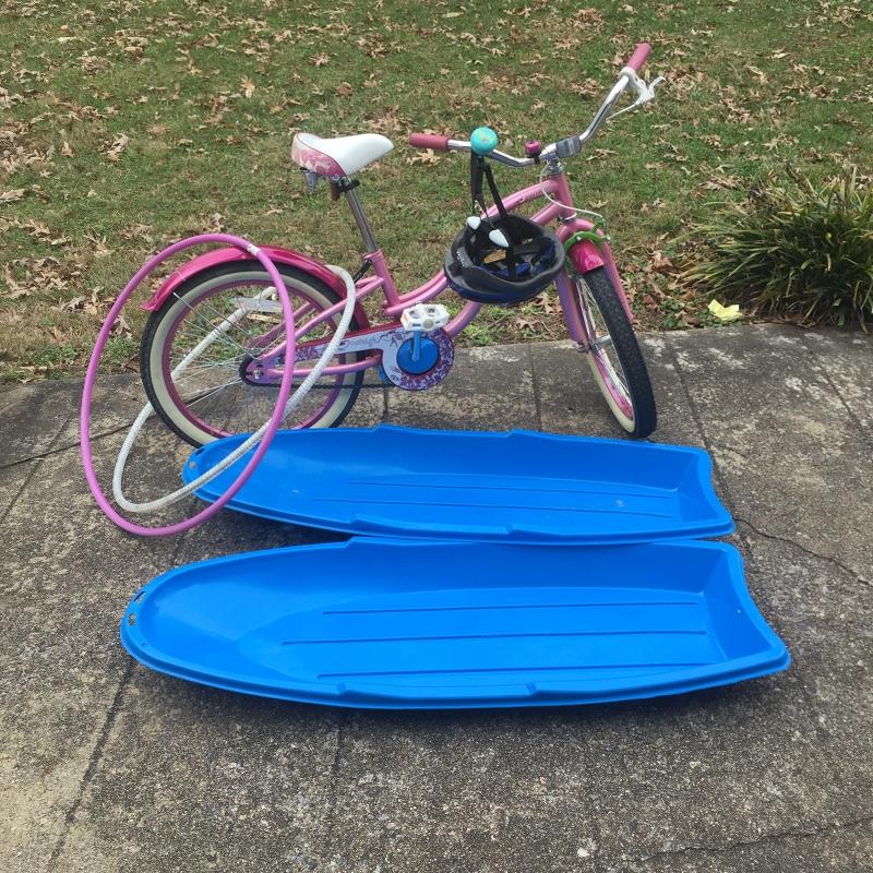 Raleigh Kids bicycle in great condition. Also includes a pair of hula hoops and a pair of plastic sleds. Be ready for winter and summer with these cool toys. Local Pickup Only