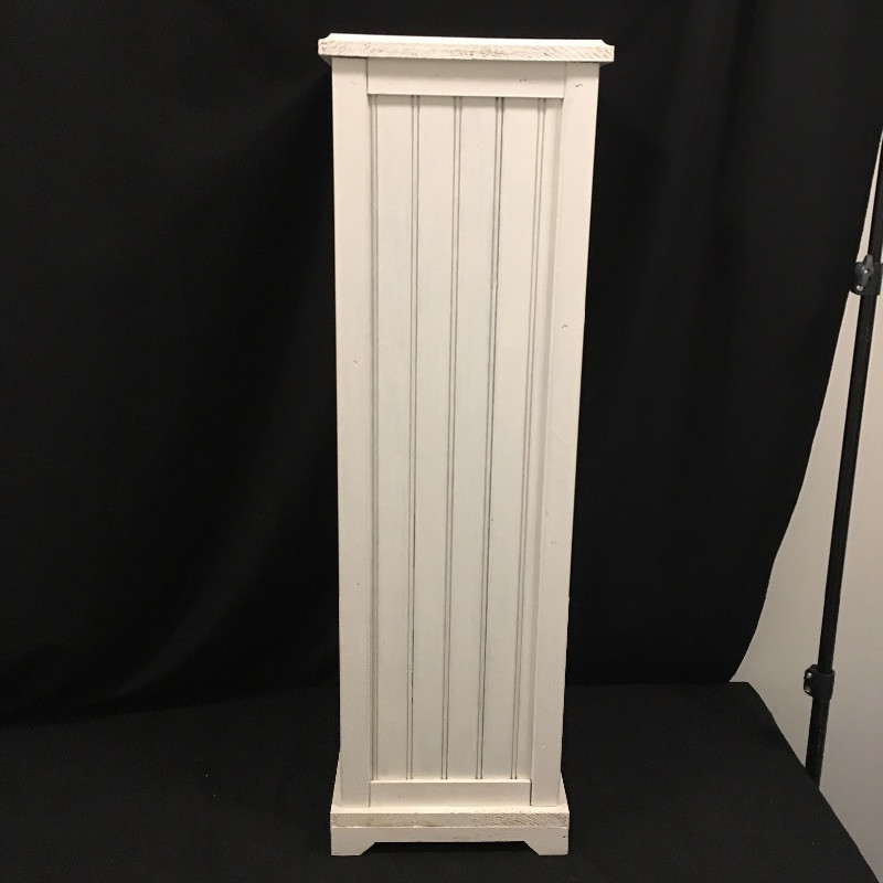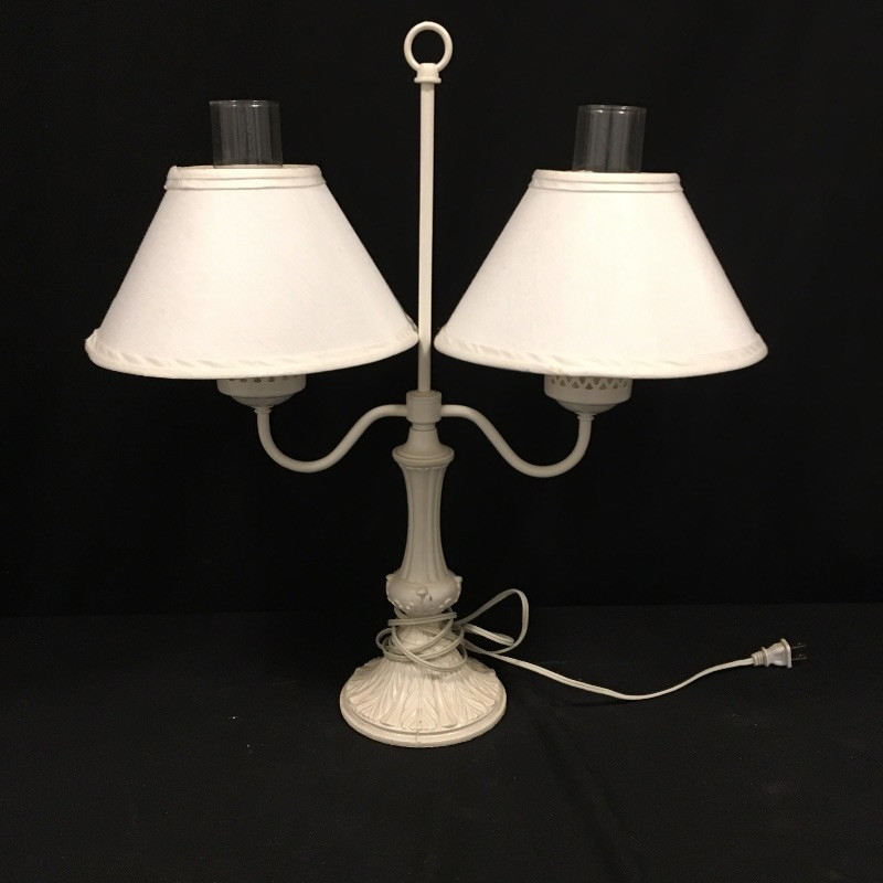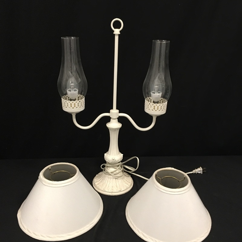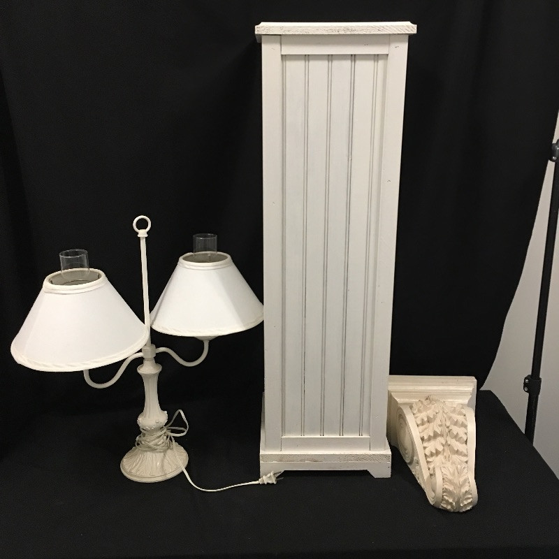 Dress up your space in style with this darling vintage table lamp with corbel and wooden stand. Lamp is an off white metal base with two white shades and is in excellent vintage condition. Wooden stand is also an off white painted piece. A great way to display your collectibles and light up your room. Stand measures 11.25” x 11.25” x 36”.