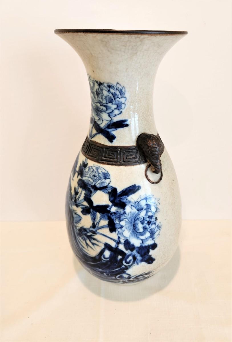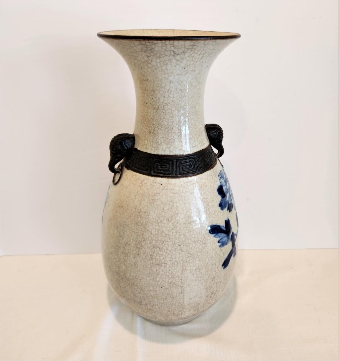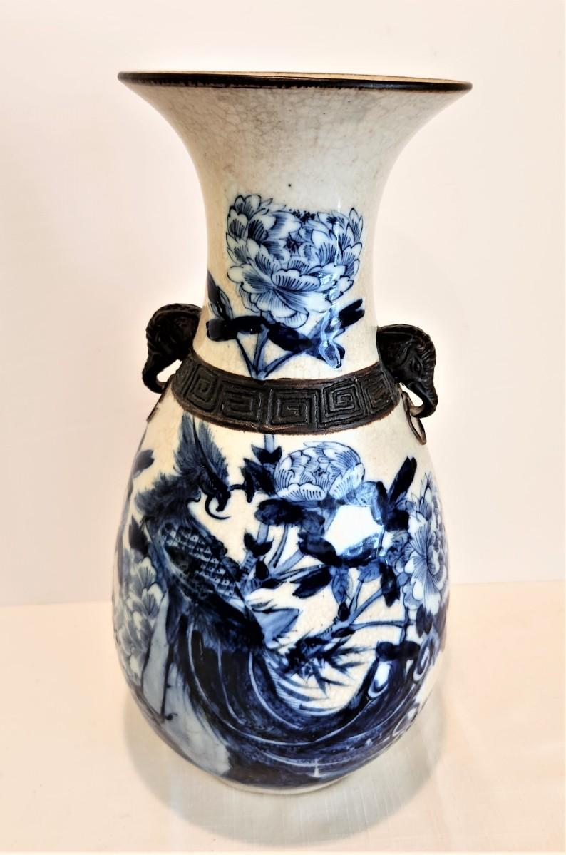Large contemporary Ceramic blue/white vase with Asian styling, Elephant accents. 16.5" tall. Good condition.