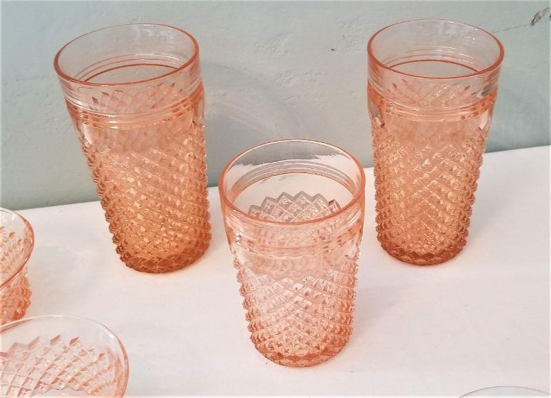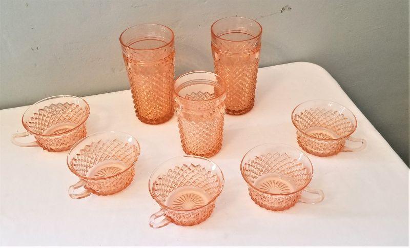 You get all you see here - Depression-era Miss America glassware - 3 drinking glasses, 5 cups. Good condition. Glasses are 6" tall, cups are 4.5" tall.