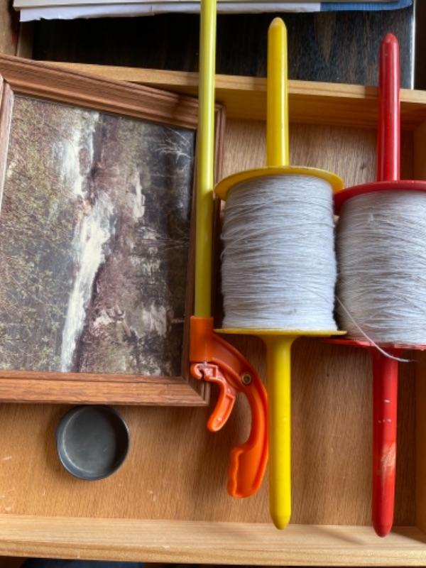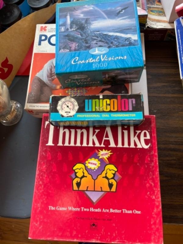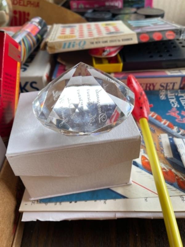 Lot 93. Lot of vintage stationery, boxes of pencils, cookbook, memory books, puzzles, games, crystal paperweight, kite string, wooden box, Christmas trinket bowls, delft china cups, clock--$25