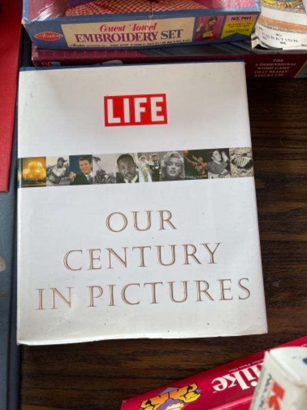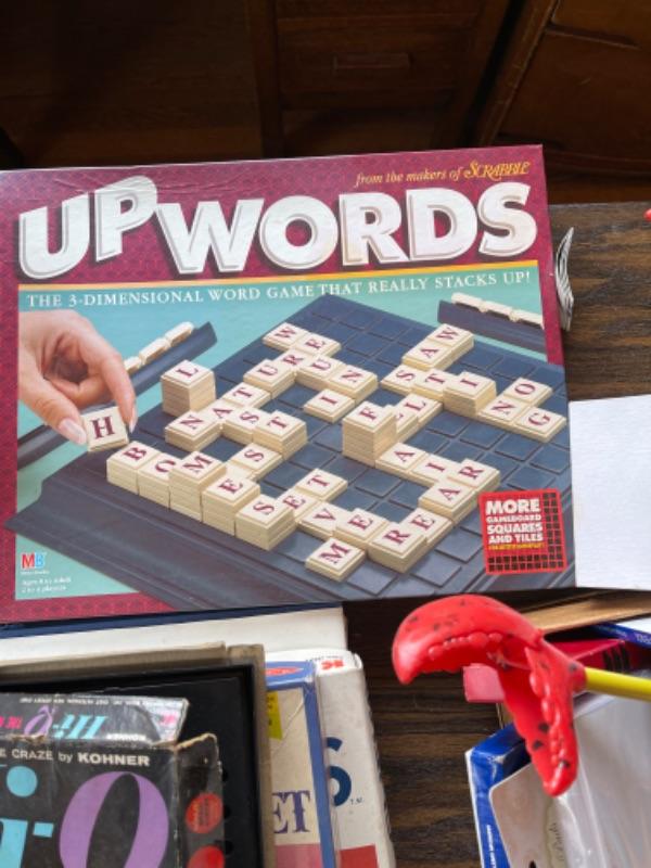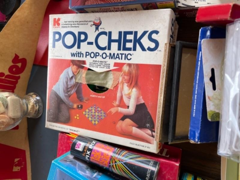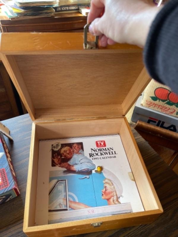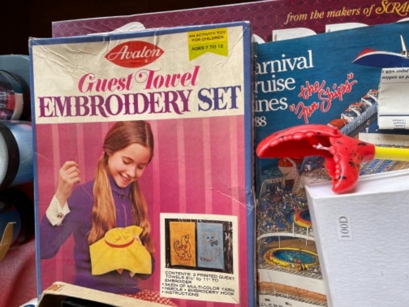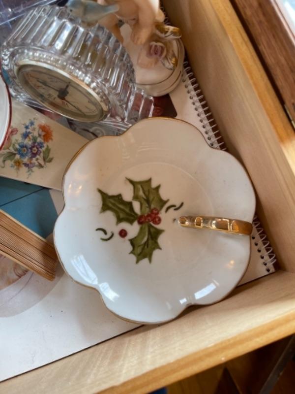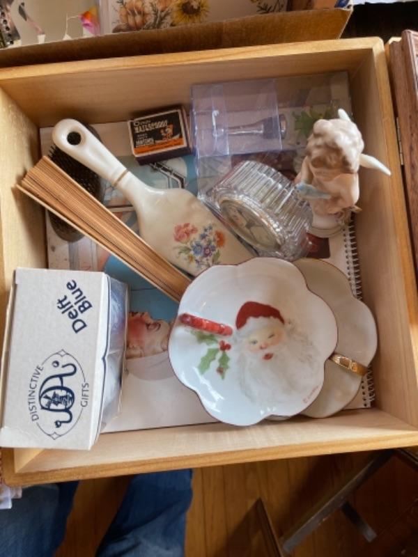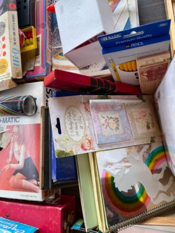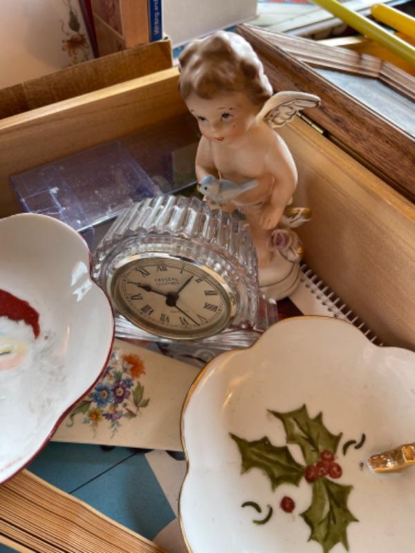 Lot 93. Lot of vintage stationery, boxes of pencils, cookbook, memory books, puzzles, games, crystal paperweight, kite string, wooden box, Christmas trinket bowls, delft china cups, clock--Was $25 - -Now $10