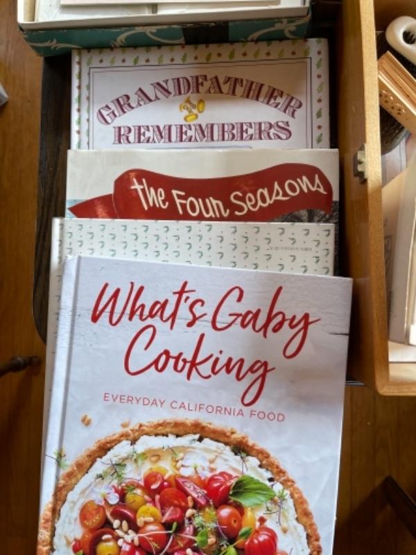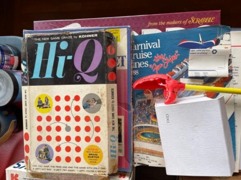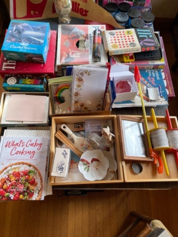 Lot 93. Lot of vintage stationery, boxes of pencils, cookbook, memory books, puzzles, games, crystal paperweight, kite string, wooden box, Christmas trinket bowls, delft china cups, clock--$10