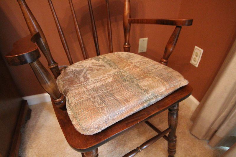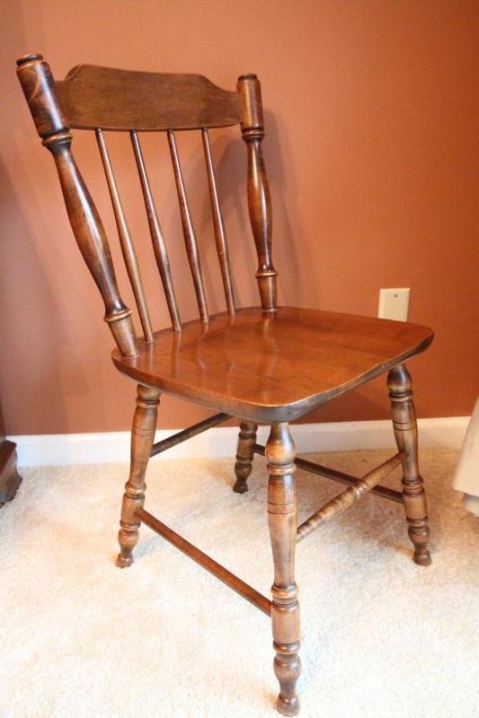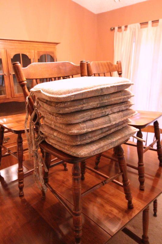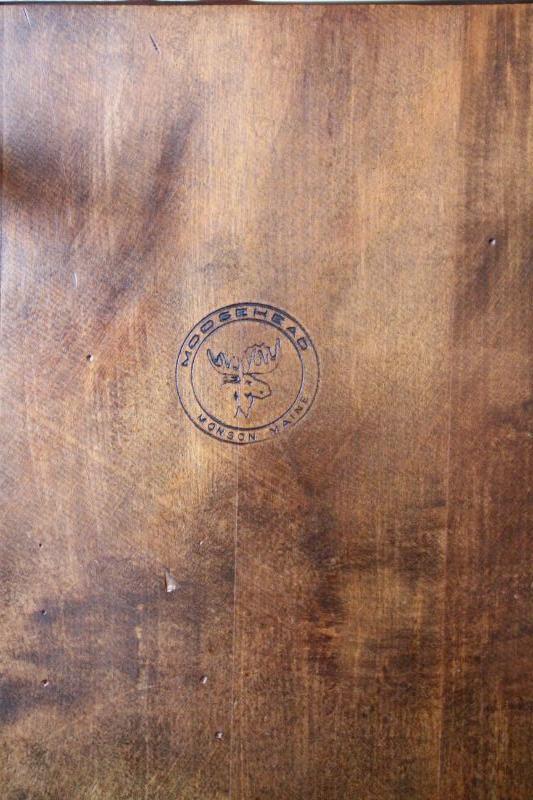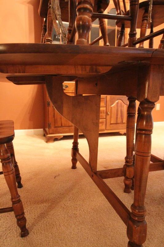 Table manufactured by Moosehead Co. of Monson, Maine which closed in 2010. Solid maple table. 4 solid wood dining chairs in Early American style and 2 coordinating arm chairs. 6 tieback cushions. 2 extra leaves to table. Table has gateleg so it can be folded into a smaller table.