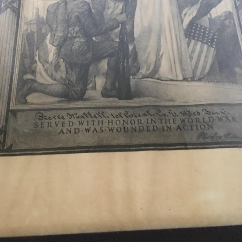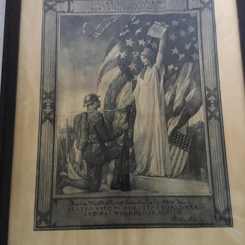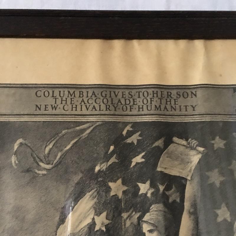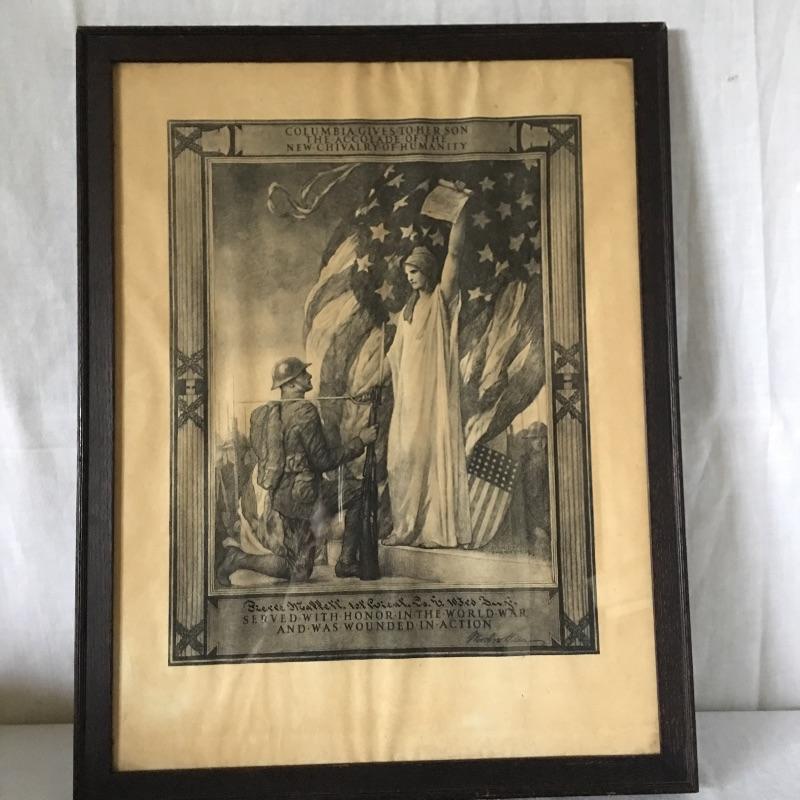 Broadside depicting a soldier with rifle, wearing full field dress who stands kneeling before Columbia in front of a flag and other soldiers. Two fascii frame the image. Text states the image is dedicated to Bruce Mallett, The image bears a facsimile of Woodrow Wilson's signature. Frame measures 17.5” x 22.5”.