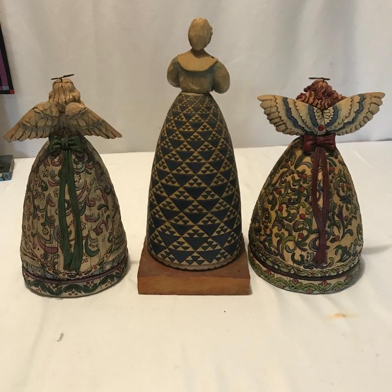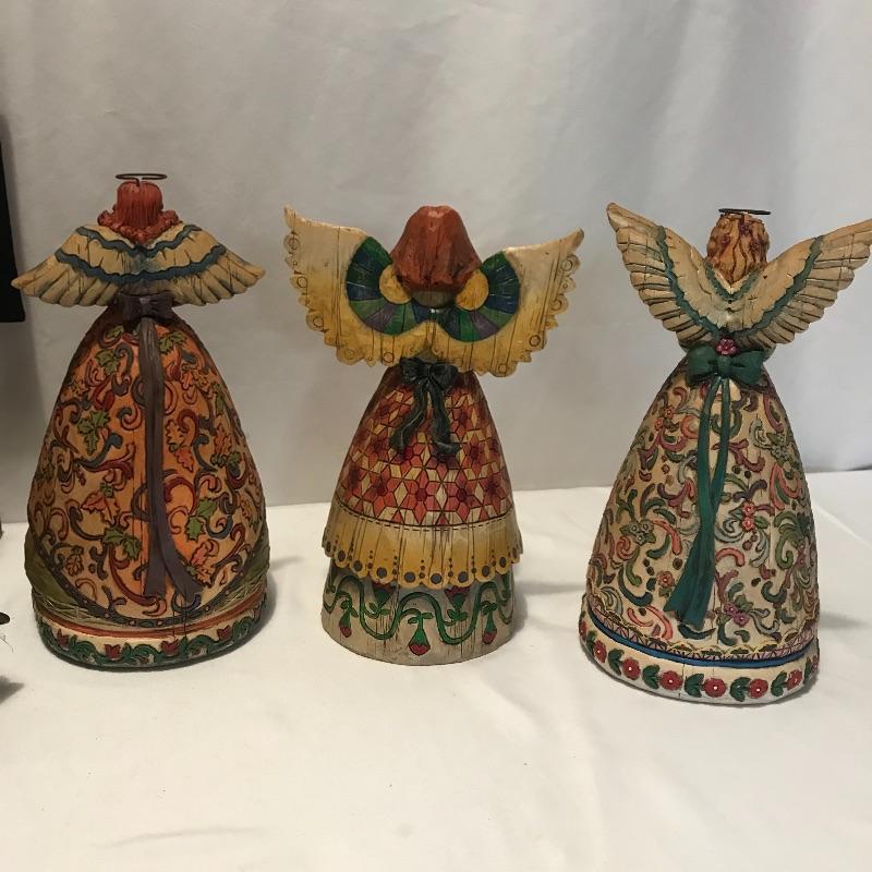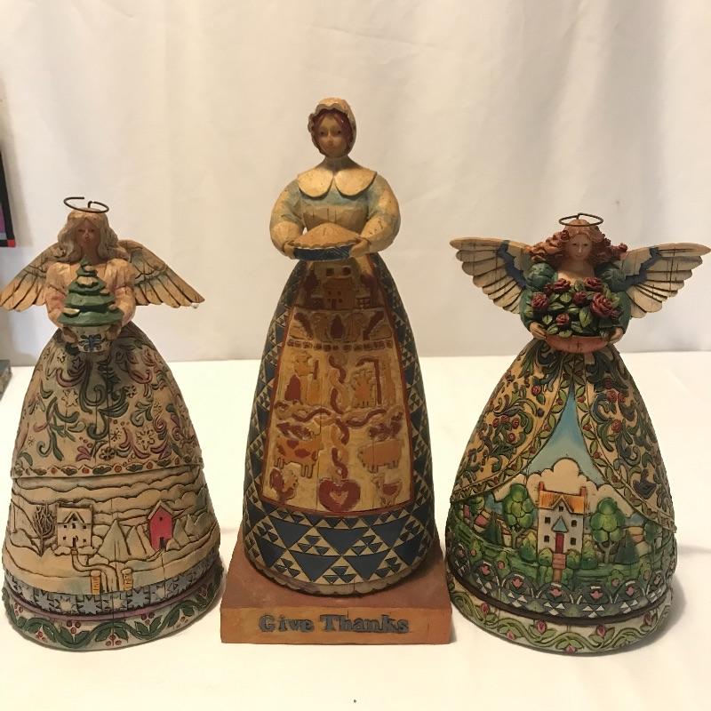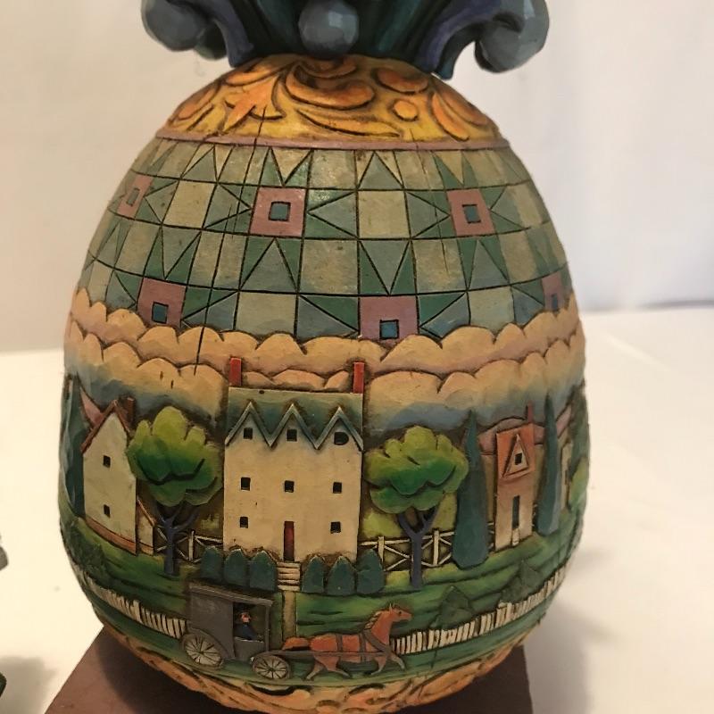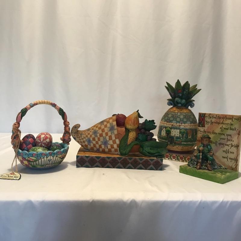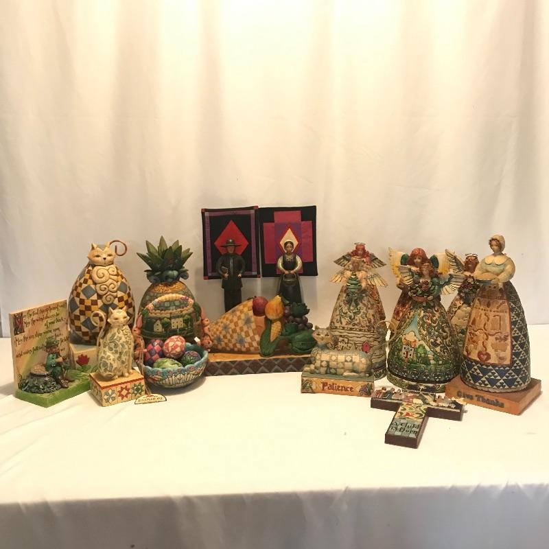 Fifteen Jim Shore collectibles to adorn your house with “quilted” colors! A hanging cross, five large angels with various themes and a 12” tall woman titled “Give Thanks”. Lot includes other holidays like Easter and St. Patrick’s Day themes. Two stunning Amish people, three cats and a Pineapple to round out the lot. This large lot is available to ship, but please call UPS at 828-252-6930 for a quote prior to bidding.
