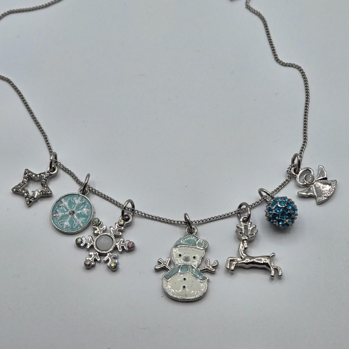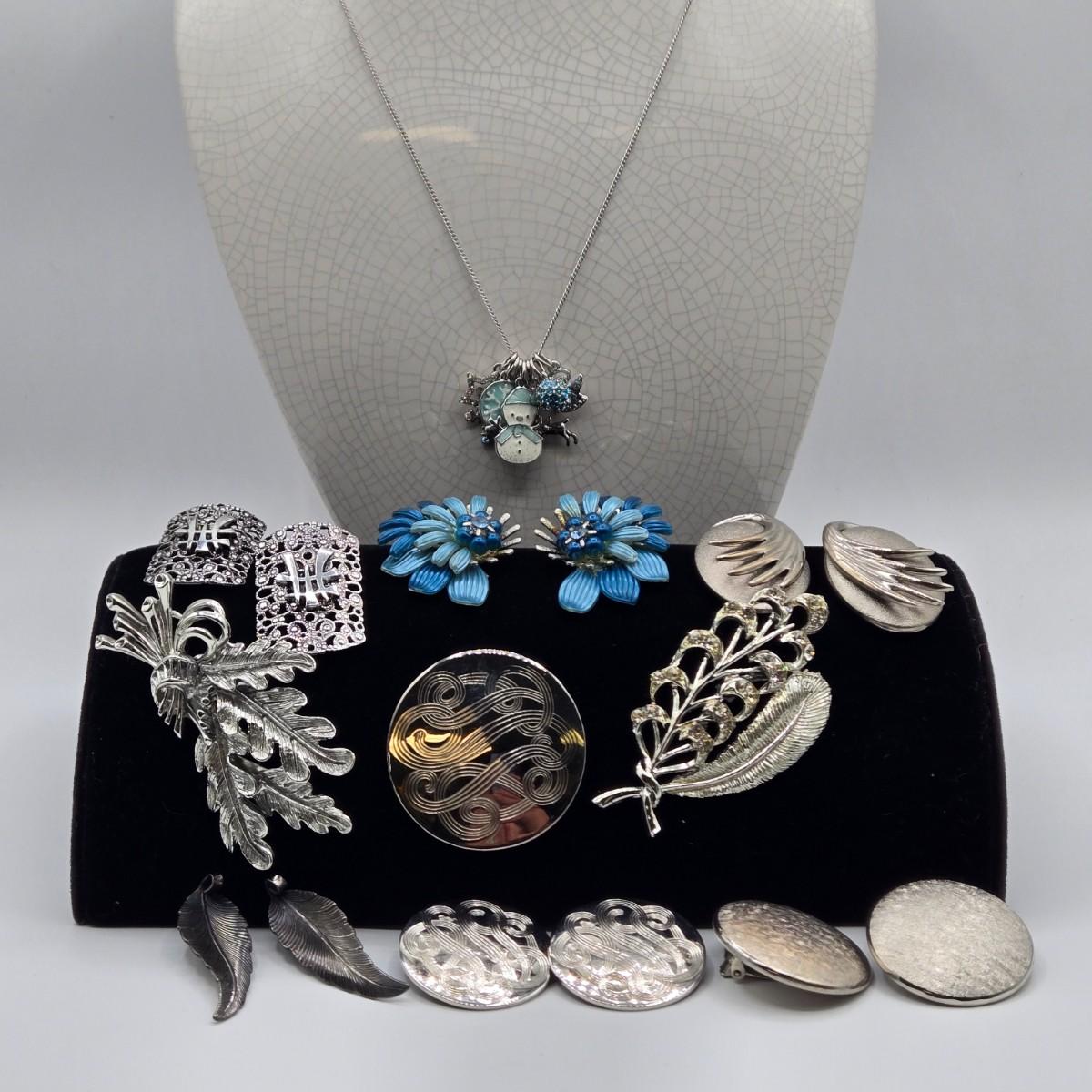 LOT 411: Multiple Pairs of Clip Earrings, Brooches, Silver-tone Chain with Winter Charms, and More
