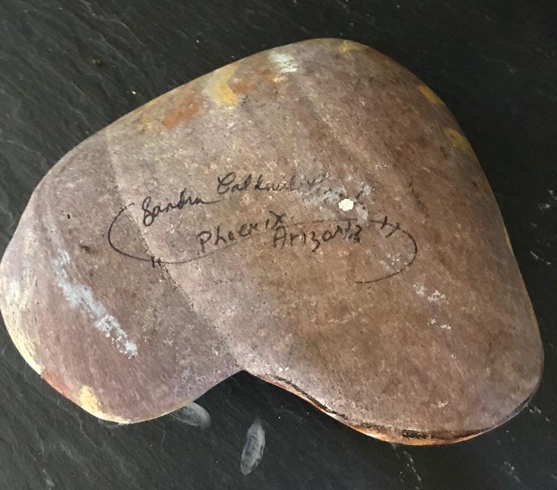 Painted Cat Rock signed Sandra Phoenix Arizona measures approximately 8"