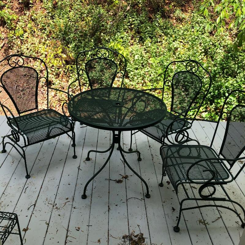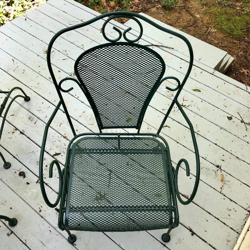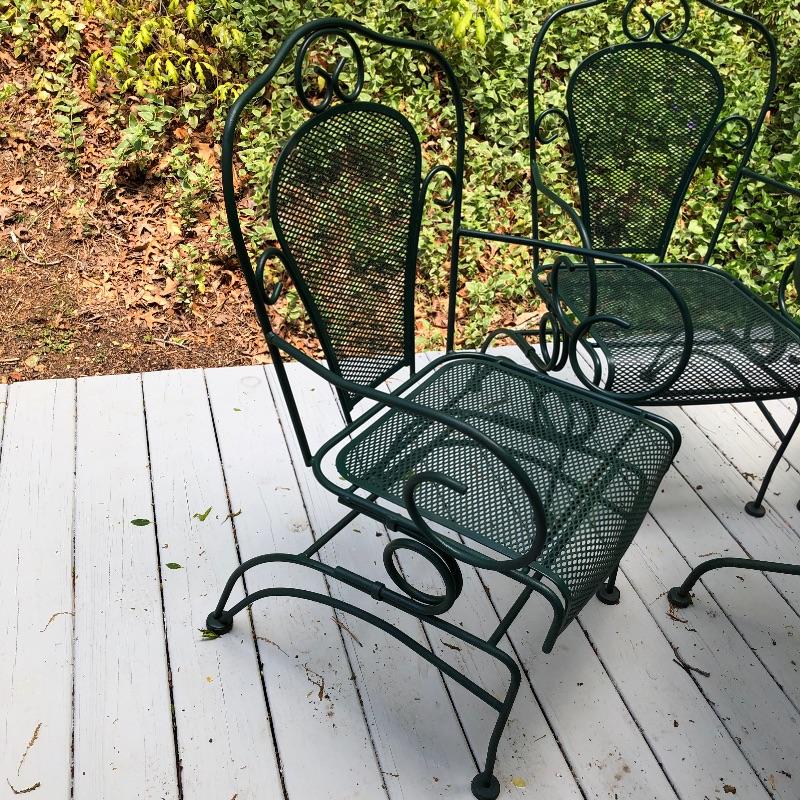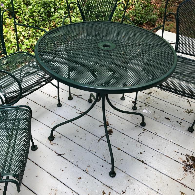 Nice and sturdy metal patio table and four matching chairs in dark green. Really nice furniture for your outside space. Table has hole for an umbrella and measures 30” across the top and is 28” tall. Chairs are spring rockers.