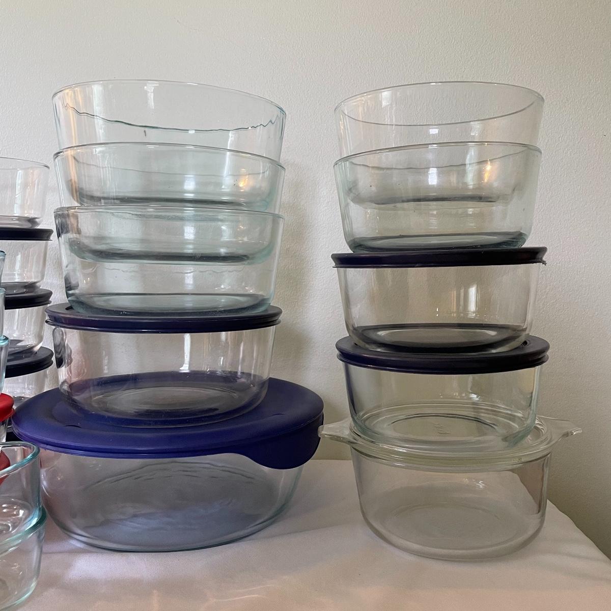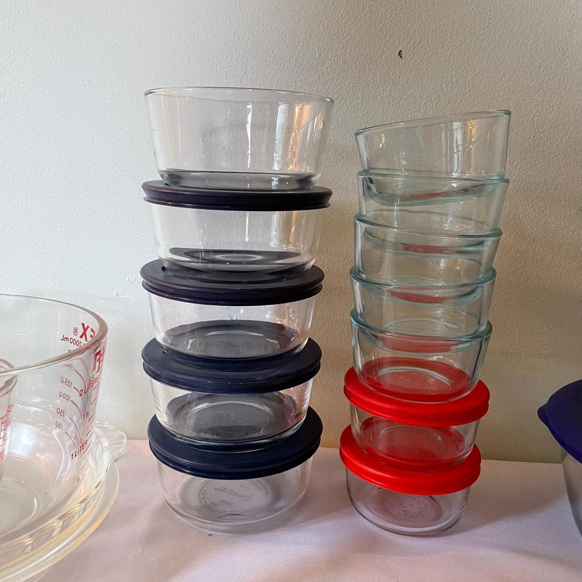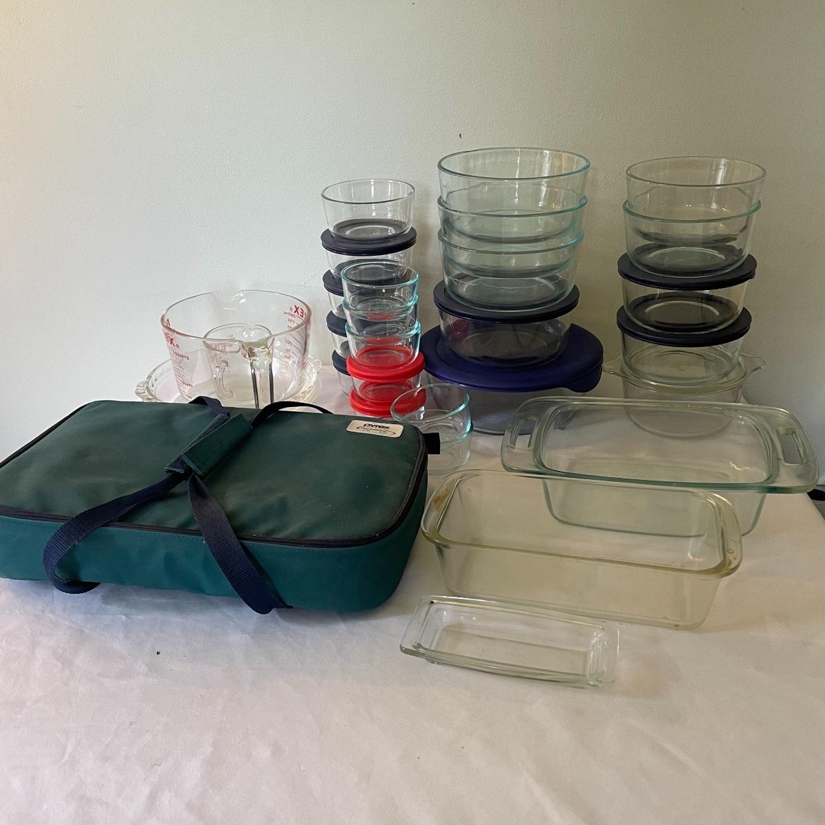 Stock your cabinets with nice, durable and classic Pyrex. Four 1.75qt bowls with one lid, five 1qt bowls with one glass lid and two rubber lids; five 2cup bowls with four lids and seven 1cup bowls with two red lids. Lot also contains one lidded 3qt dish, two pie pans, an 8-cup and 1-cup measuring cups; a 2qt loaf pan. A 2qt casserole dish with handles and a 3qt ribbed casserole dish with lid and carrying case. See images. Local pick up only.