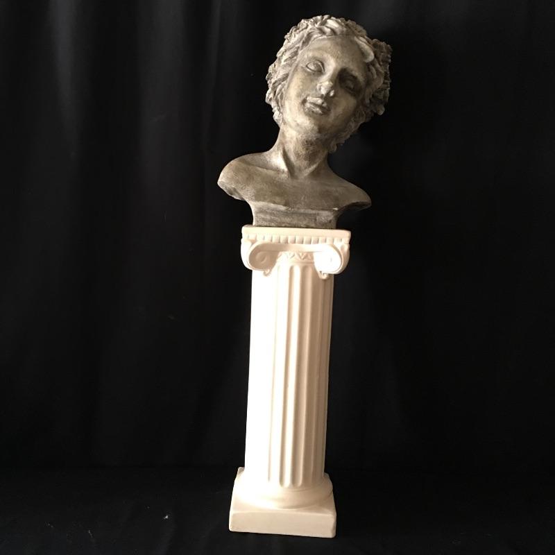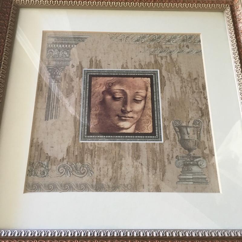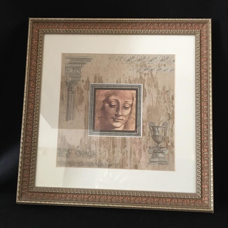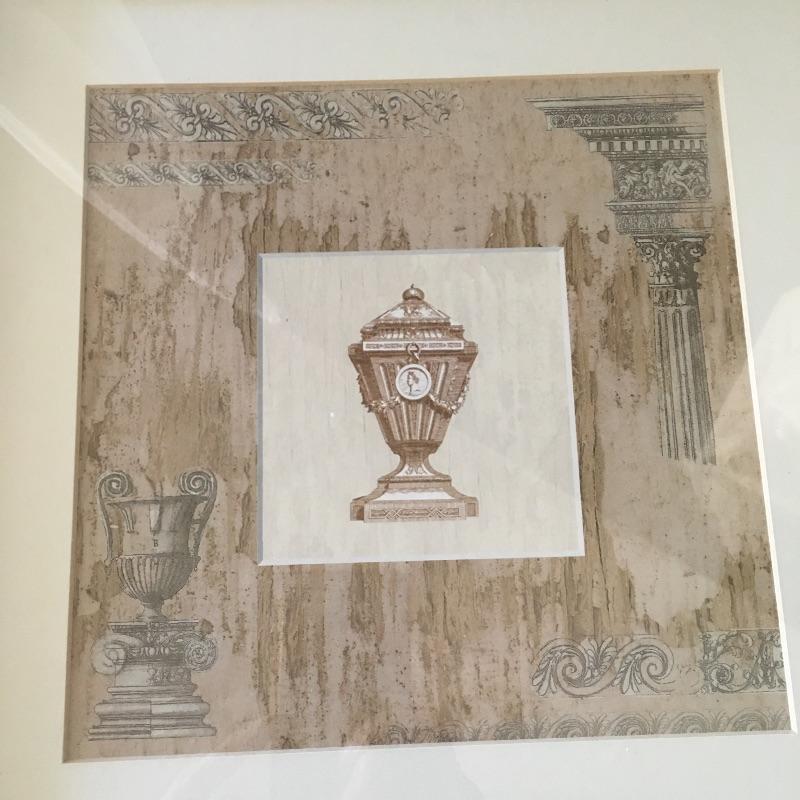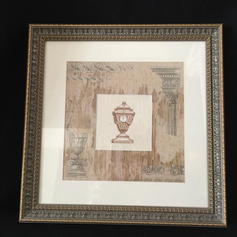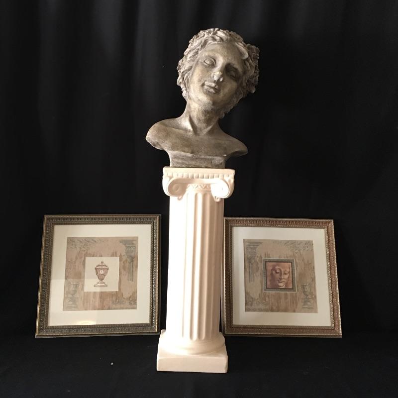 This array of Roman style decor will make you think you are in the colosseum. Lot includes two framed and matted prints, bust and a column, bust and column appear to be resin. Column measures 6.75” x 6.75” x 20”.
