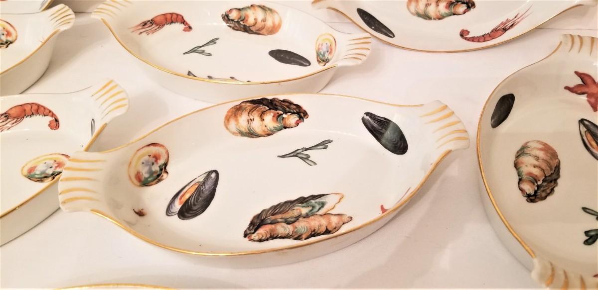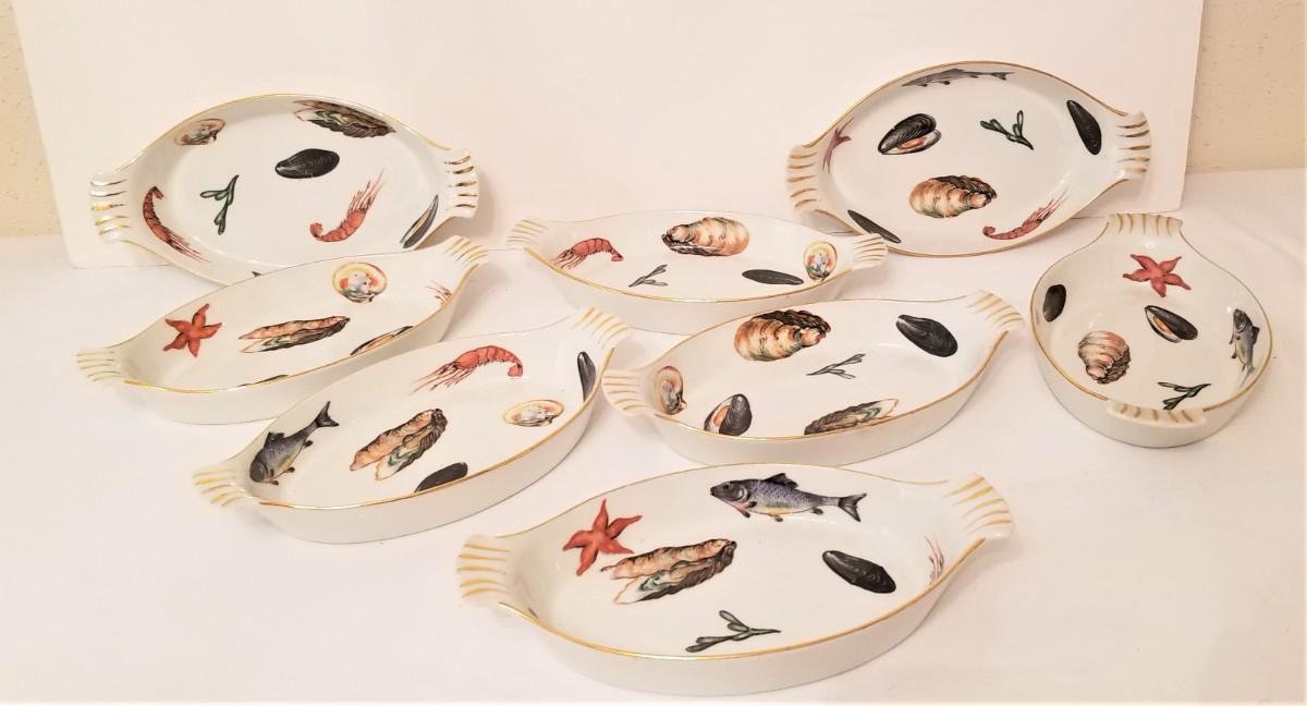 Set of 8 vintage (retired) ramekins with a seafood theme - French porcelain. Good vintage condition - each one measures 9.25" x 5".