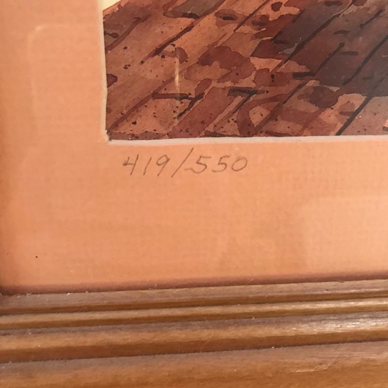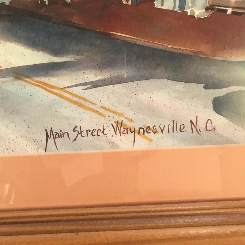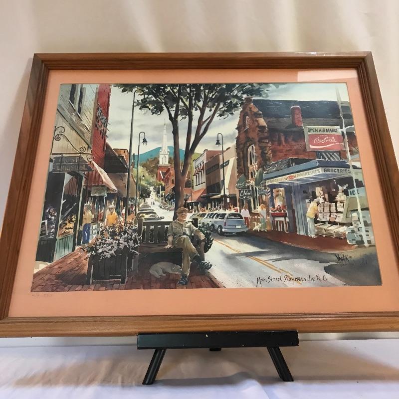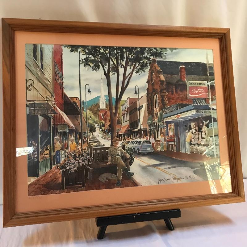 Bold and colorful piece of art featuring downtown Waynesville. Ann Vasilik uses the perfect colors and strokes to capture the life of the town. It appears Vasilik has also signed and numbered the replica 419/550, the matting states the same. Frame is in great shape, measuring 27” x 22” with nice detailing in the corners. See photos. Shipping available. Please call UPS with dimensions at 828-252-6930 for a shipping quote prior to bidding.