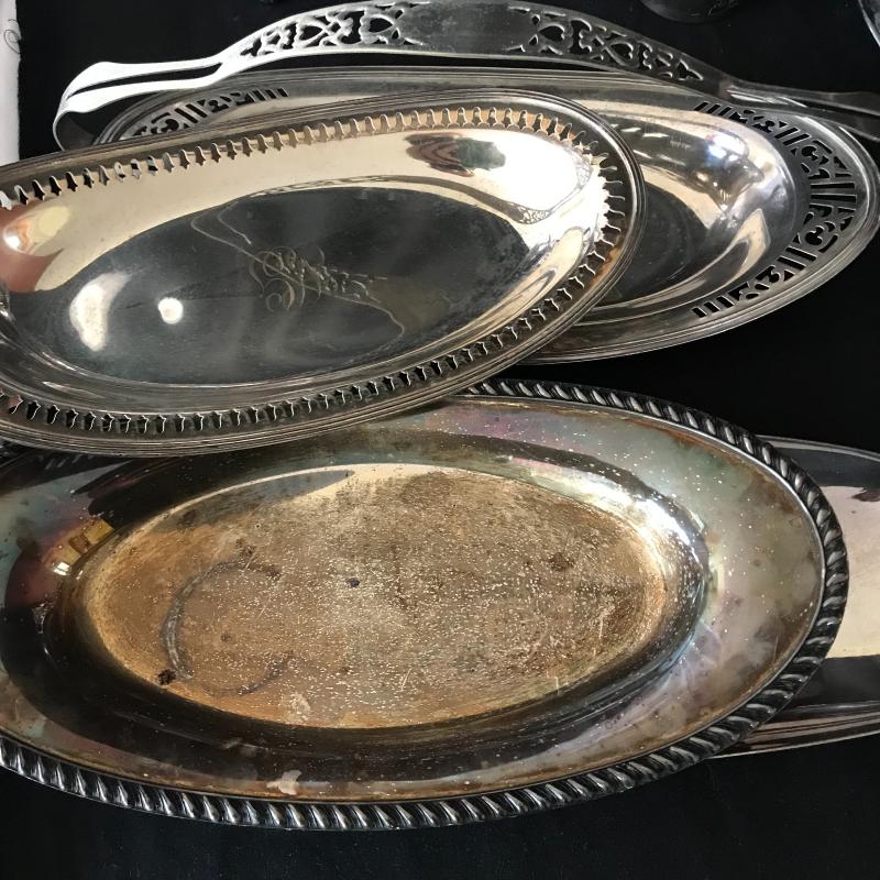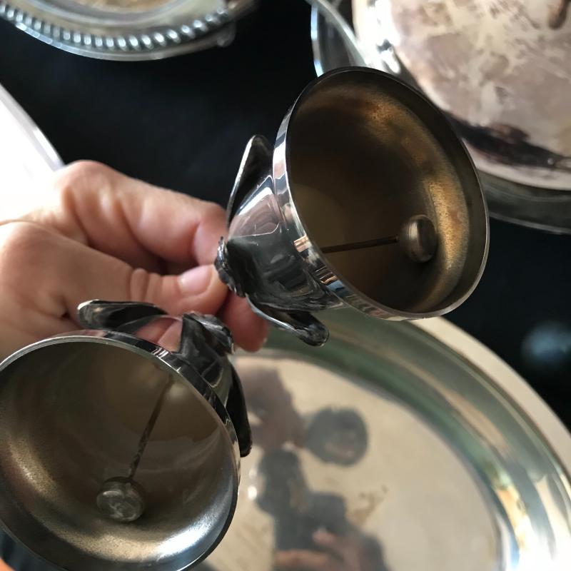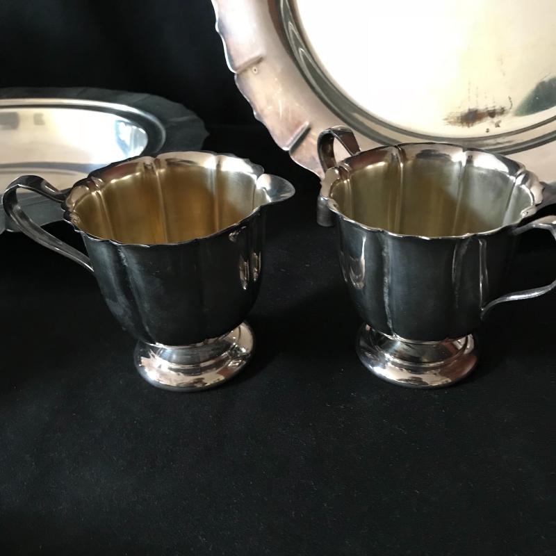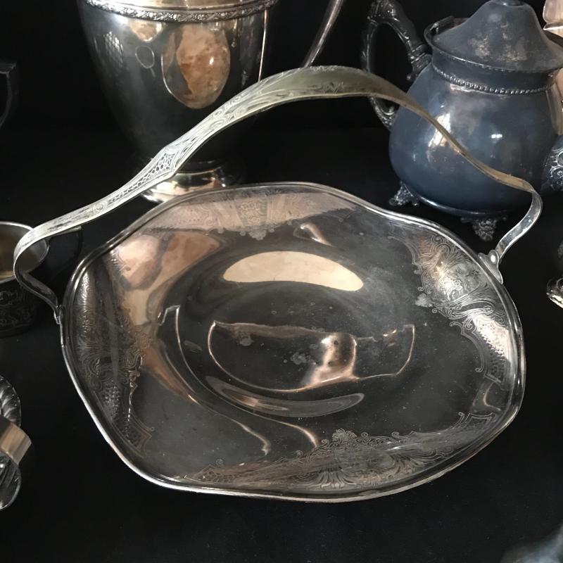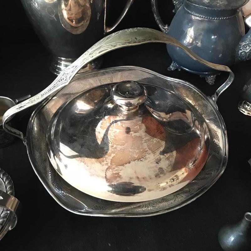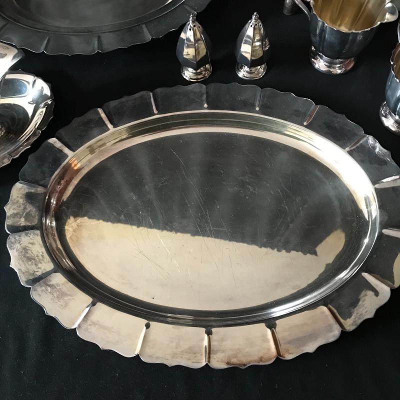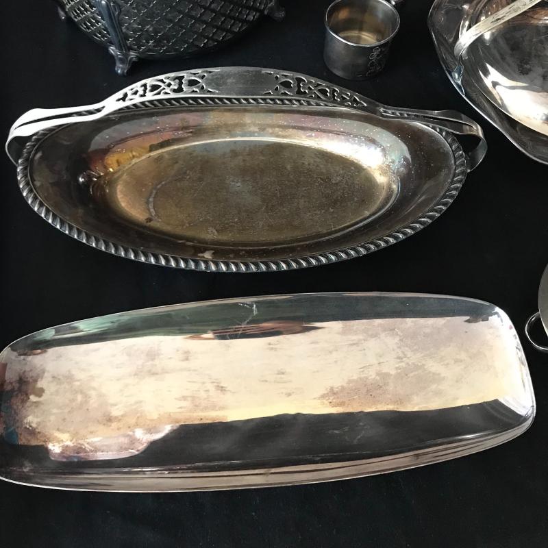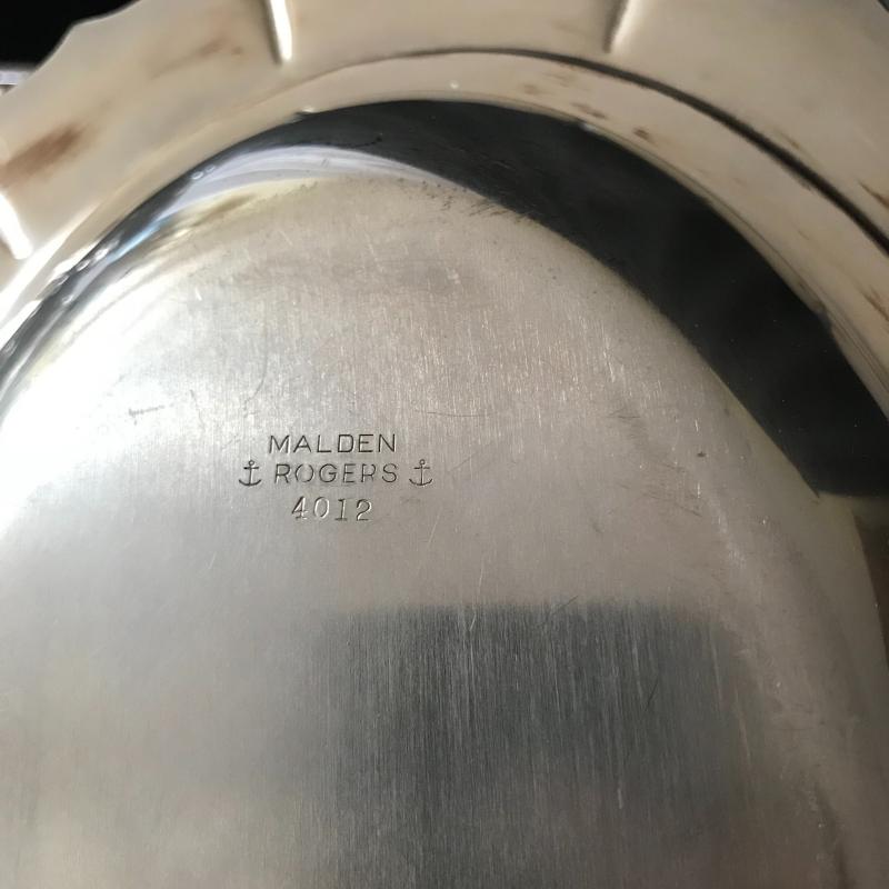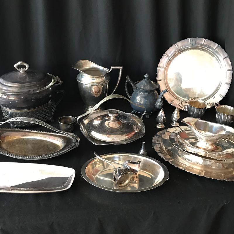 This large lot of Silver Plate servingware includes everything you need for your next formal dinner party including platters, gravy boat, salt and pepper shakers, creamer and sugar bowl, Mickey Mouse baby cup, decorative dinner bells and more. Several matching pieces are marked “Malden Rogers.” See pics. Local pickup only.
