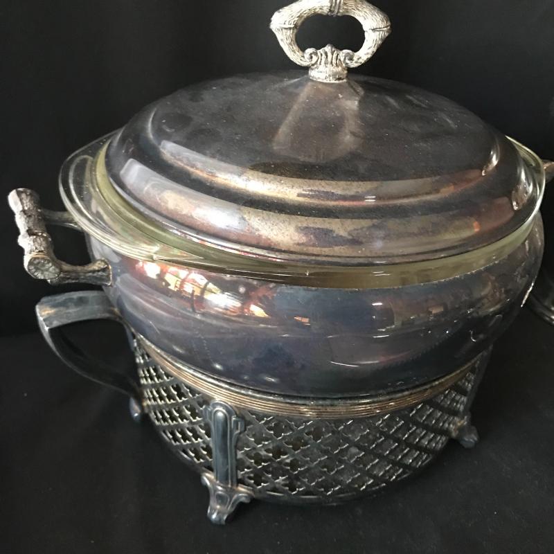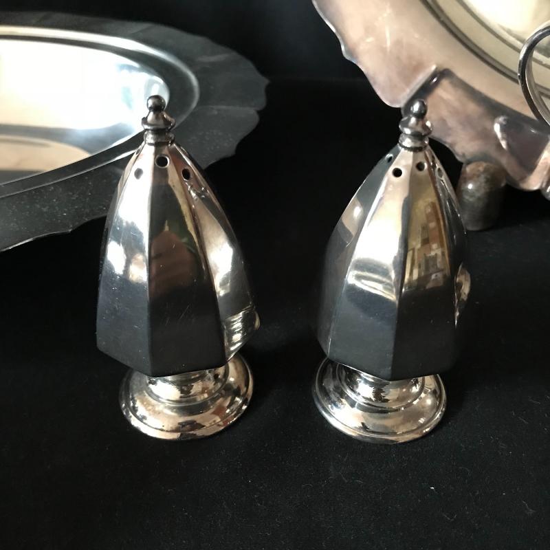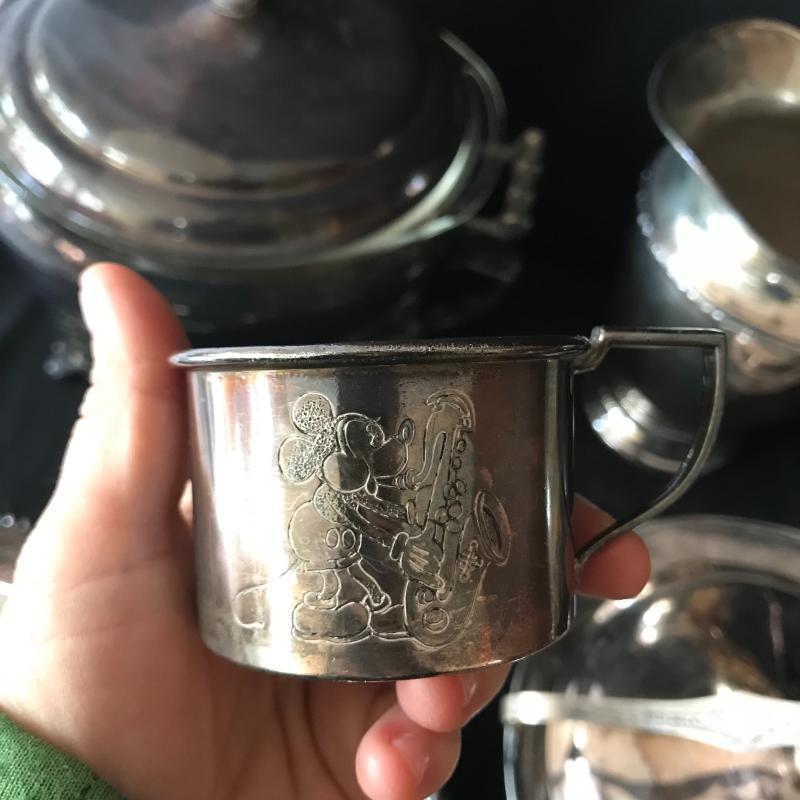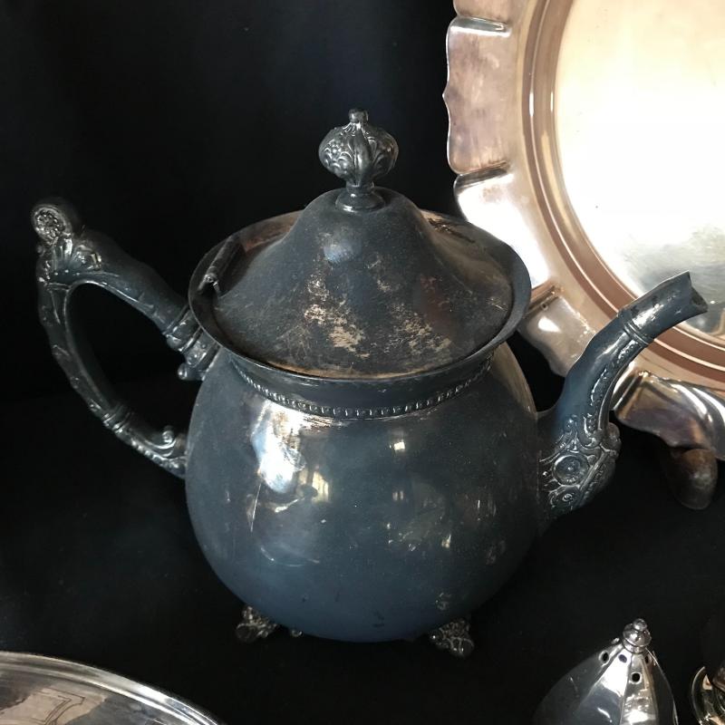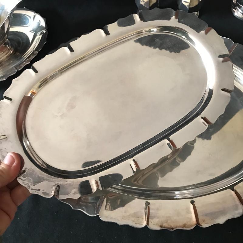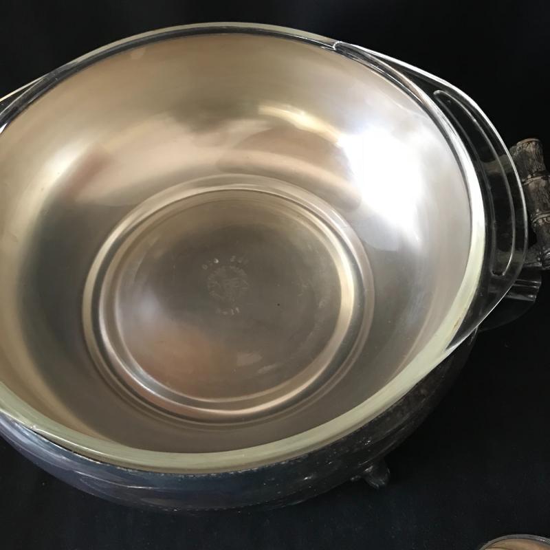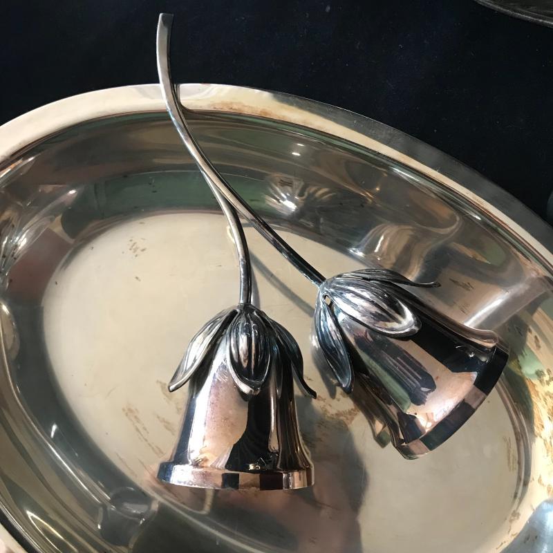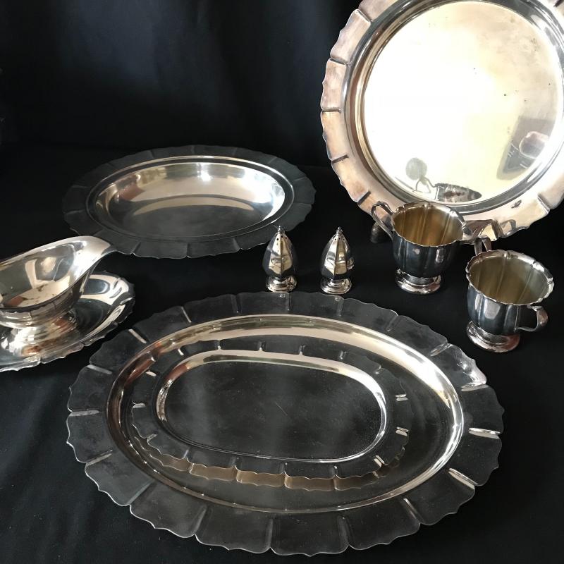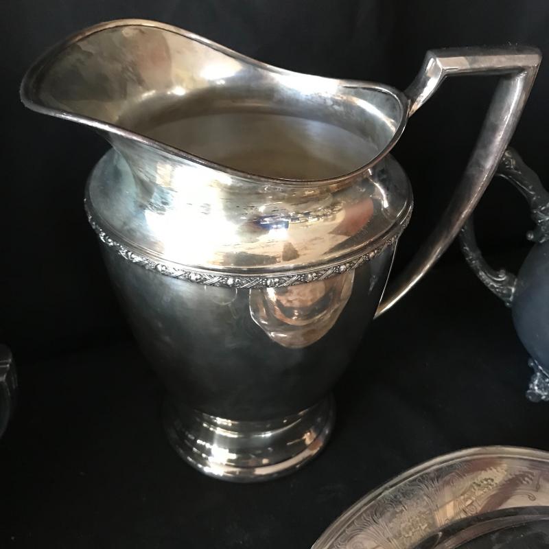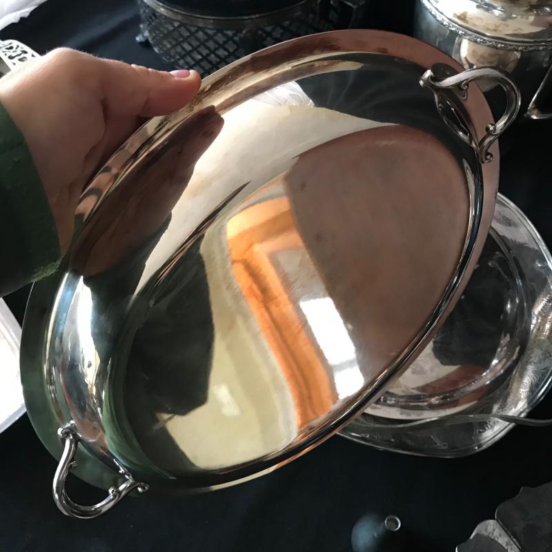 This large lot of Silver Plate servingware includes everything you need for your next formal dinner party including platters, gravy boat, salt and pepper shakers, creamer and sugar bowl, Mickey Mouse baby cup, decorative dinner bells and more. Several matching pieces are marked “Malden Rogers.” See pics. Local pickup only.
