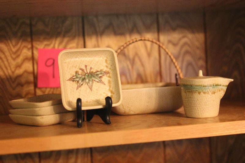 Lot 93 Stoneware Basket w/ Bamboo Handles w/ Set of Sauce Plates