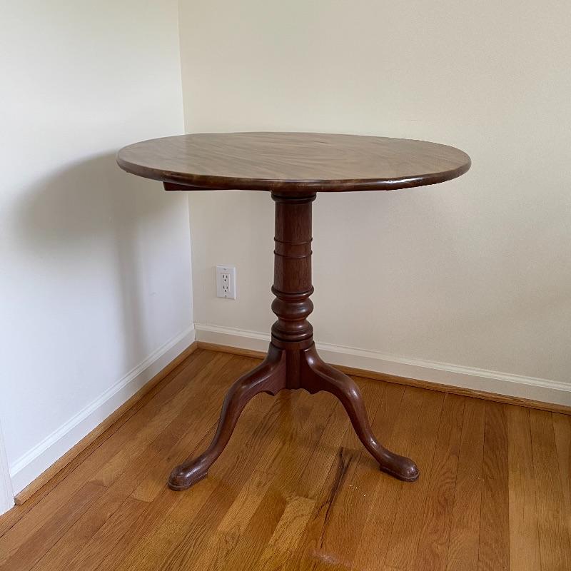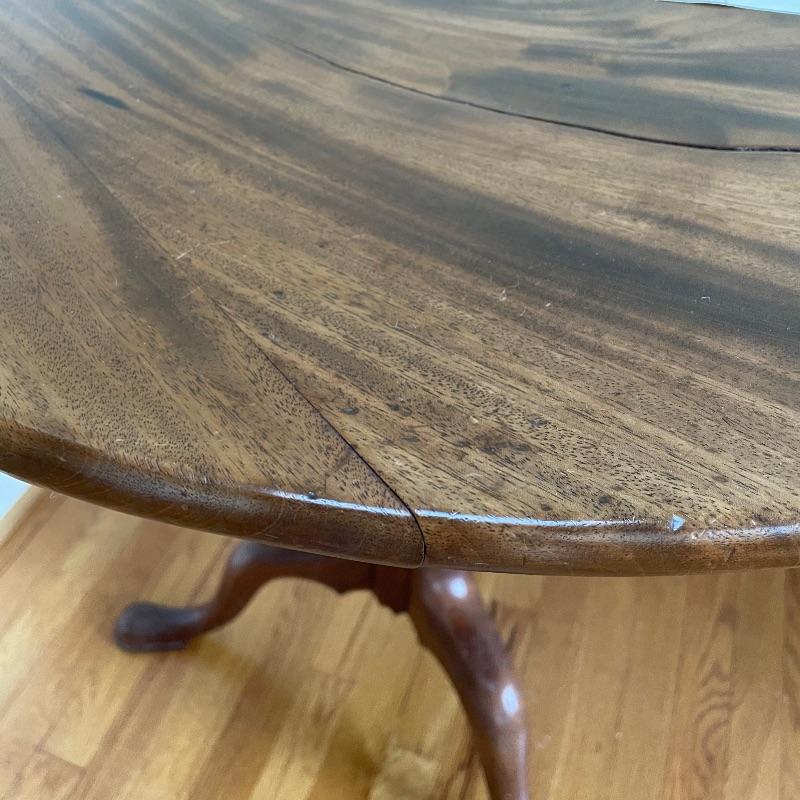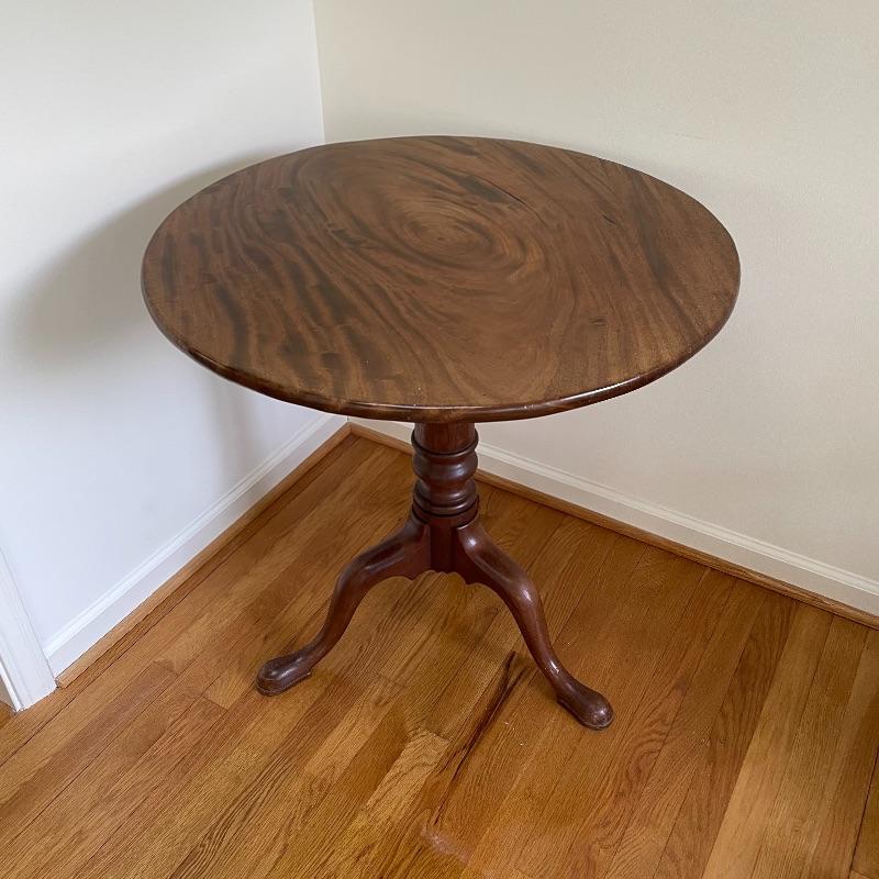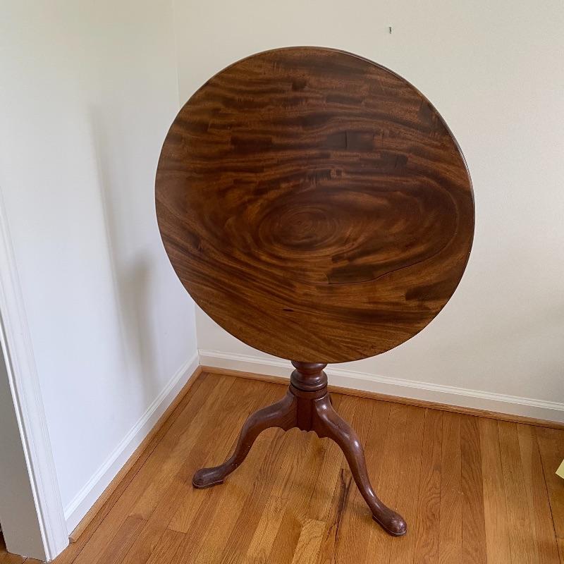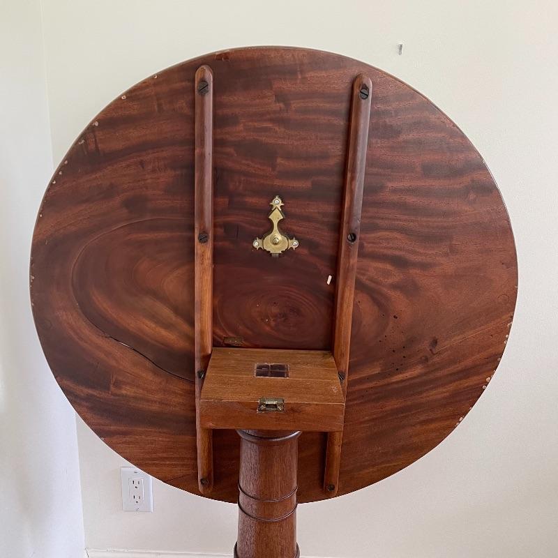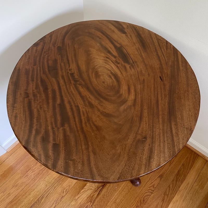 This stunning tilt-top table is what you need in your home. Paperwork found in the home describes this beautiful piece as “Swirled Mahogany English, Circa 1780”. If this table is the age stated, it has probably been refinished, as it is in amazing condition. The hardware latching on the table appears newer as well. This tilt-top table is the perfect mix of light and dark browns in an attractive swirl wood grain. Table has a 30” diameter and is 30” tall. There are just a couple points of separation, each noted in images and in no way change the charm of this table. Underside of table top also has a shim, possibly to keep level. Local pick up only.