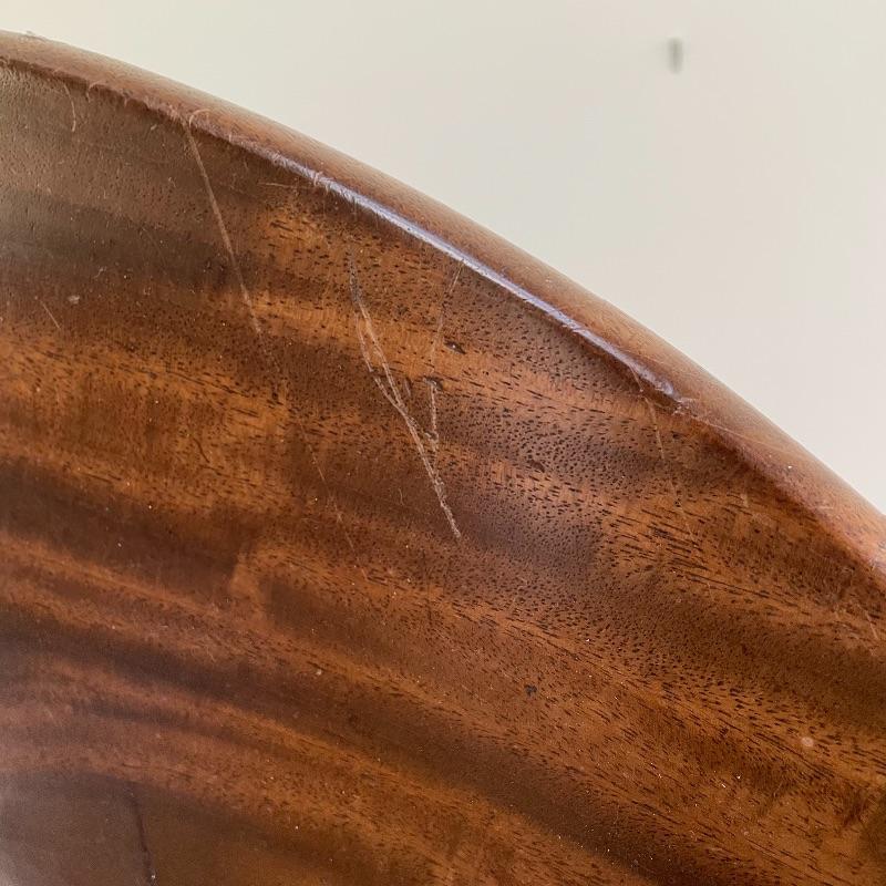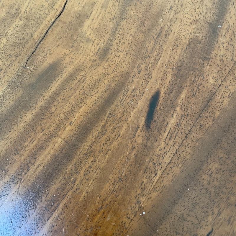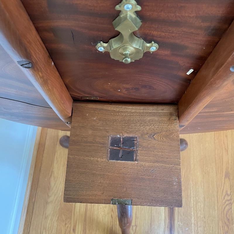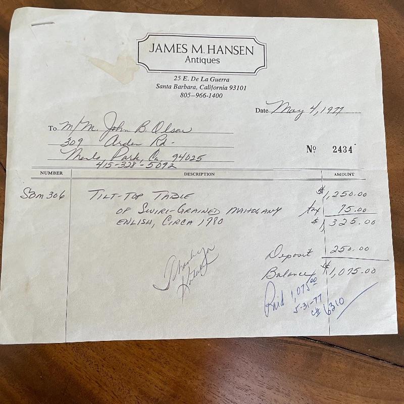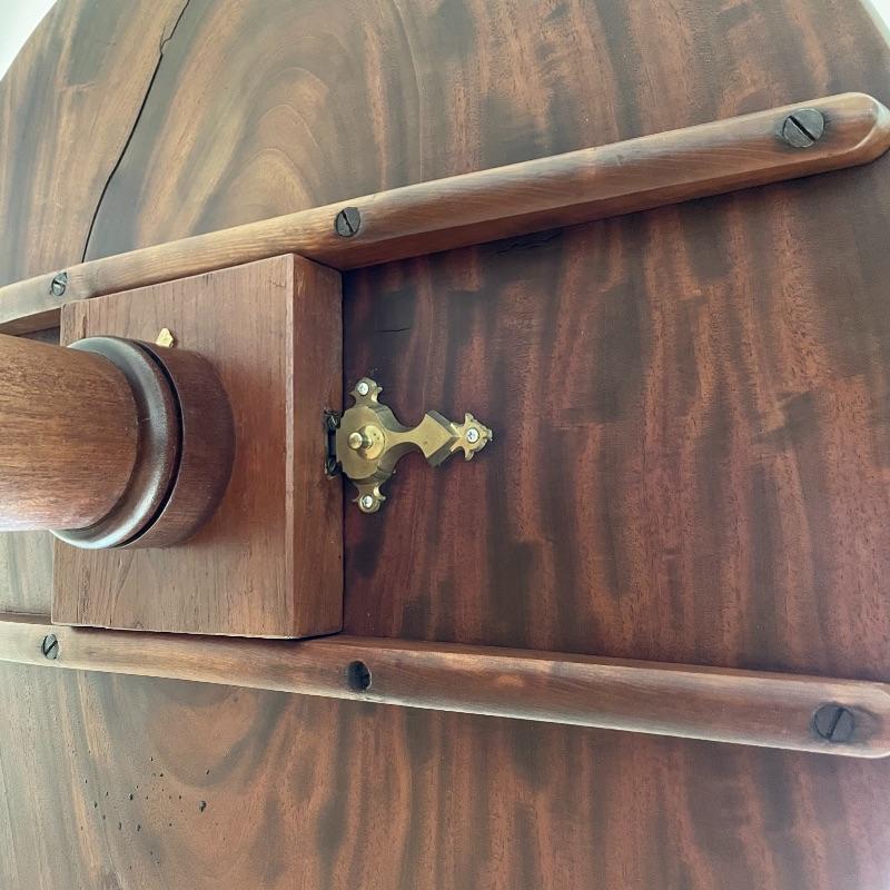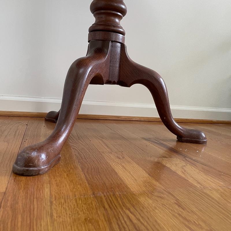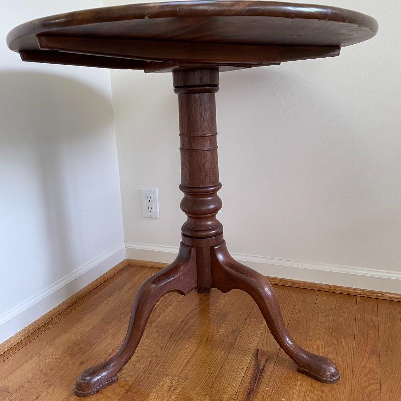 This stunning tilt-top table is what you need in your home. Paperwork found in the home describes this beautiful piece as “Swirled Mahogany English, Circa 1780”. If this table is the age stated, it has probably been refinished, as it is in amazing condition. The hardware latching on the table appears newer as well. This tilt-top table is the perfect mix of light and dark browns in an attractive swirl wood grain. Table has a 30” diameter and is 30” tall. There are just a couple points of separation, each noted in images and in no way change the charm of this table. Underside of table top also has a shim, possibly to keep level. Local pick up only.