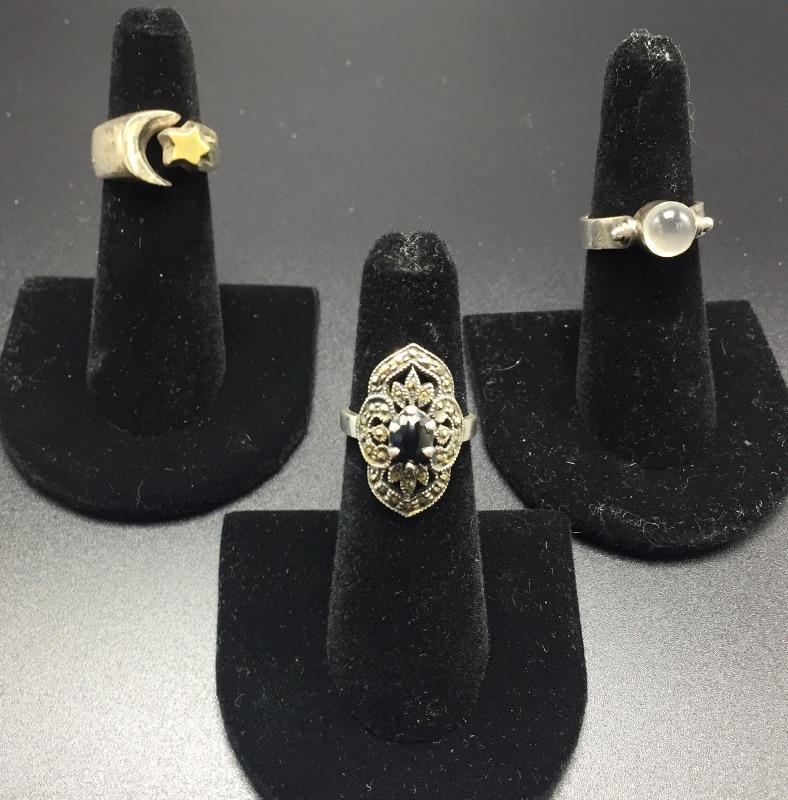 Three beautiful Sterling rings. Two have stones and one has a star and moon shape. See pictures for sizes.