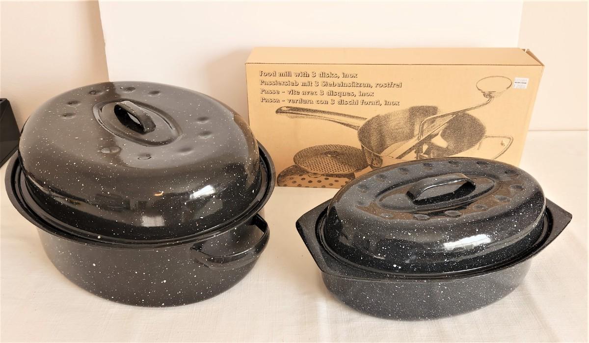 Lot #93 Two Enamel Roasters and a 3 disc Food Mill new in box