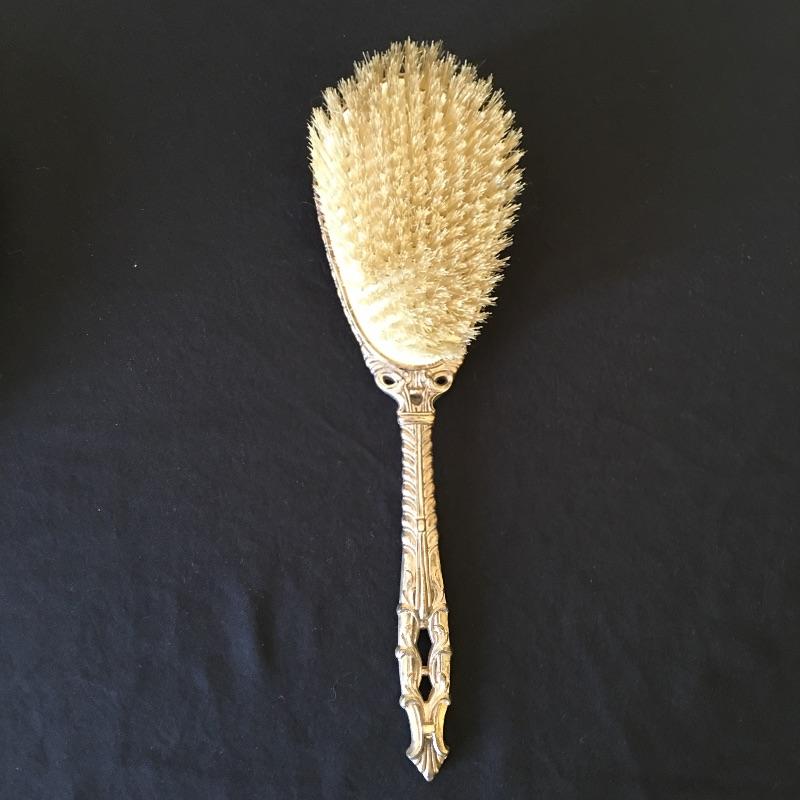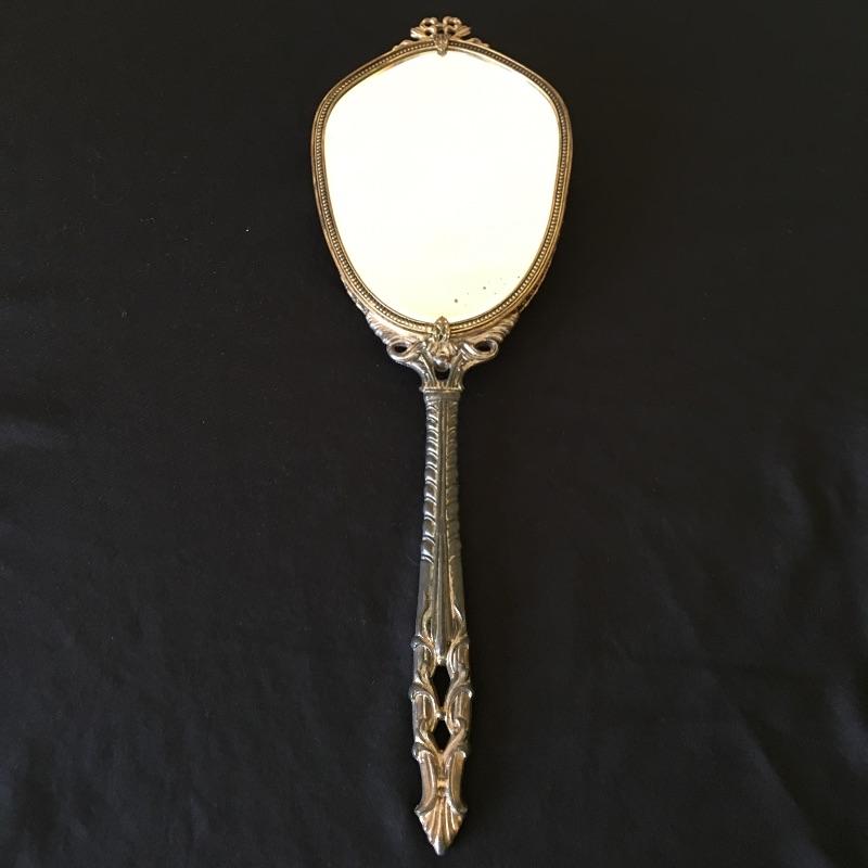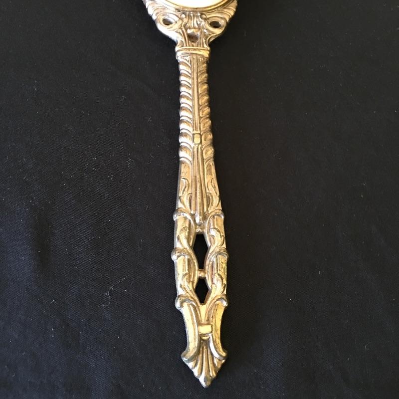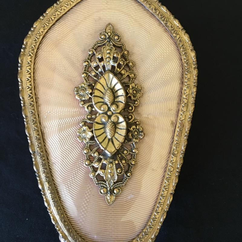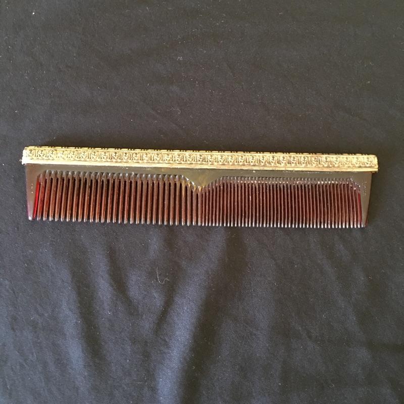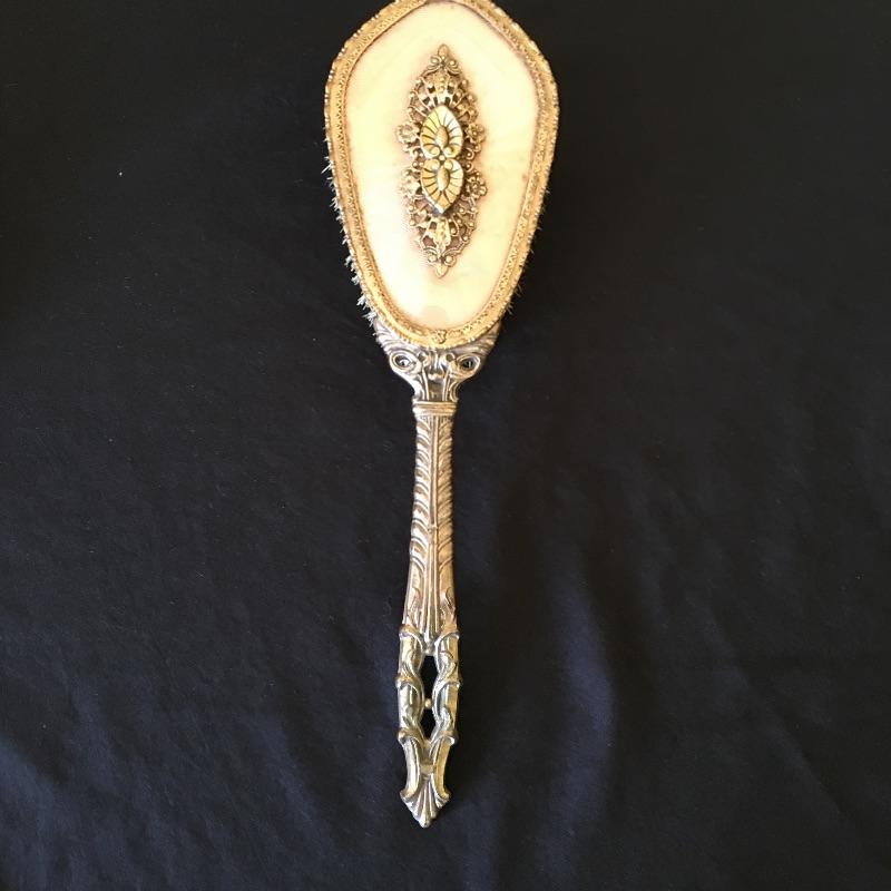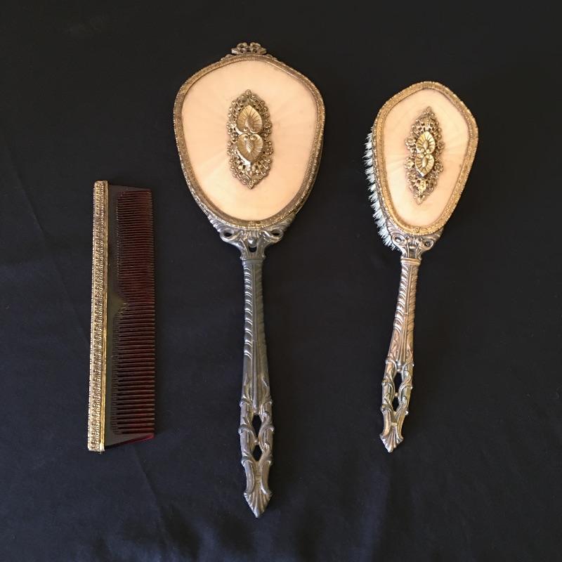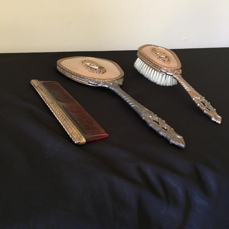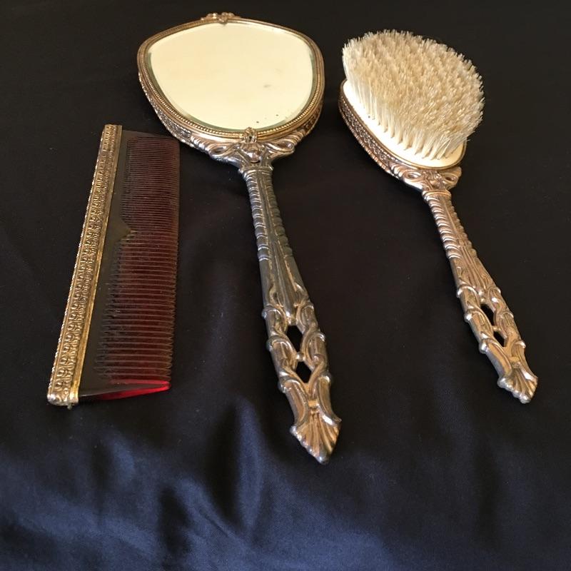 This three piece metal vanity set includes brush, mirror and a comb. Brush and mirror have matching backs. Get ready for a night out with this old school vanity set. Mirror measures 14.5” long.