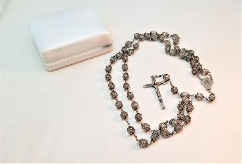 Very nice traditional sterling silver double-capped rosary, dated 1951. About 25" long - traditional bride's gift. Very pretty crucifix on this one.