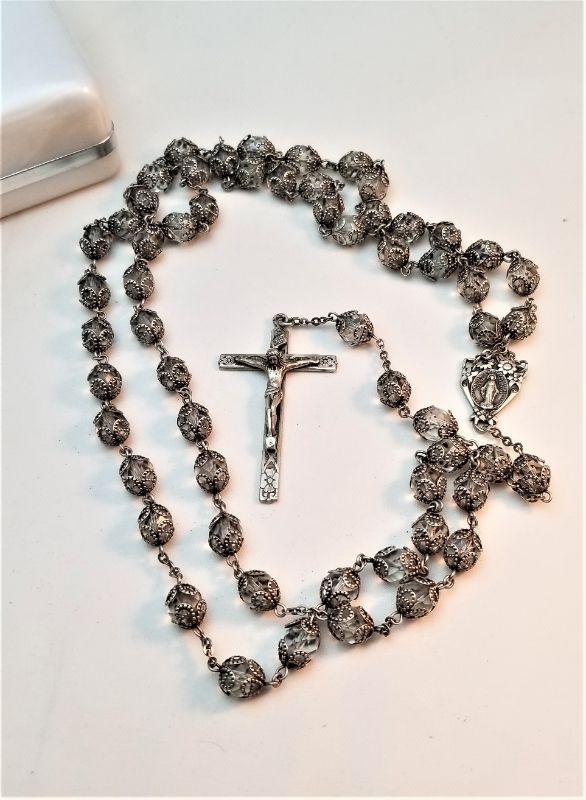Lot #93 Vintage Crystal/Sterling Silver Double Capped Rosary - dated 1951