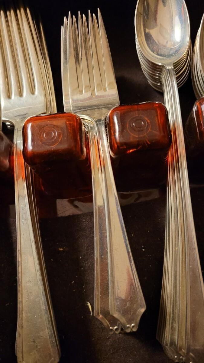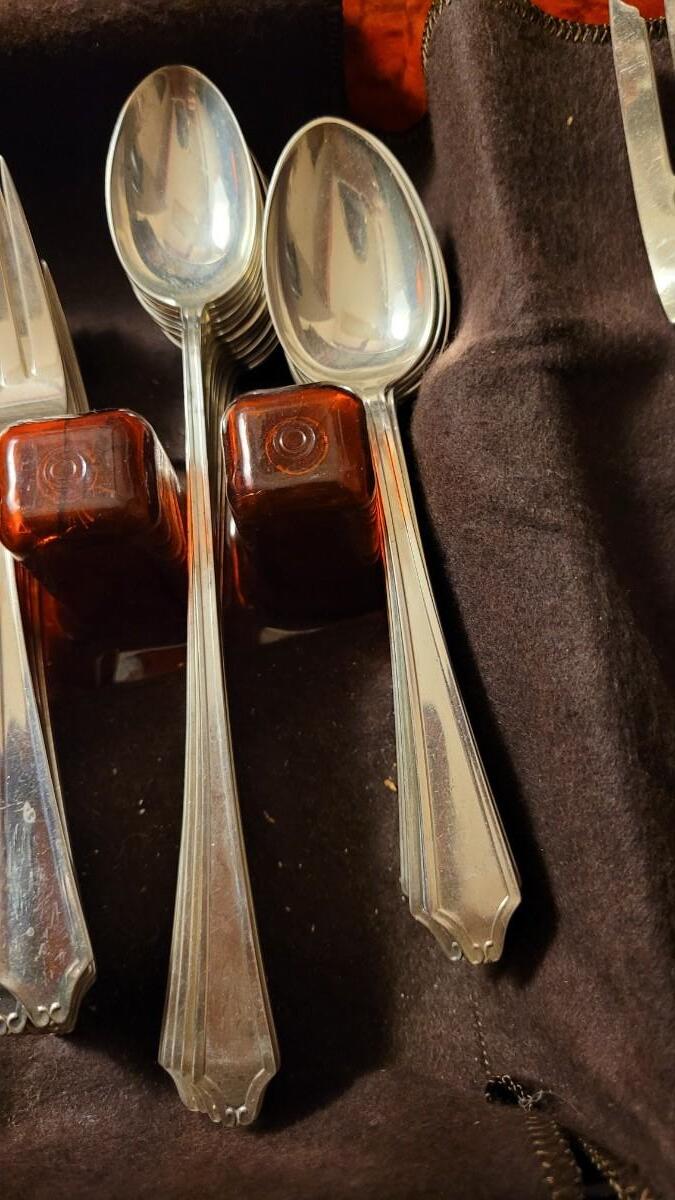 This Vintage INTERNATIONAL Sterling Silver Flatware Set (12 person) totals 65 Actual Pieces after the accessories are included. The Forks are 7.75" and 6". The spoons are 7 3/8" and 5 3/4". The (2) Slotted Ladle Spoons are about 5 7/8". The (2] Grapefruit Spoons are 6.25". The Large Fancy Serving Fork is 7.25". A fine set that is unpolished but could easily be used for the upcoming Christmas gatherings. The knives are of course a Stainless Steel Blade. The Vintage clear orange heavy plastic organizer (Mid Century Modern) is included along with the lint free storage cloth shown.