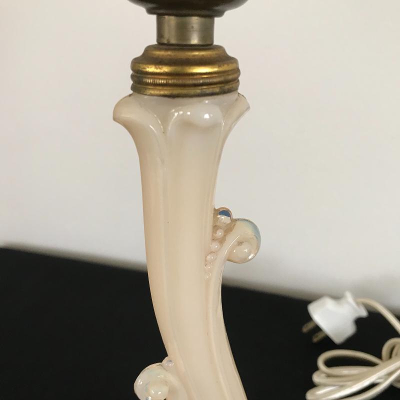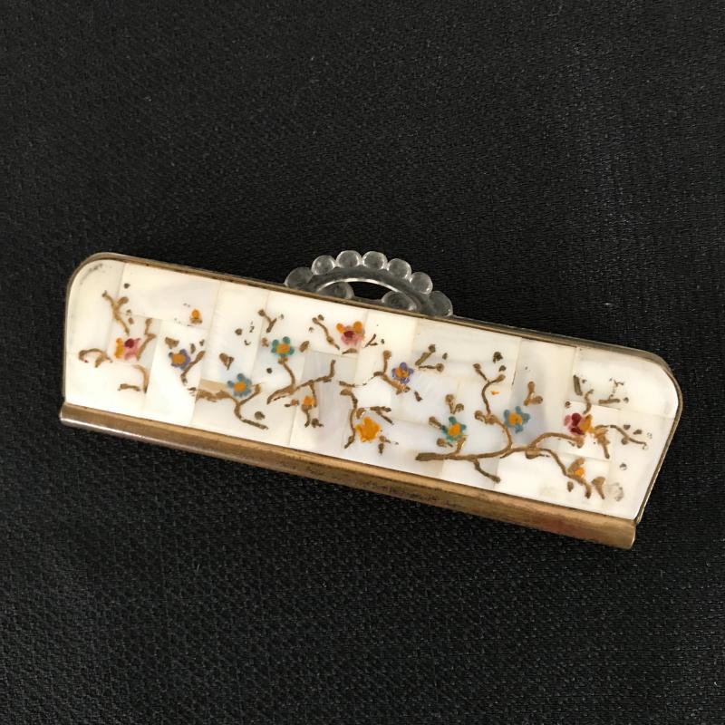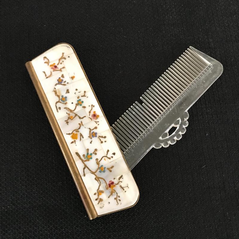This fancy lot includes a small glass lamp (approx. 12” tall), plastic comb in beautiful painted pearl case with mirror, and small lidded pill box. No shipping available. Local pickup only in Asheville, NC.