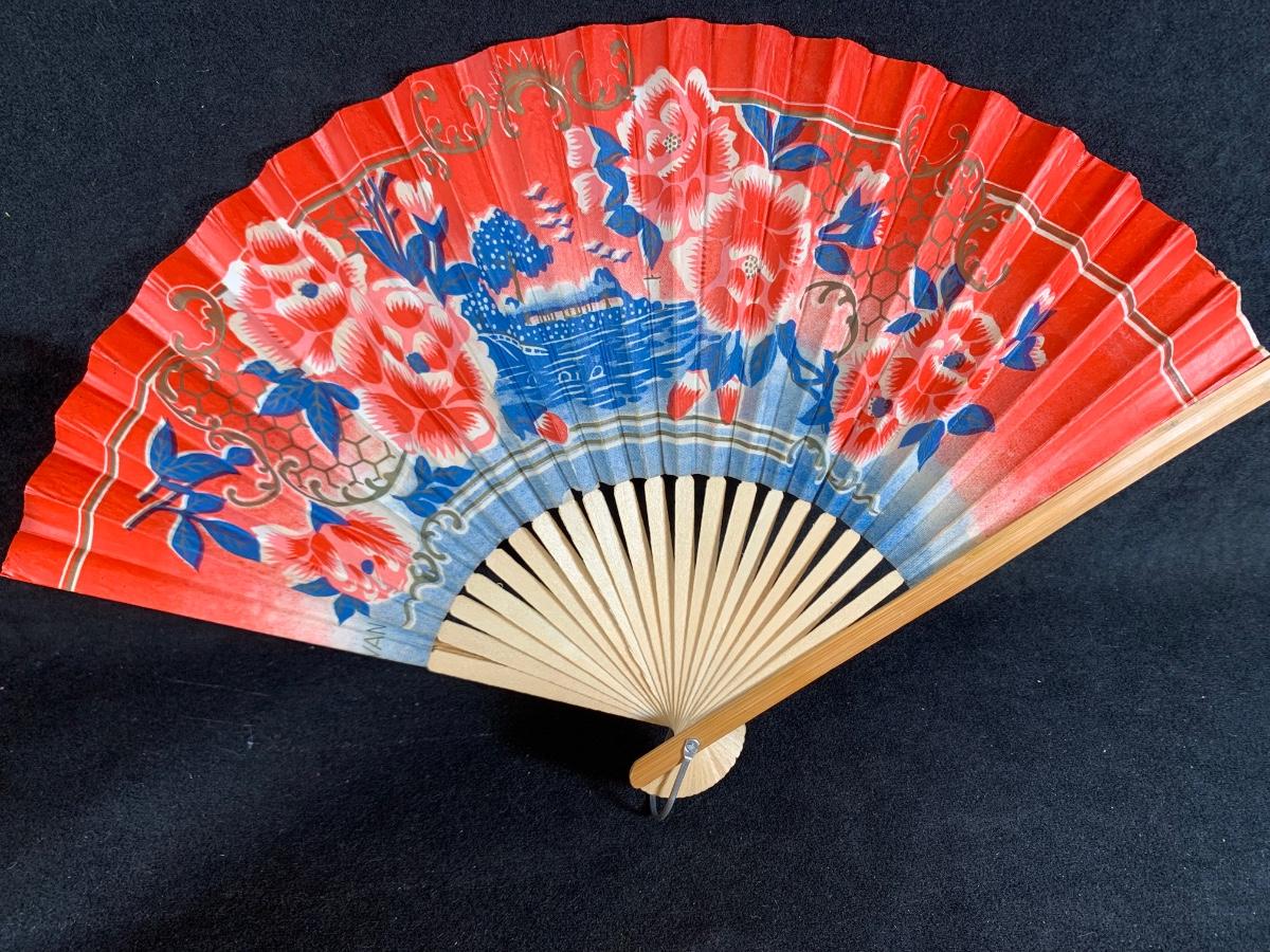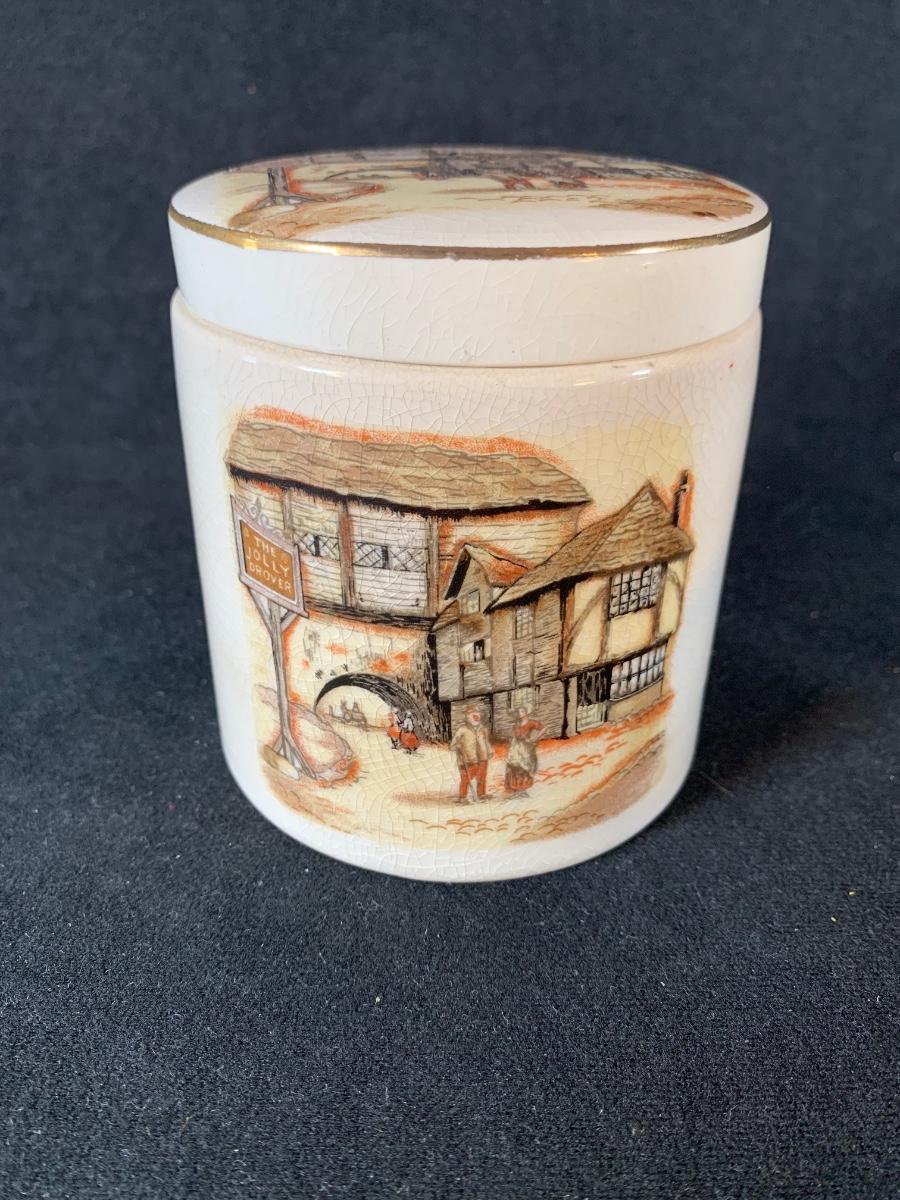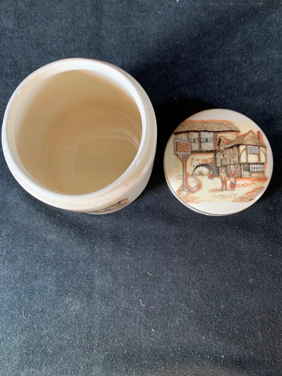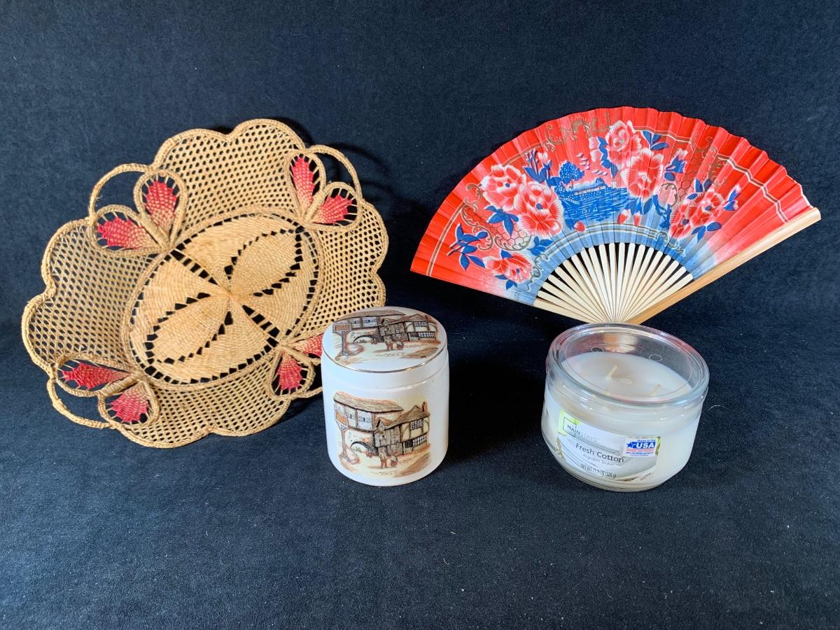 Lot includes Vintage Sandland Ware Oxford Marmalade Jar "The Jolly Drover", Imperial Palace hand fan, fresh cotton candle and a antique basket