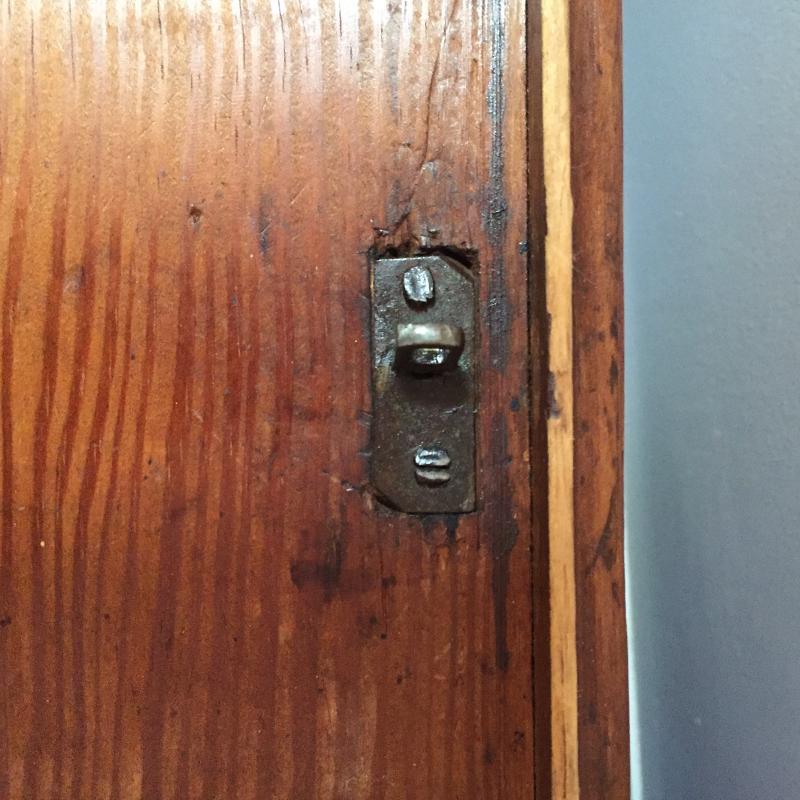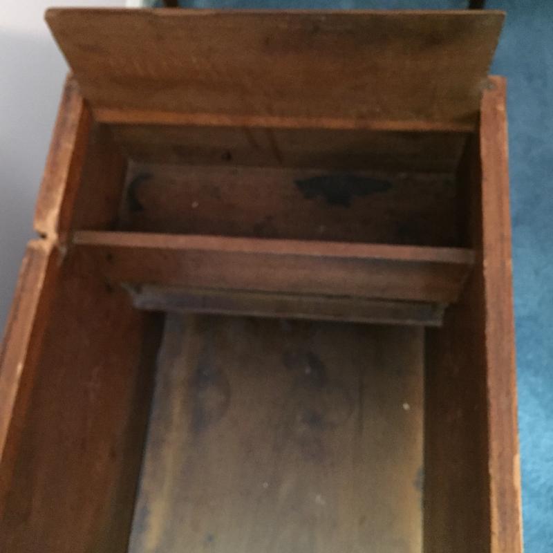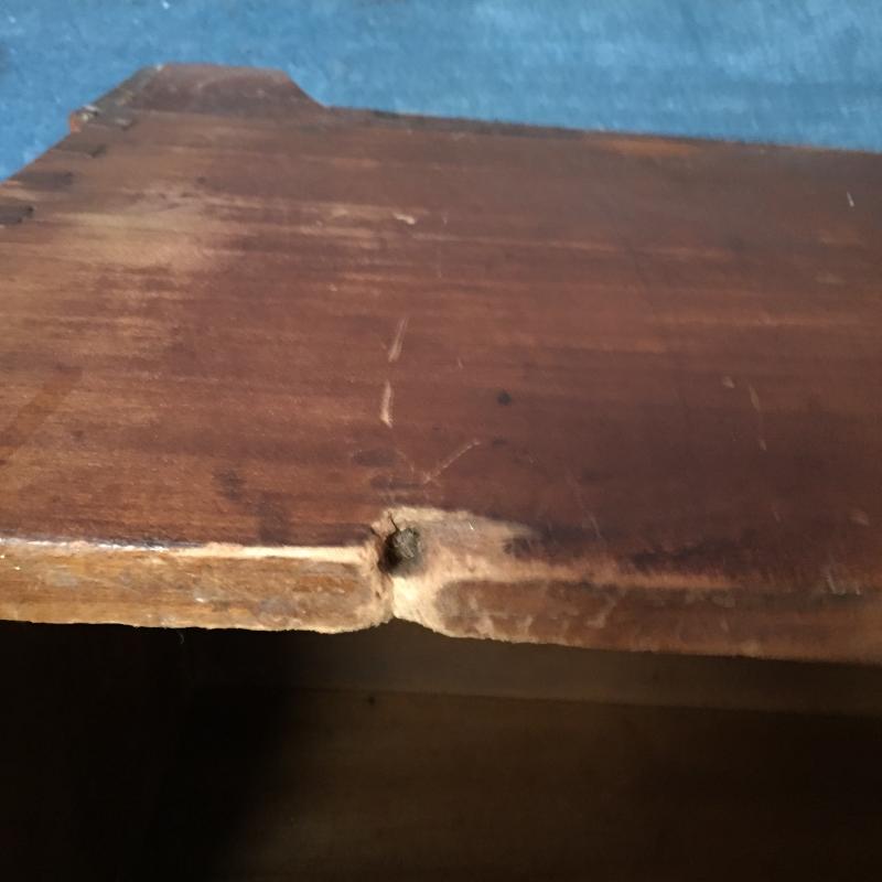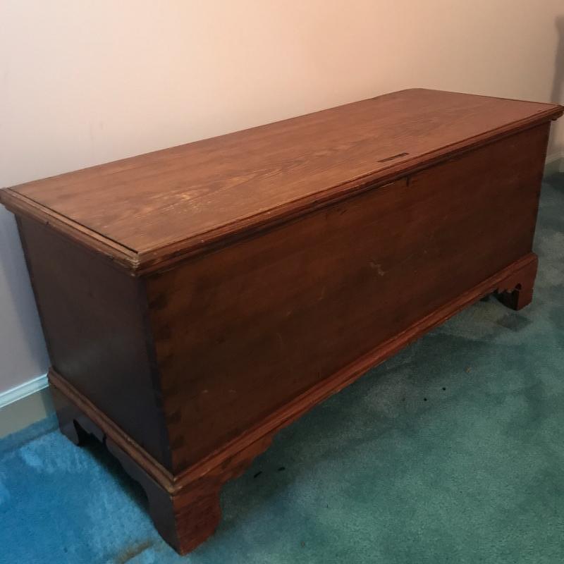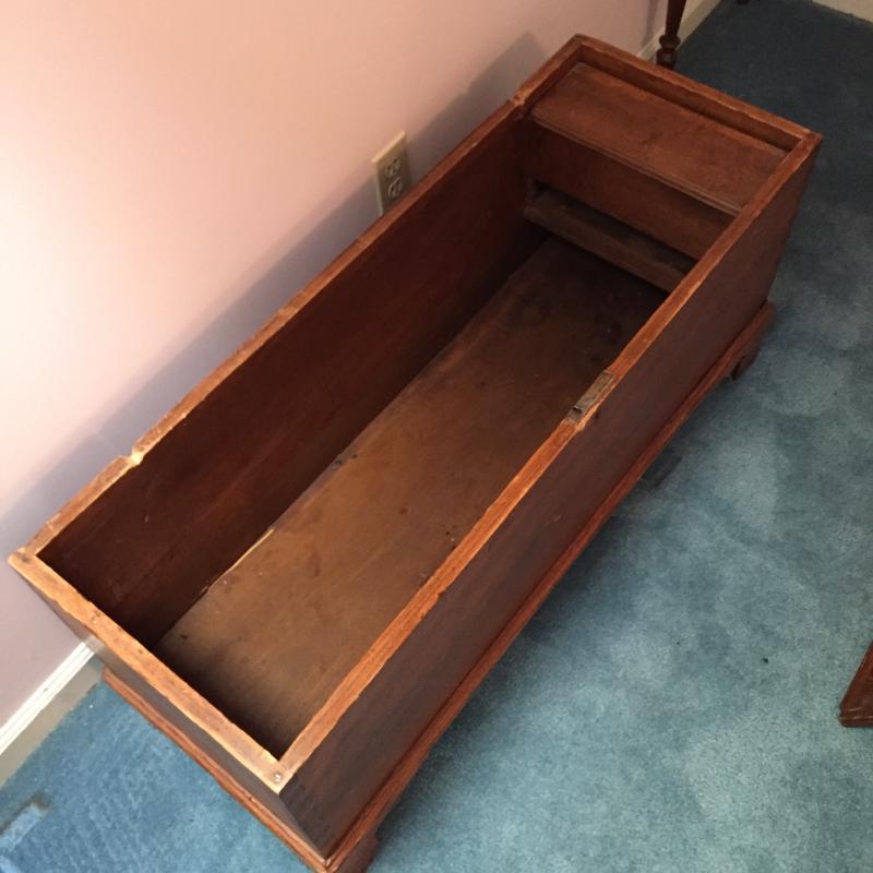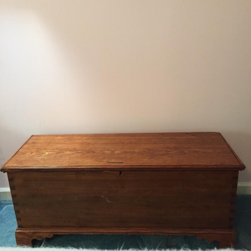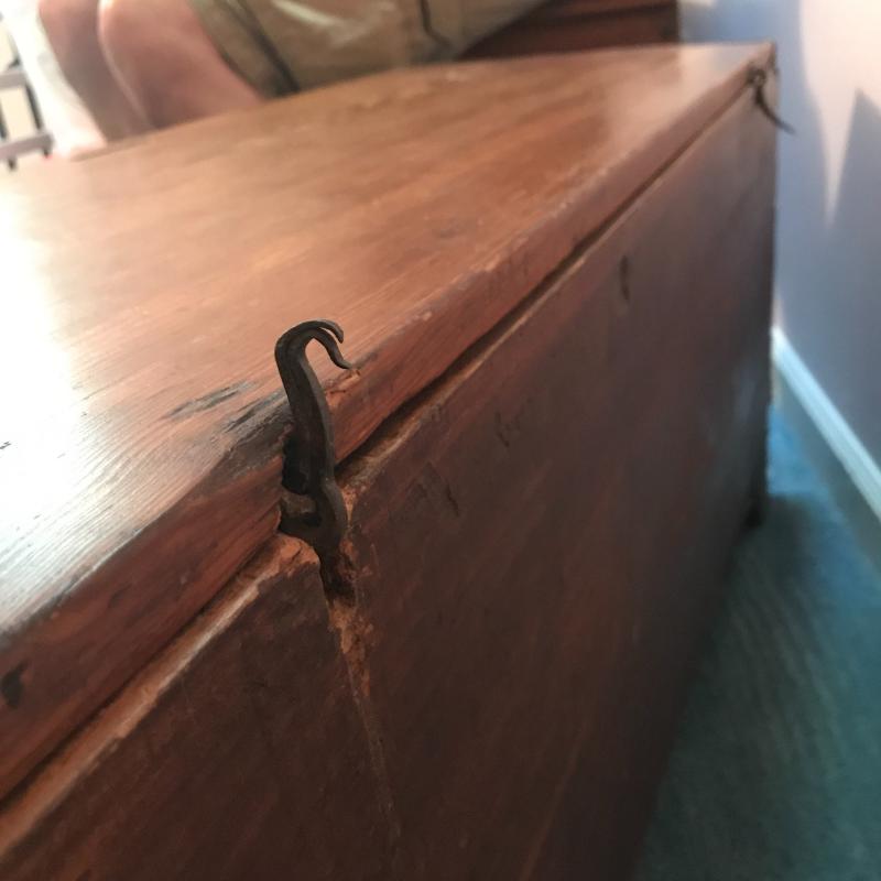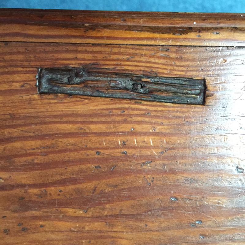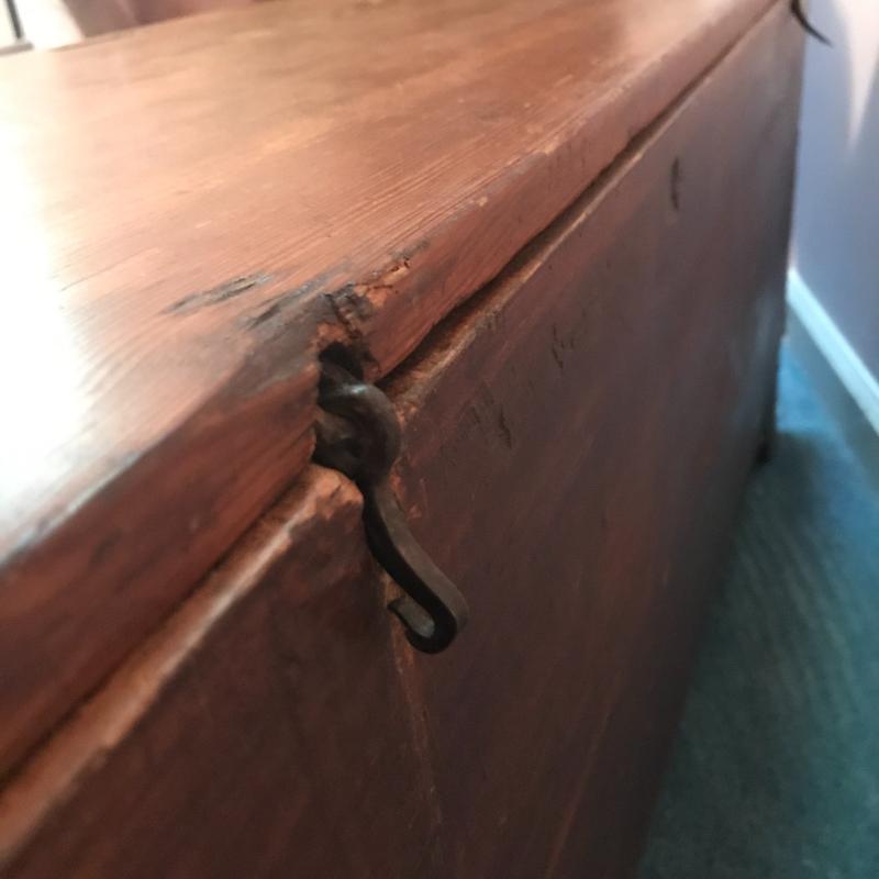 Lovely Wooden Trunk With Dovetail Joints. The Top is not attached to trunk because hinges can not attach to the holes. See photos. Normal wear on wood for age of trunk. Trunk Measures 15”x41.5”x18.5”