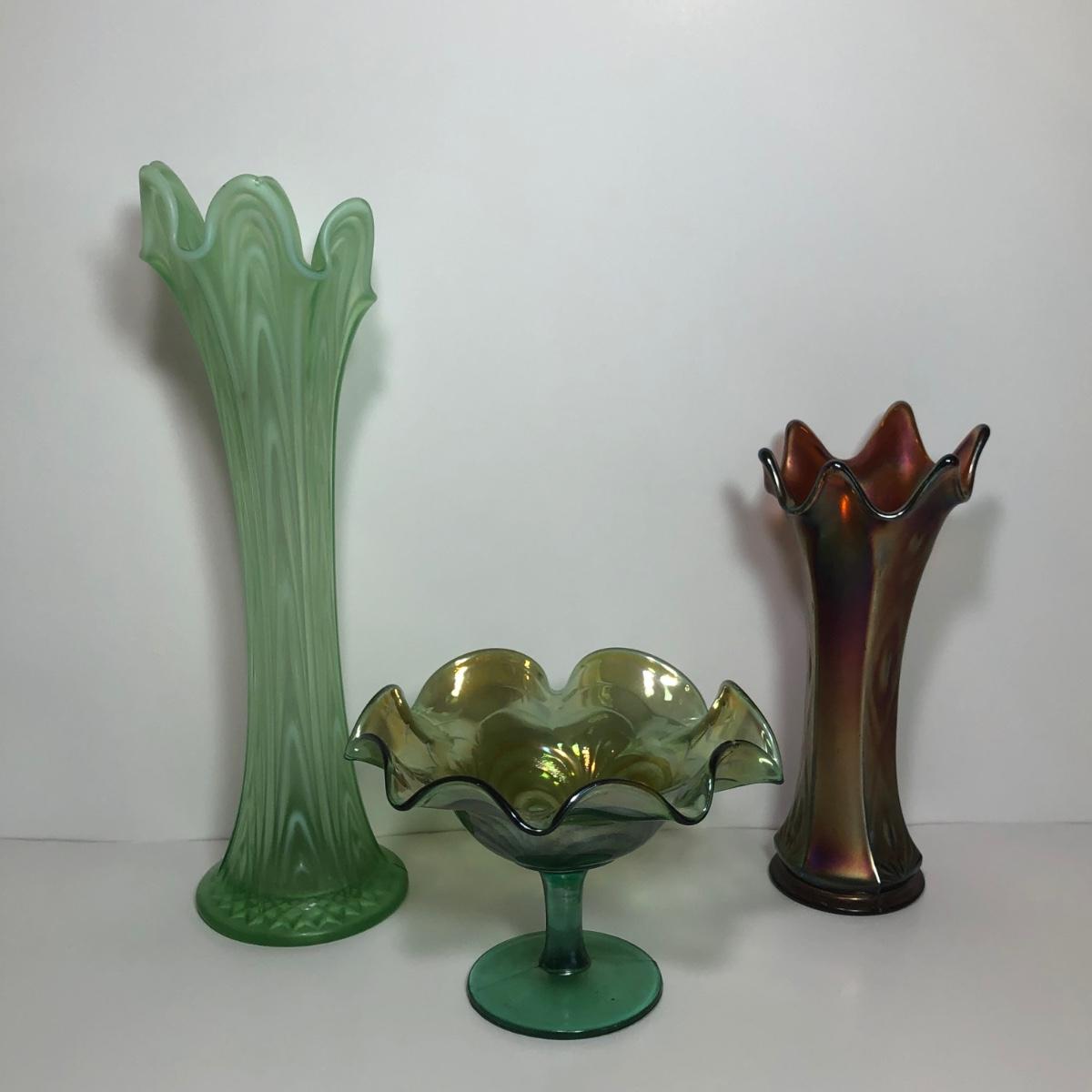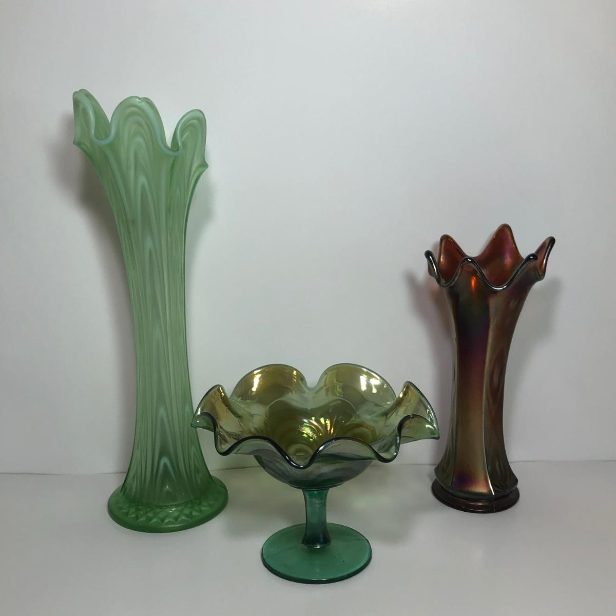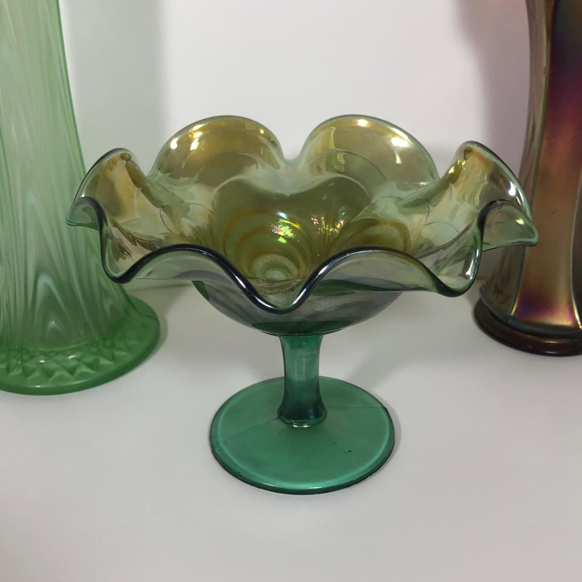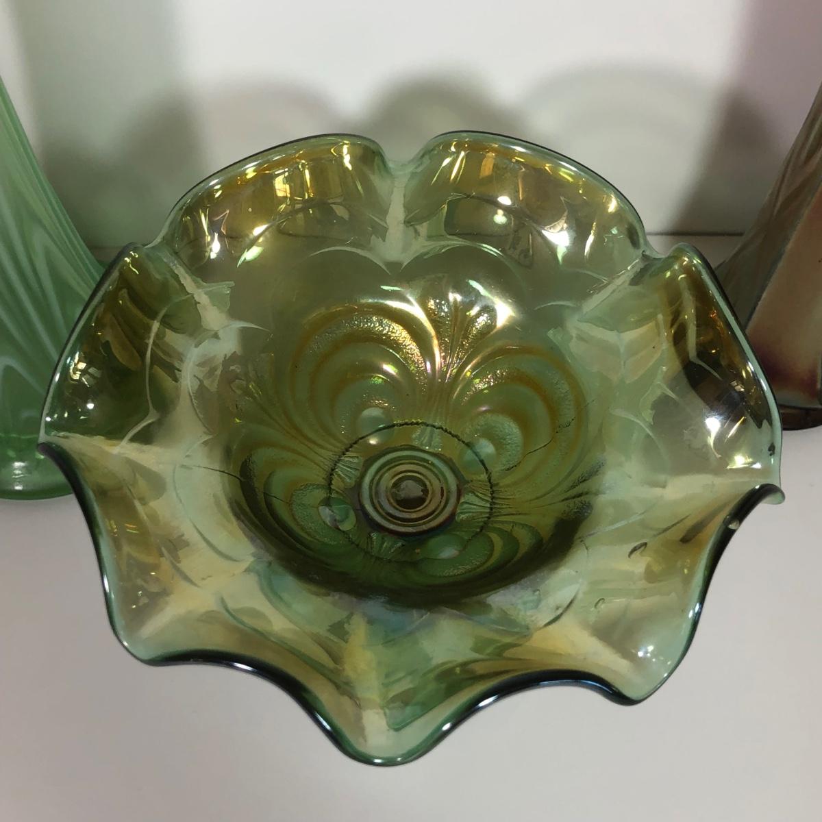 LOT 29M: Vintage Green Opalescent Glass Vase, Vintage Iridescent Purple Carnival Glass Art Deco Vase & Avocado Glass Candy Dish