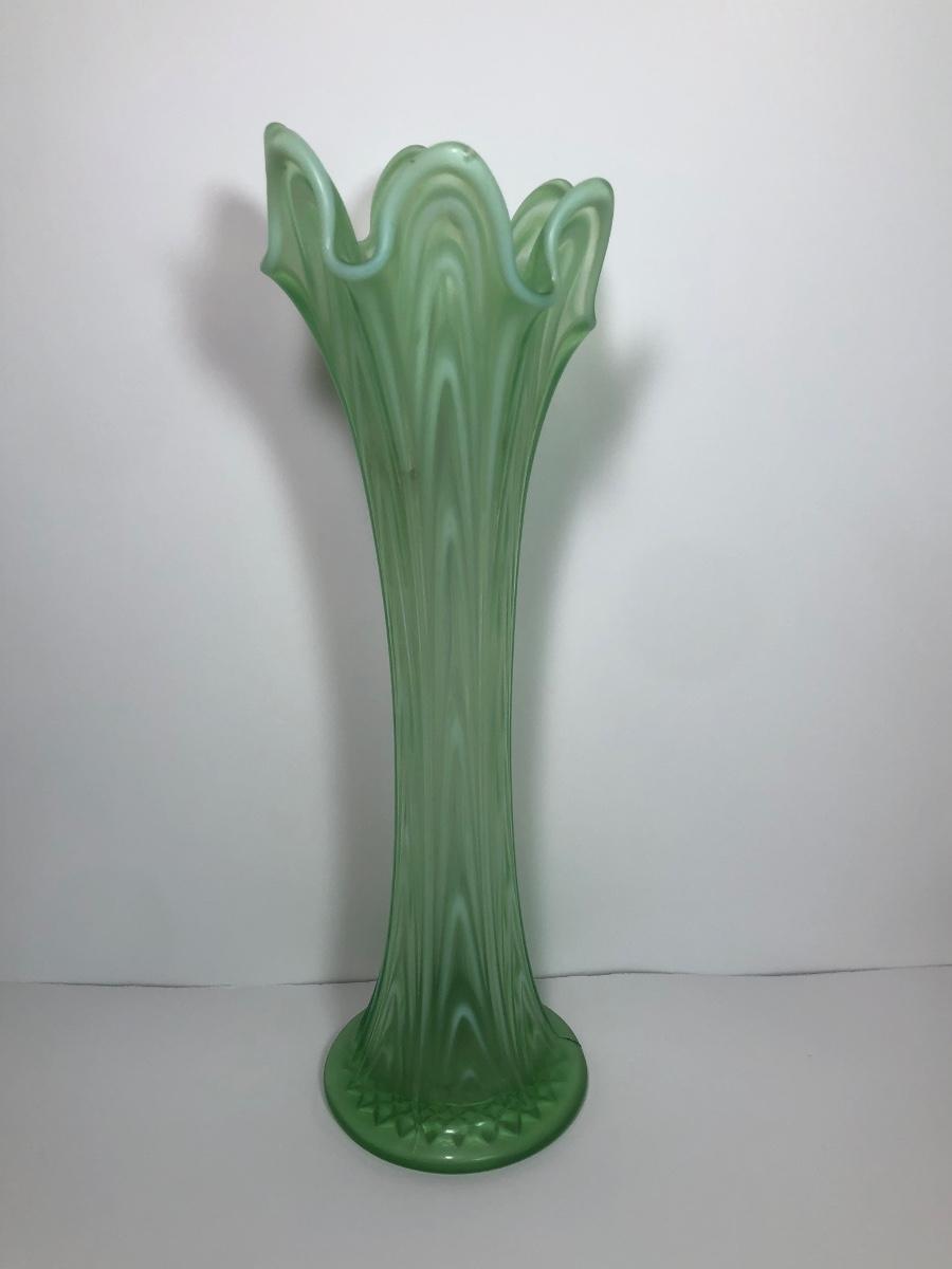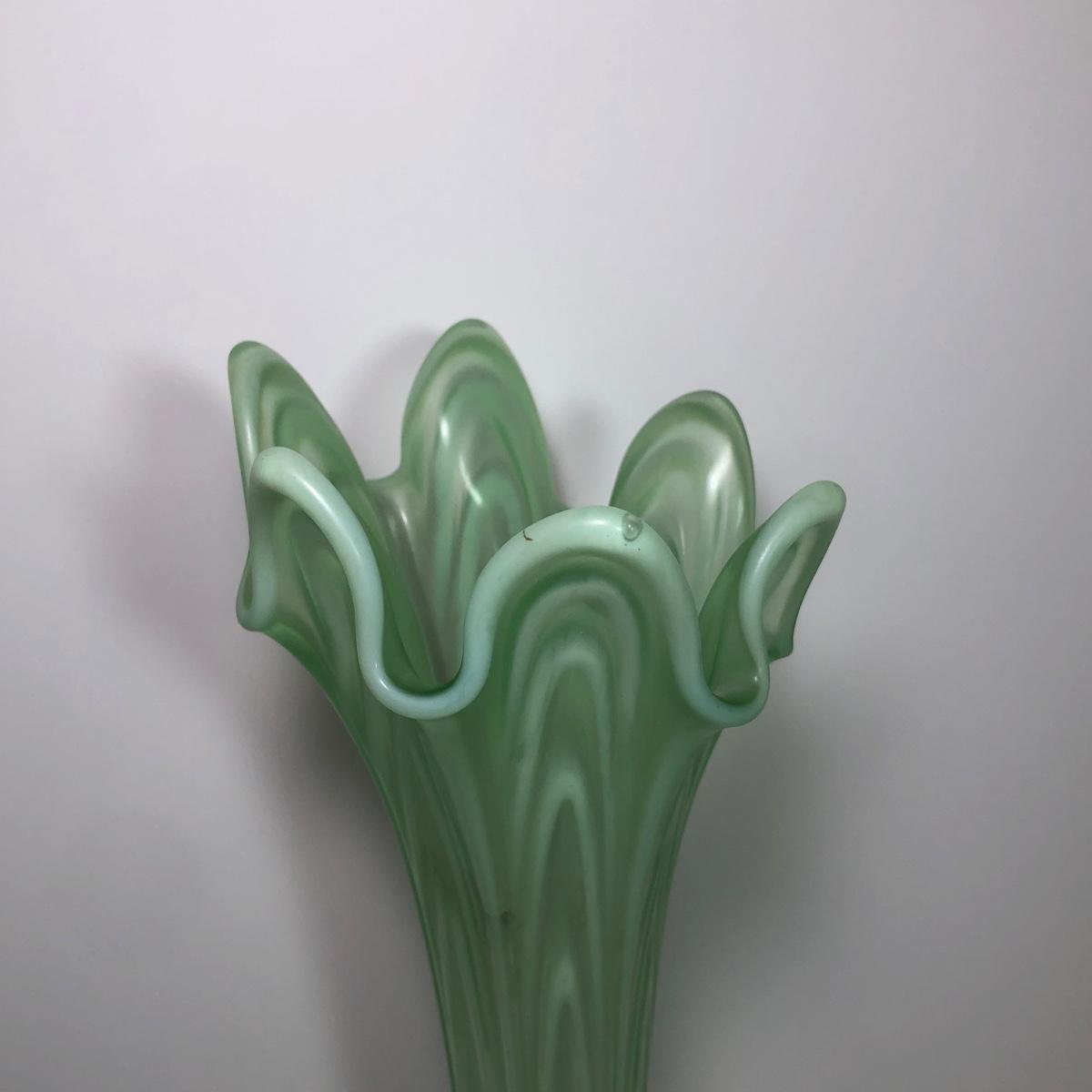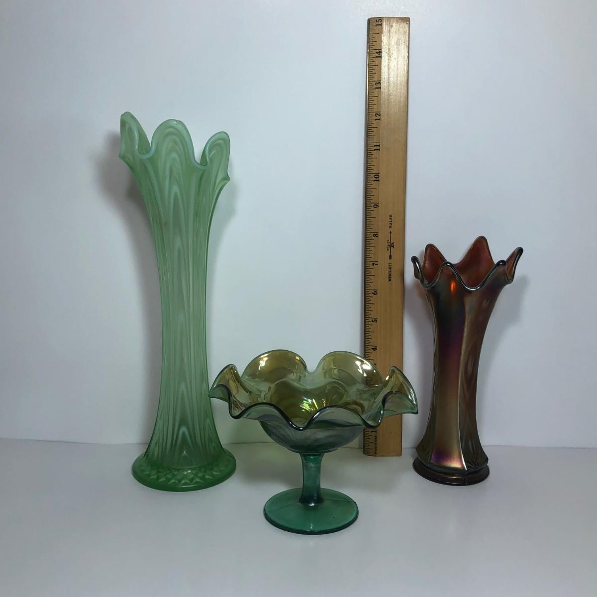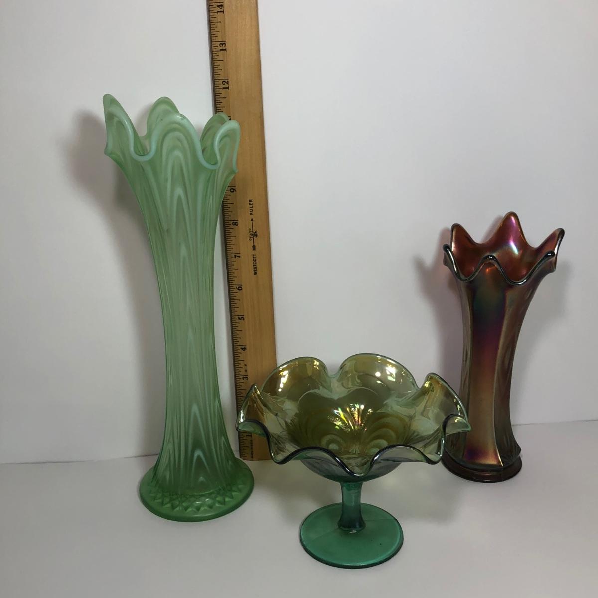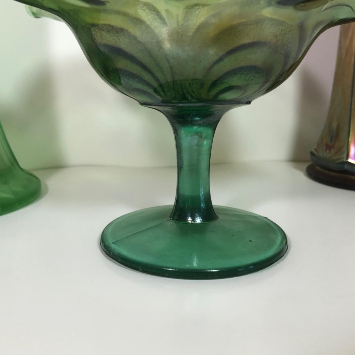 LOT 29M: Vintage Green Opalescent Glass Vase, Vintage Iridescent Purple Carnival Glass Art Deco Vase & Avocado Glass Candy Dish