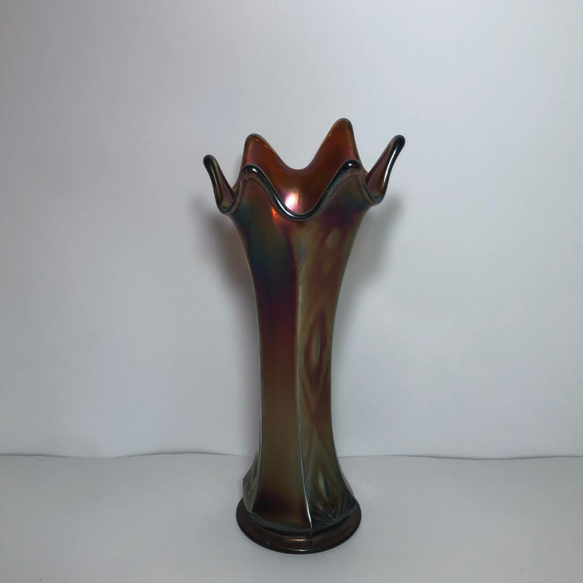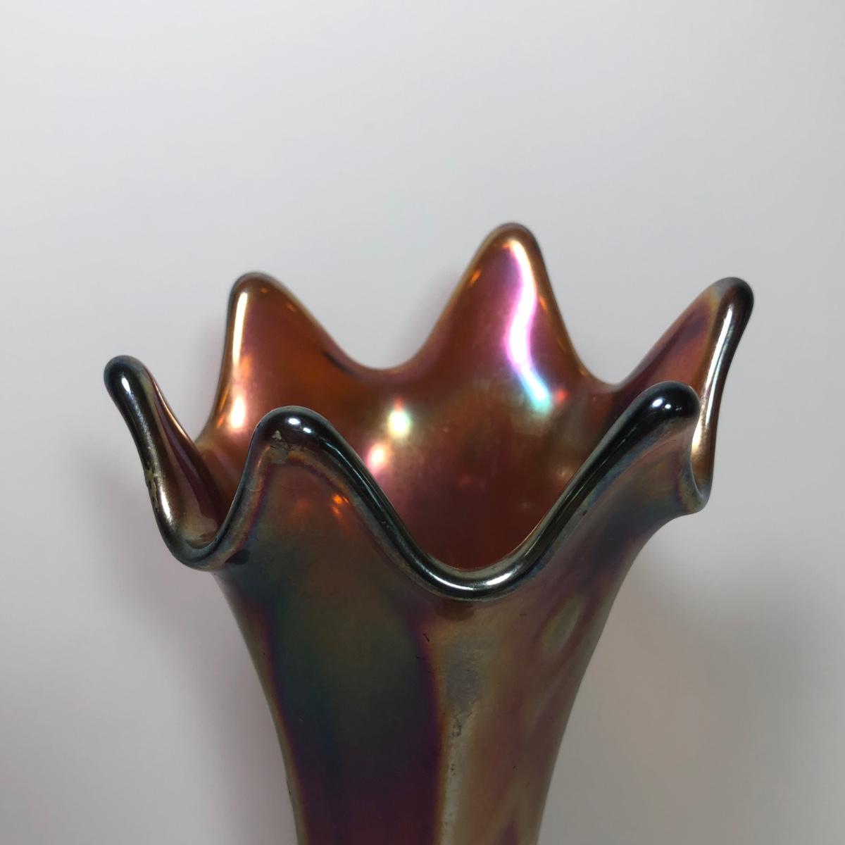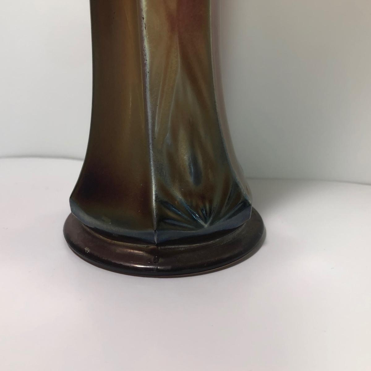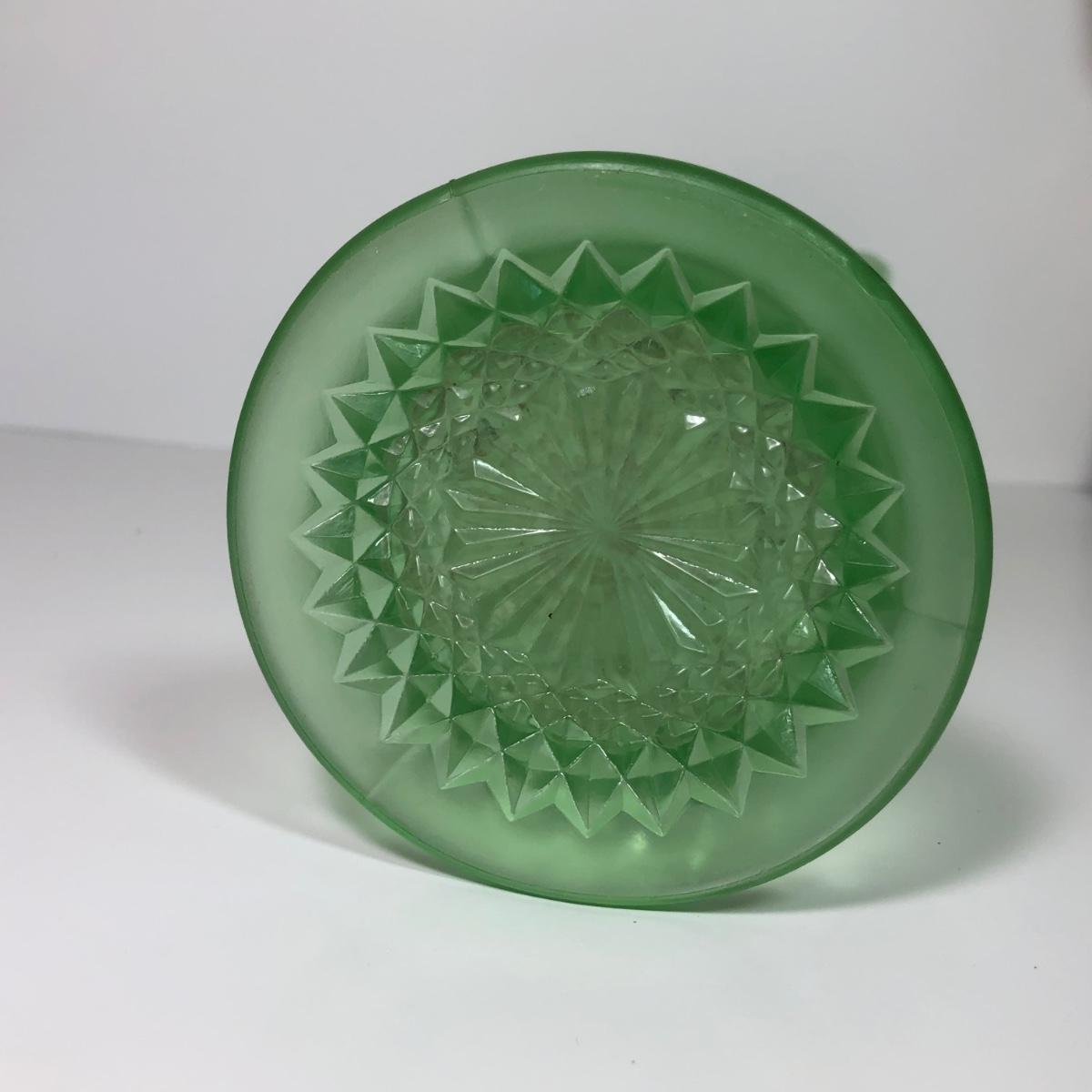 LOT 29M: Vintage Green Opalescent Glass Vase, Vintage Iridescent Purple Carnival Glass Art Deco Vase & Avocado Glass Candy Dish