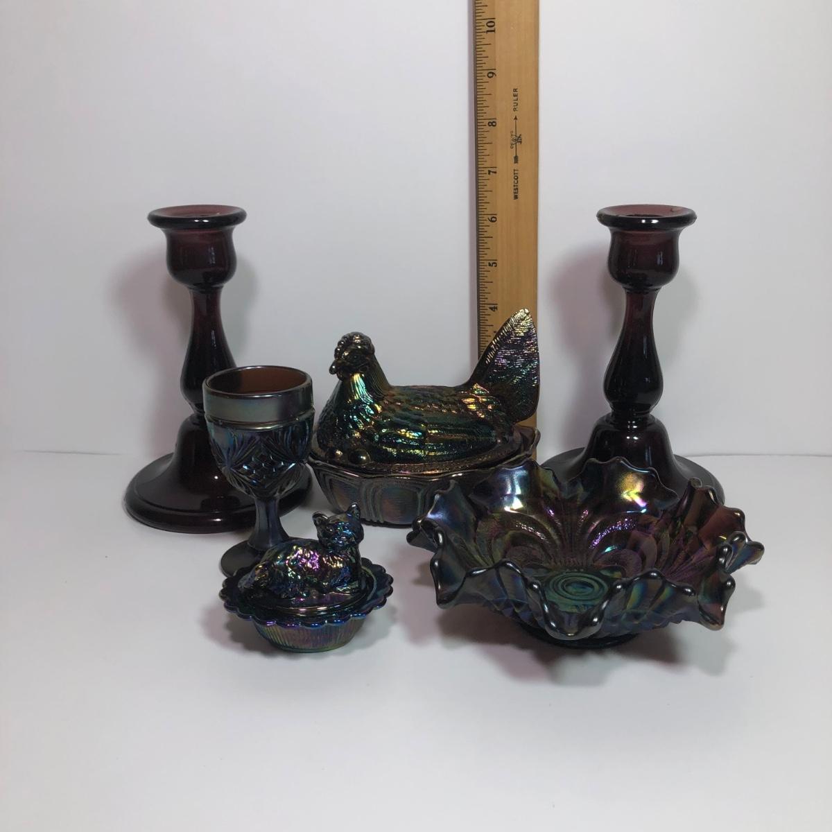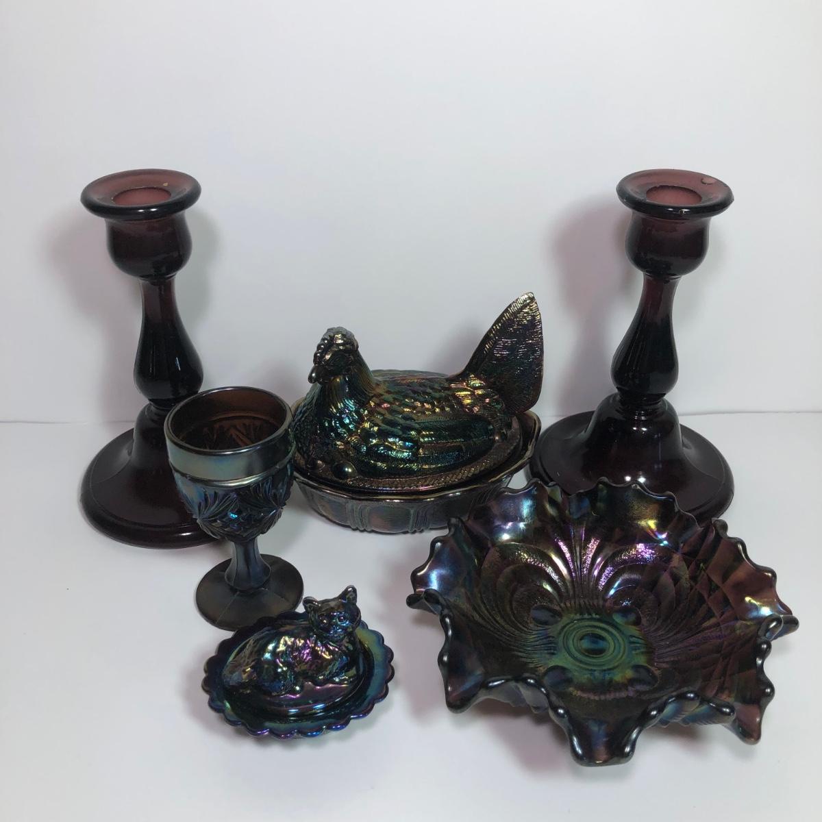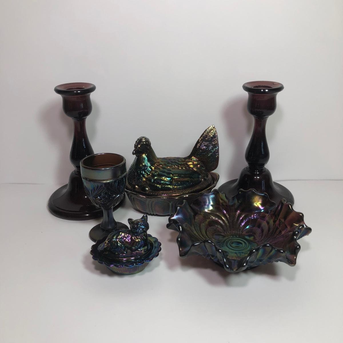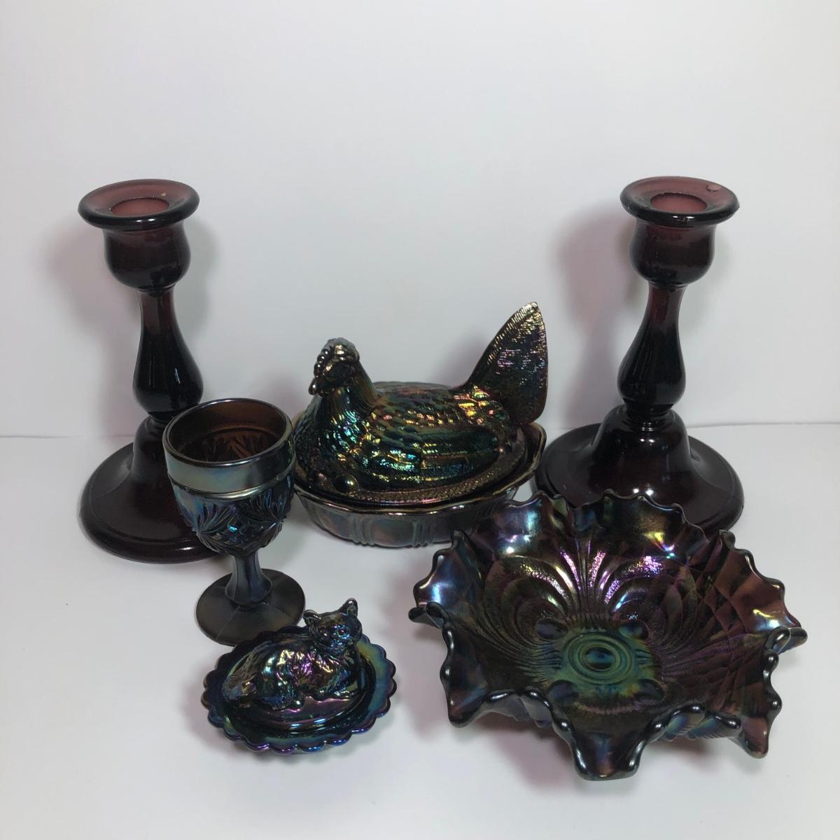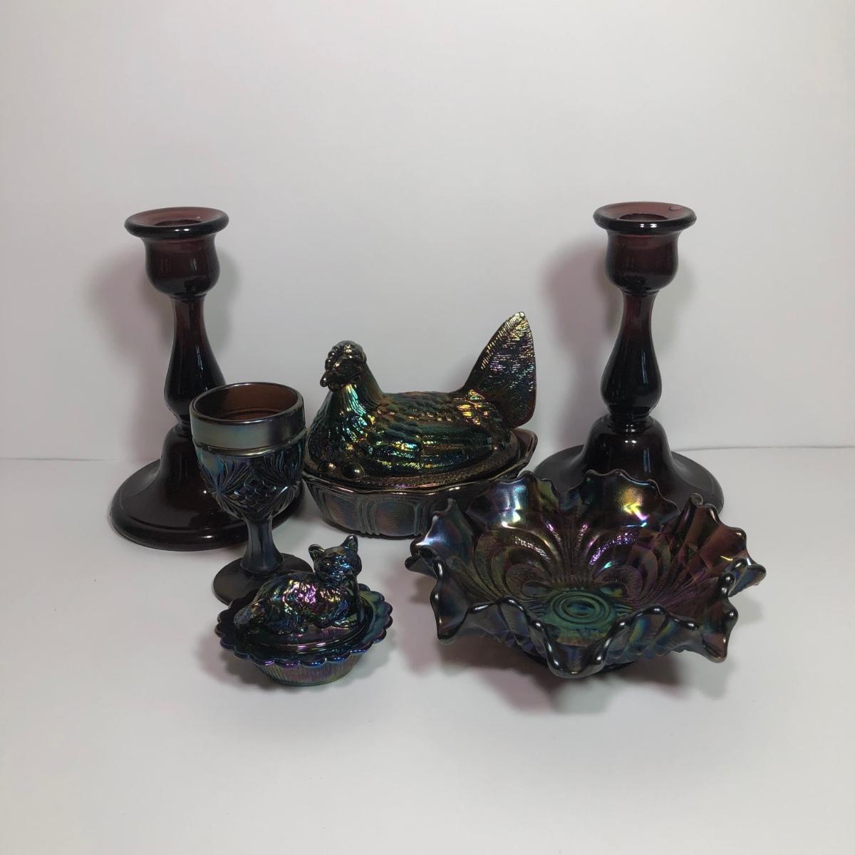 LOT 32M: Iridescent Purple Carnival Glass & More - Fenton Hen on a Nest, Wavy Candy Dish, Cat, Goblet