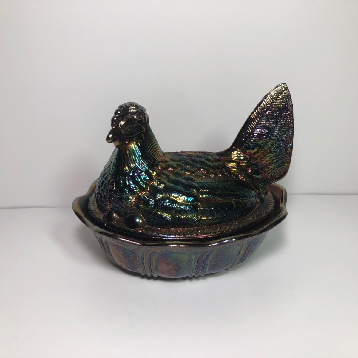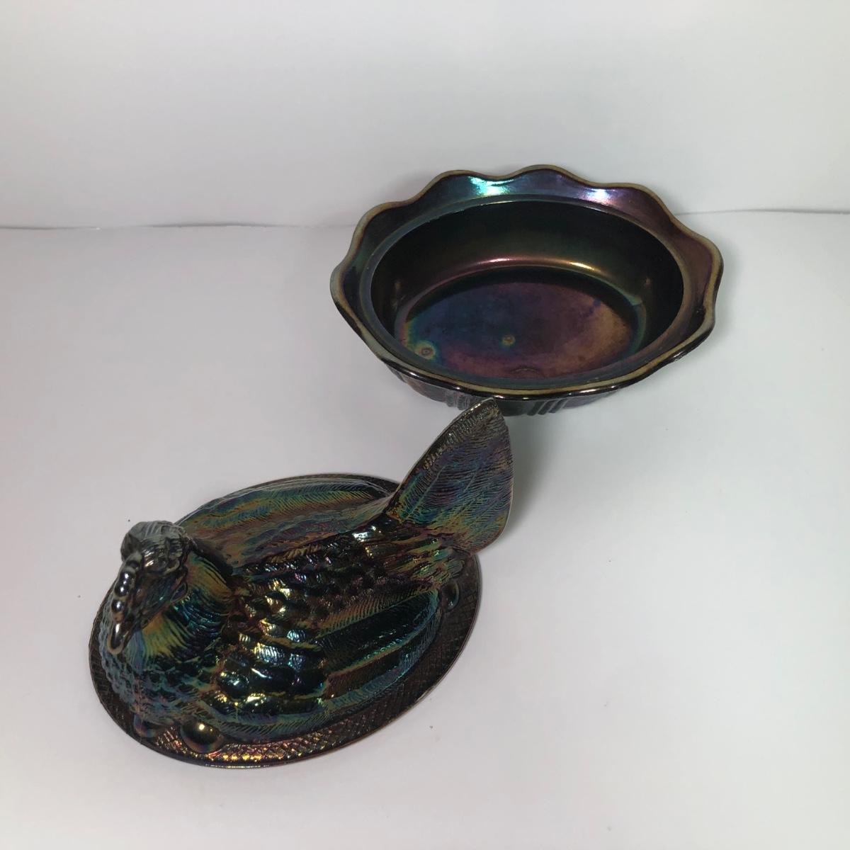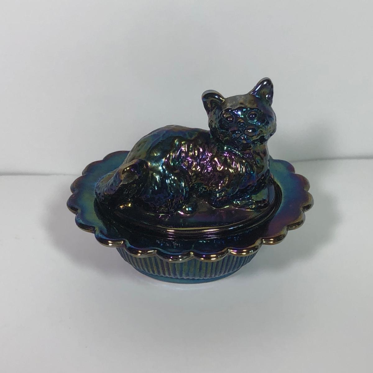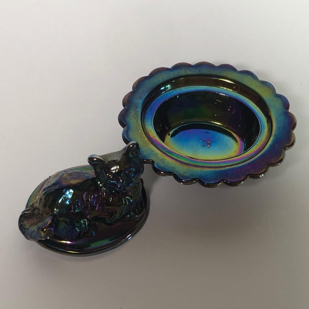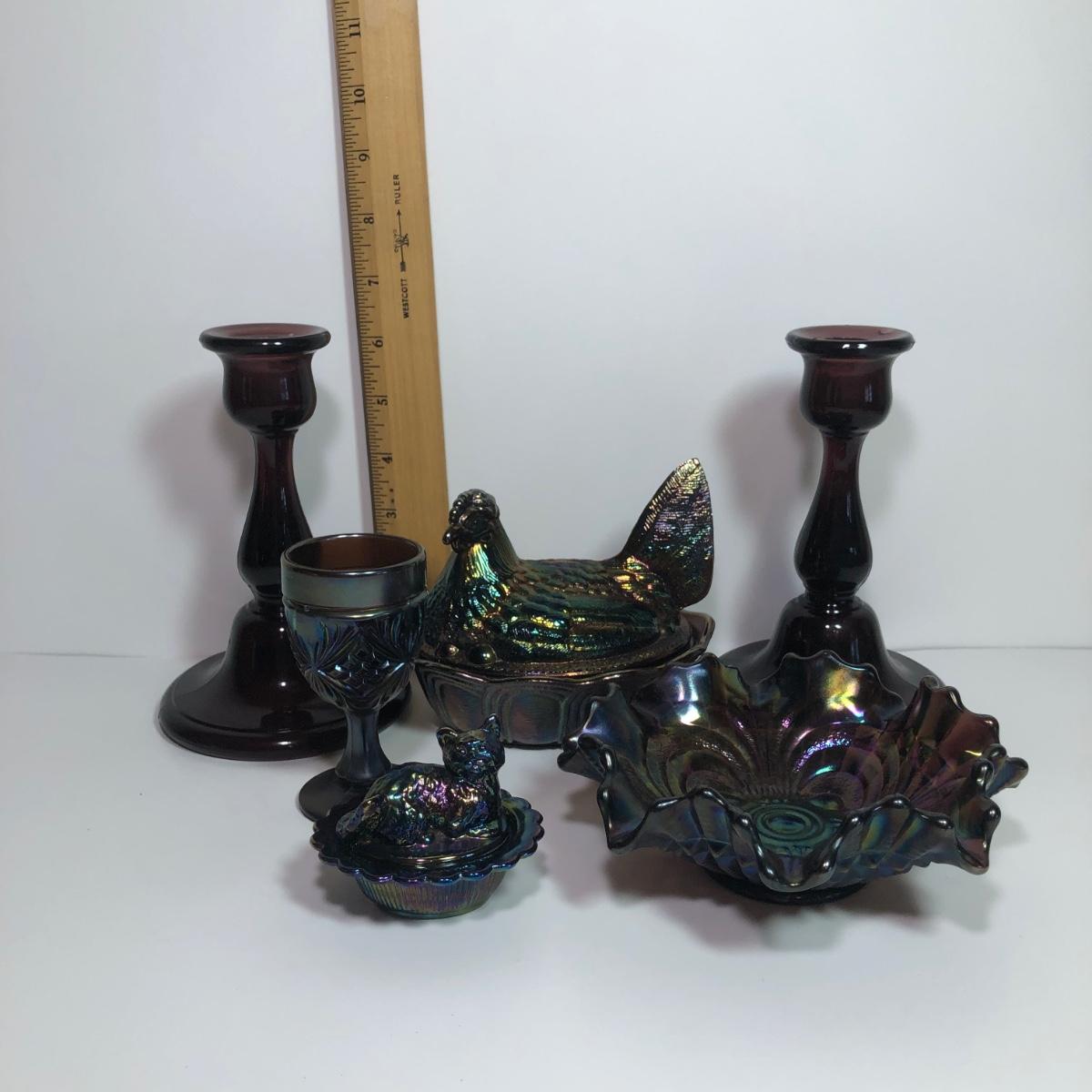 LOT 32M: Iridescent Purple Carnival Glass & More - Fenton Hen on a Nest, Wavy Candy Dish, Cat, Goblet