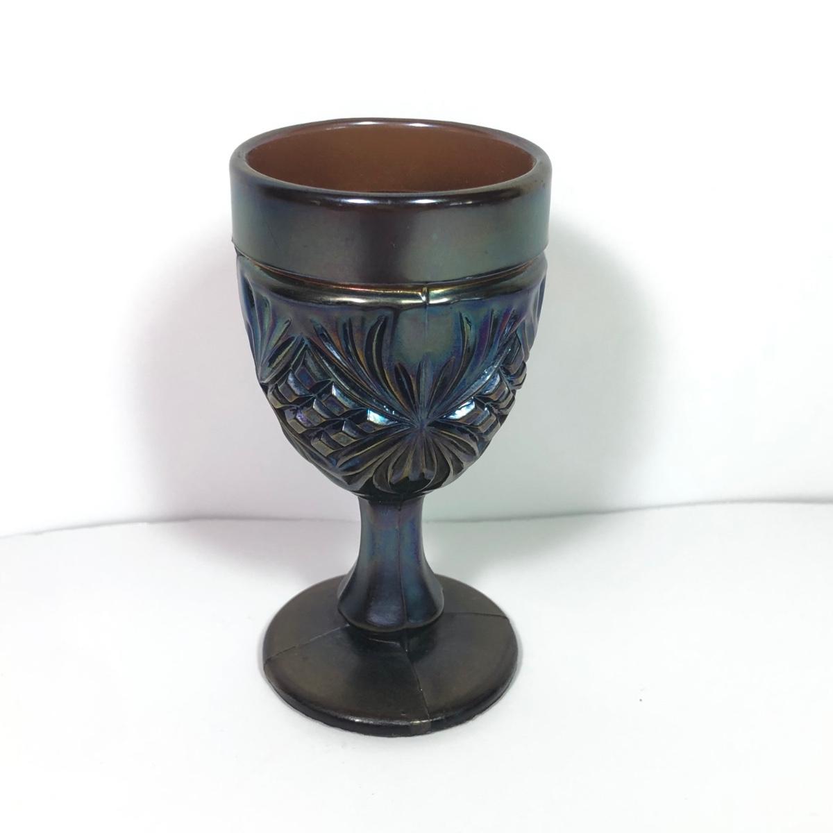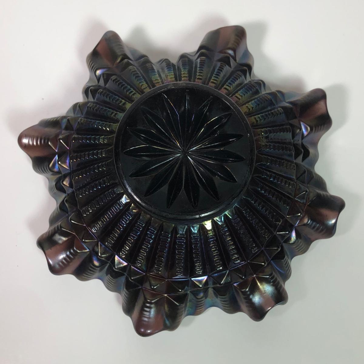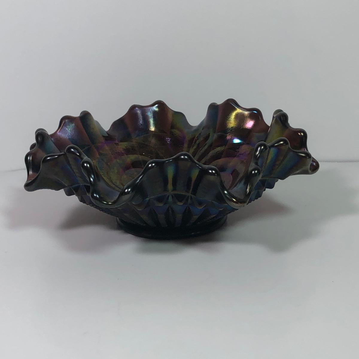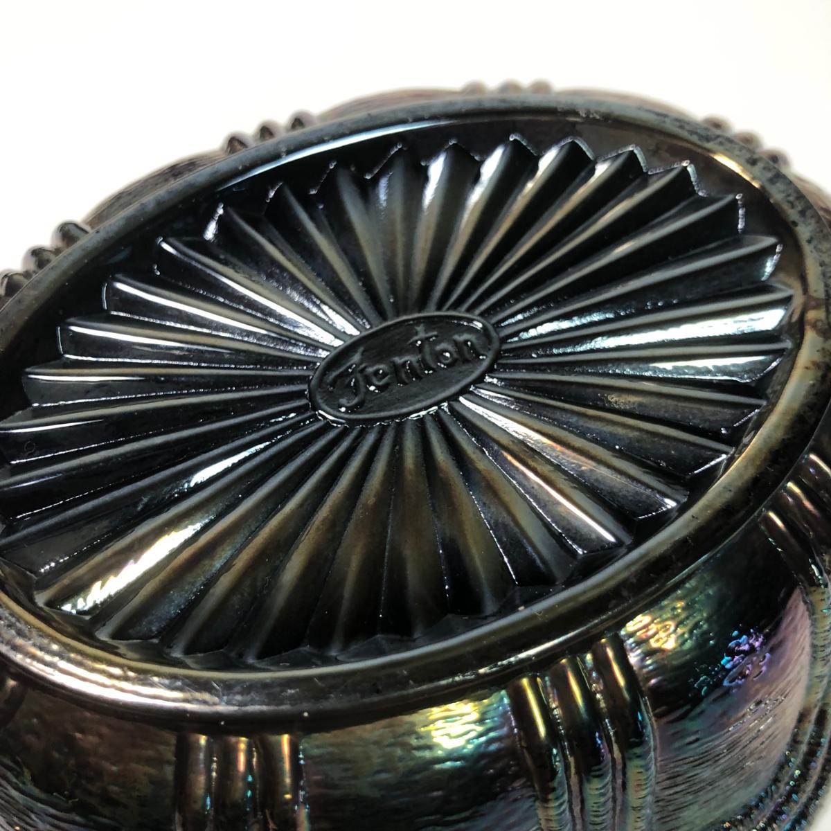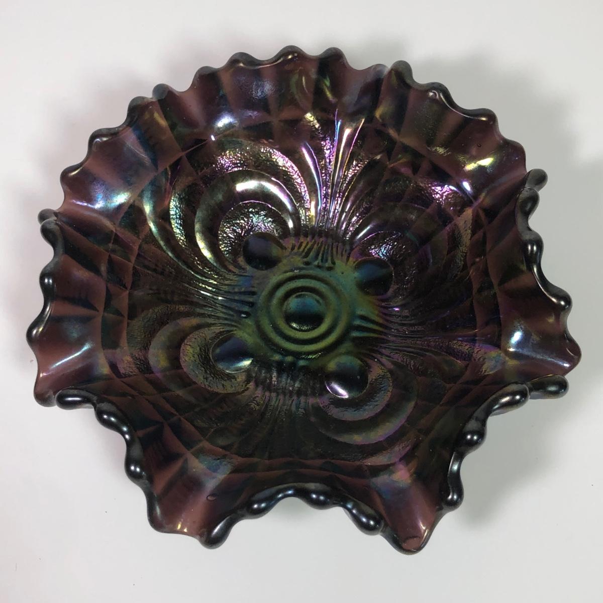 LOT 32M: Iridescent Purple Carnival Glass & More - Fenton Hen on a Nest, Wavy Candy Dish, Cat, Goblet