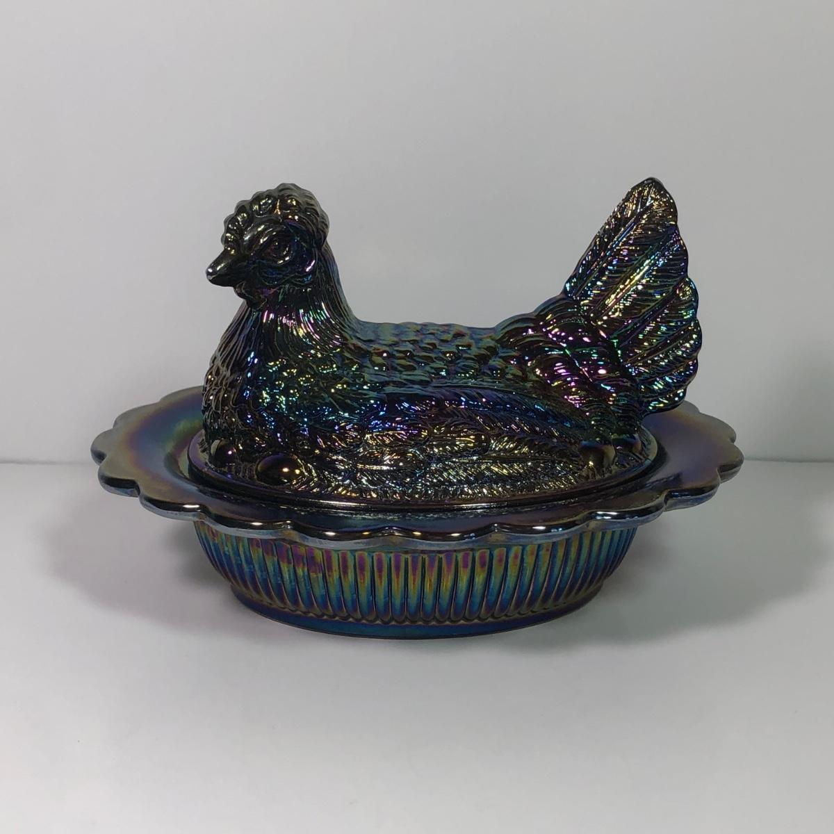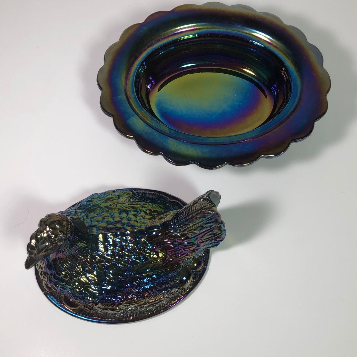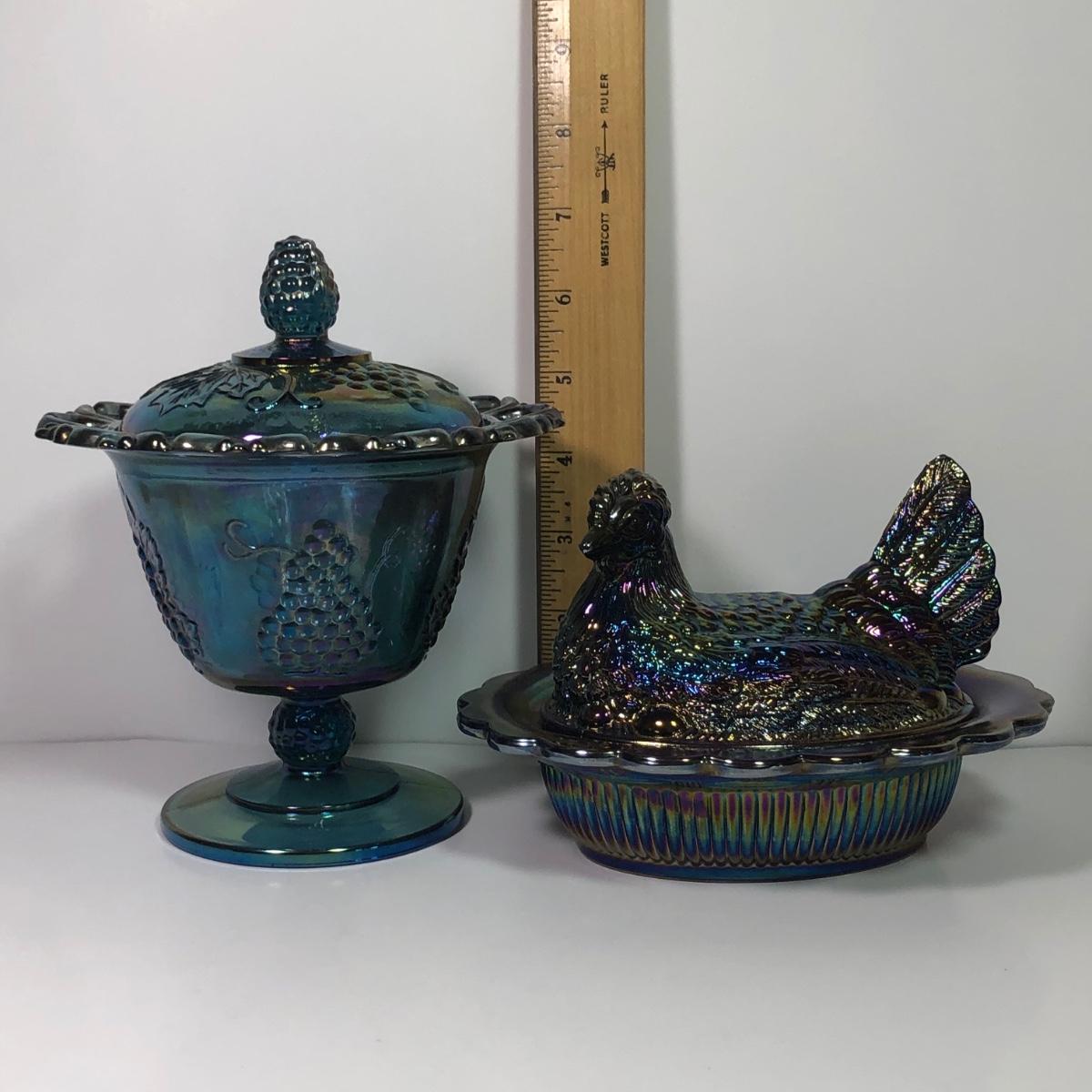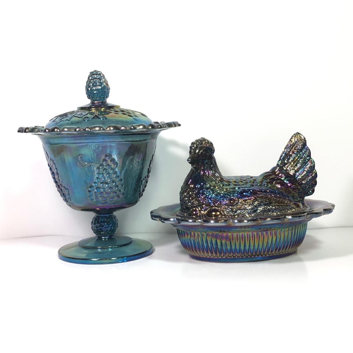 LOT 34M: Vintage Iridescent Carnival Glass - Purple Hen on a Nest & Blue Lidded Candy Dish