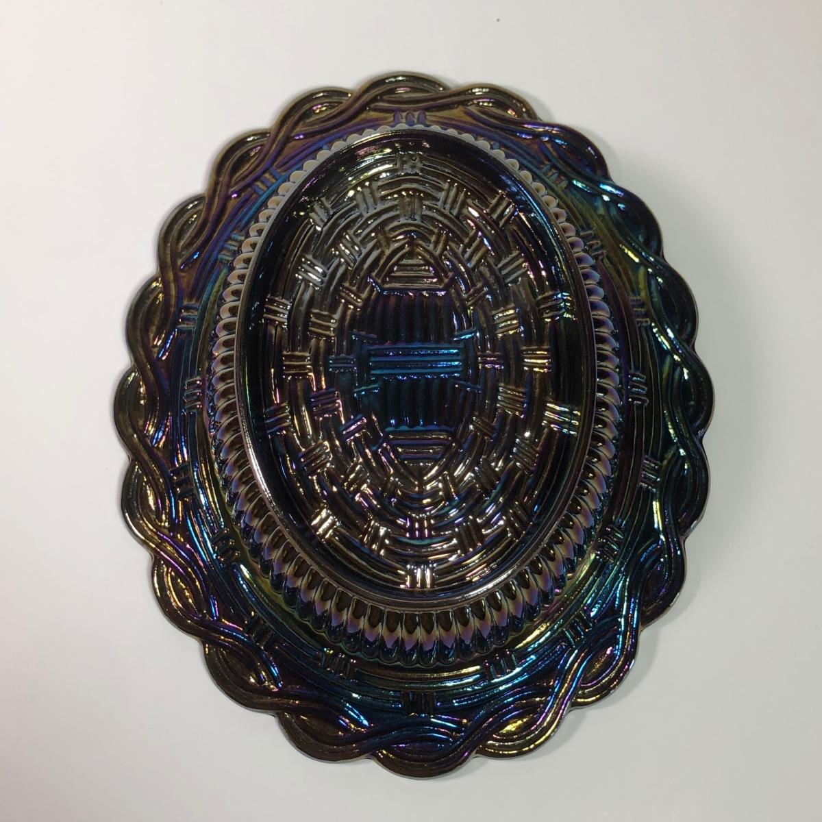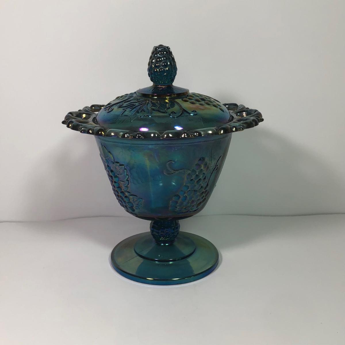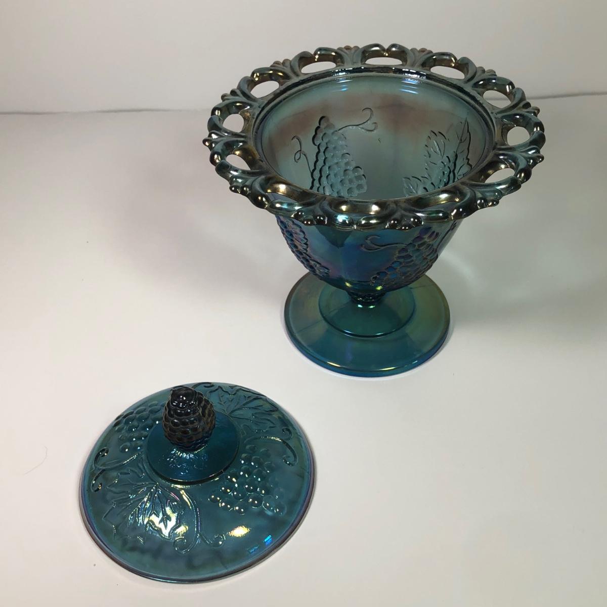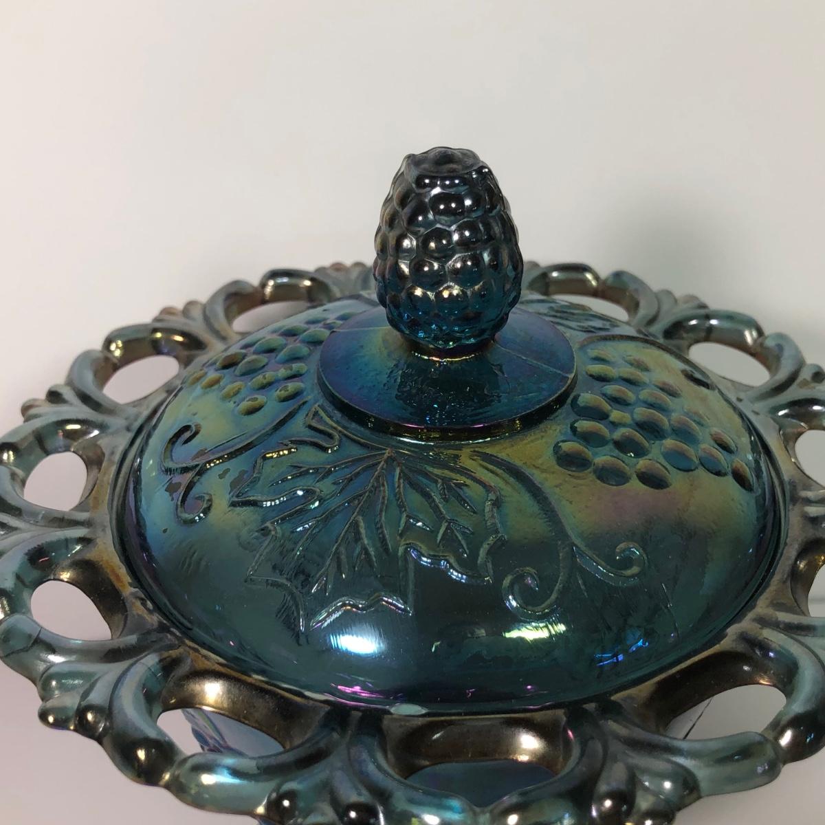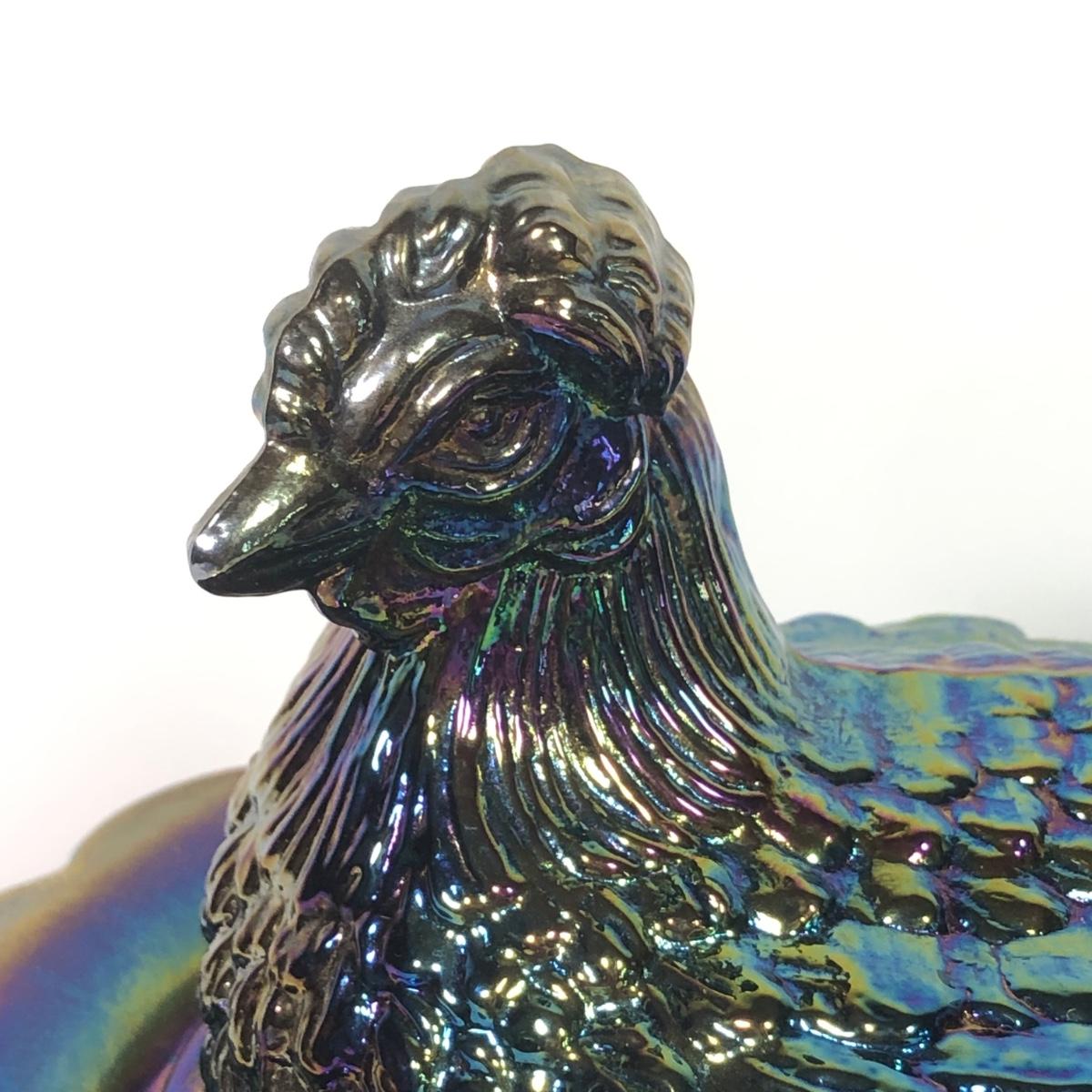 LOT 34M: Vintage Iridescent Carnival Glass - Purple Hen on a Nest & Blue Lidded Candy Dish