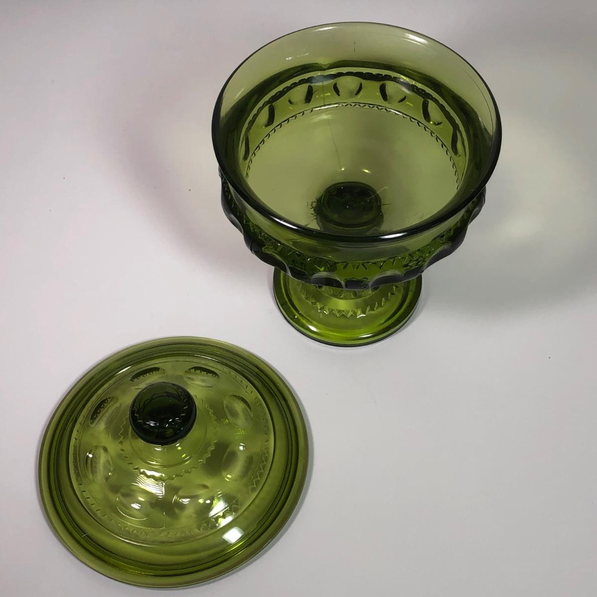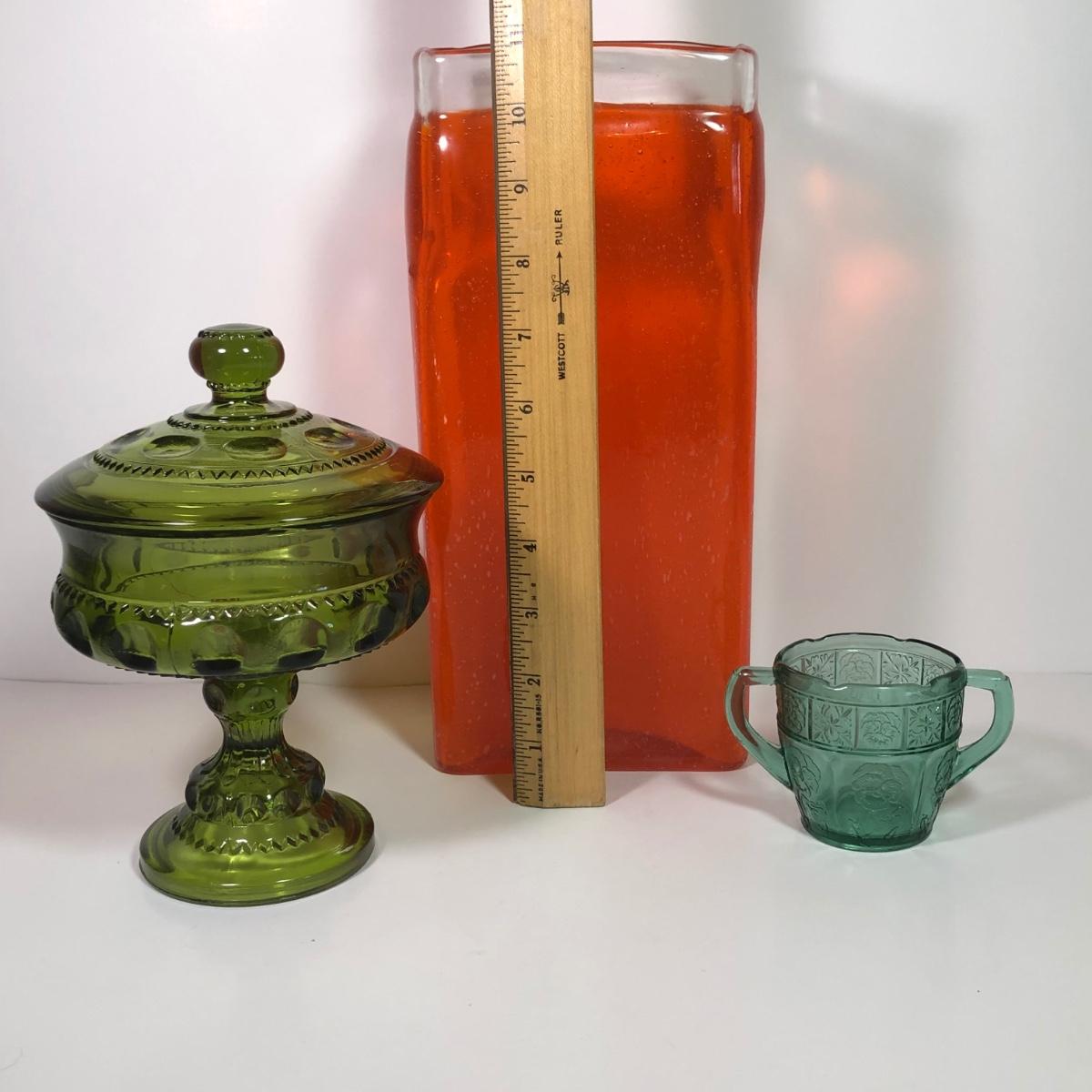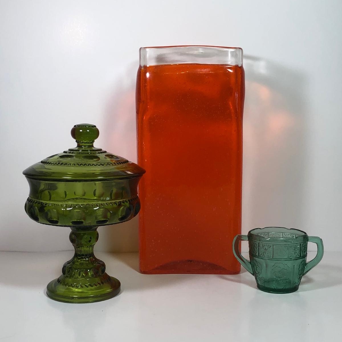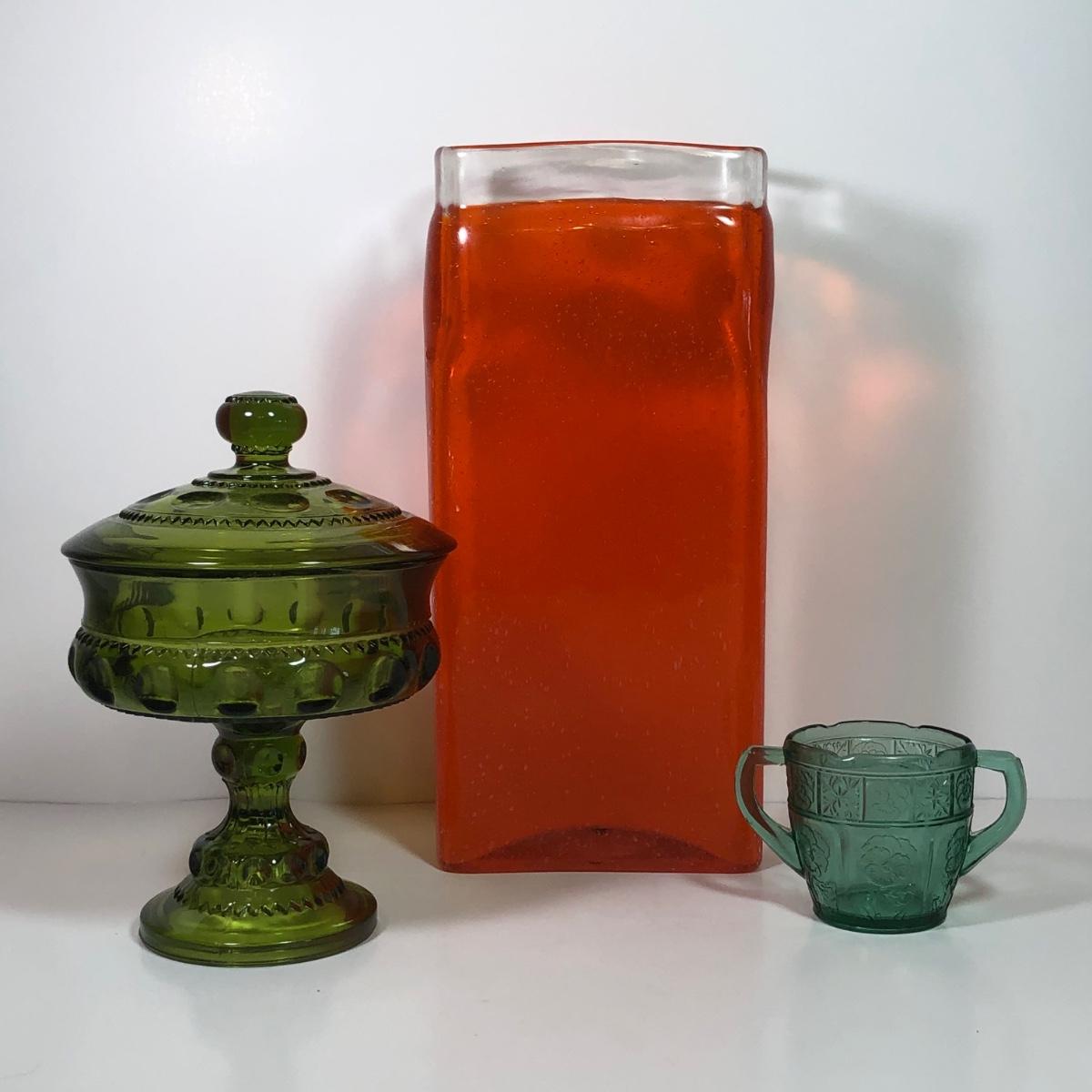 LOT 39M: Vintage Teal Pansy Depression Glass Cup, Avocado Glass Candy Dish & Large Rectangular Orange Glass Vase
