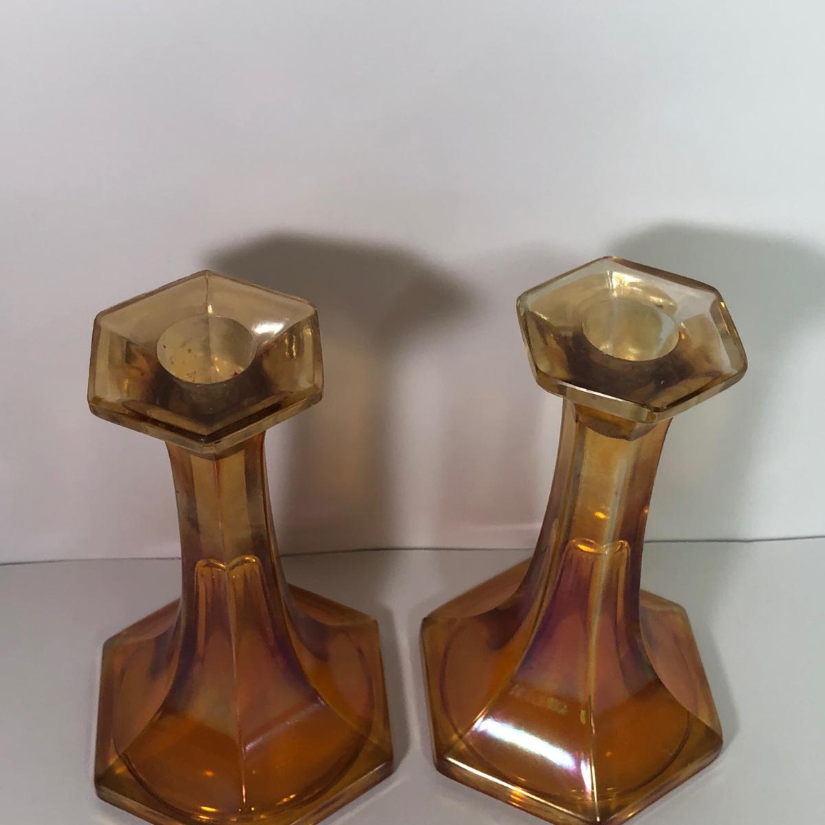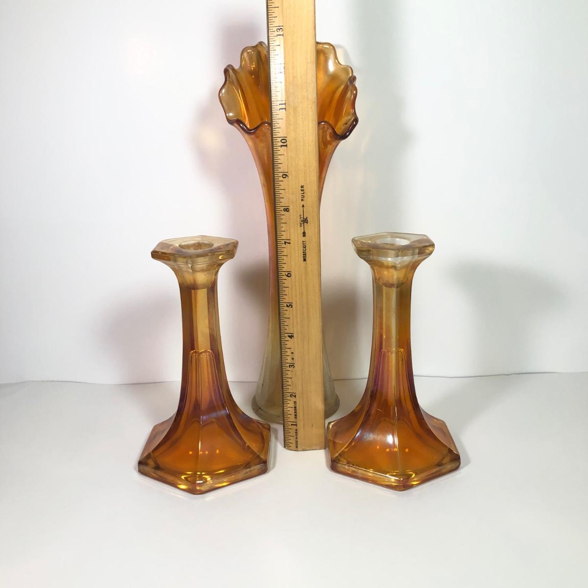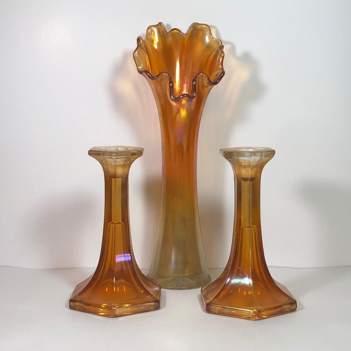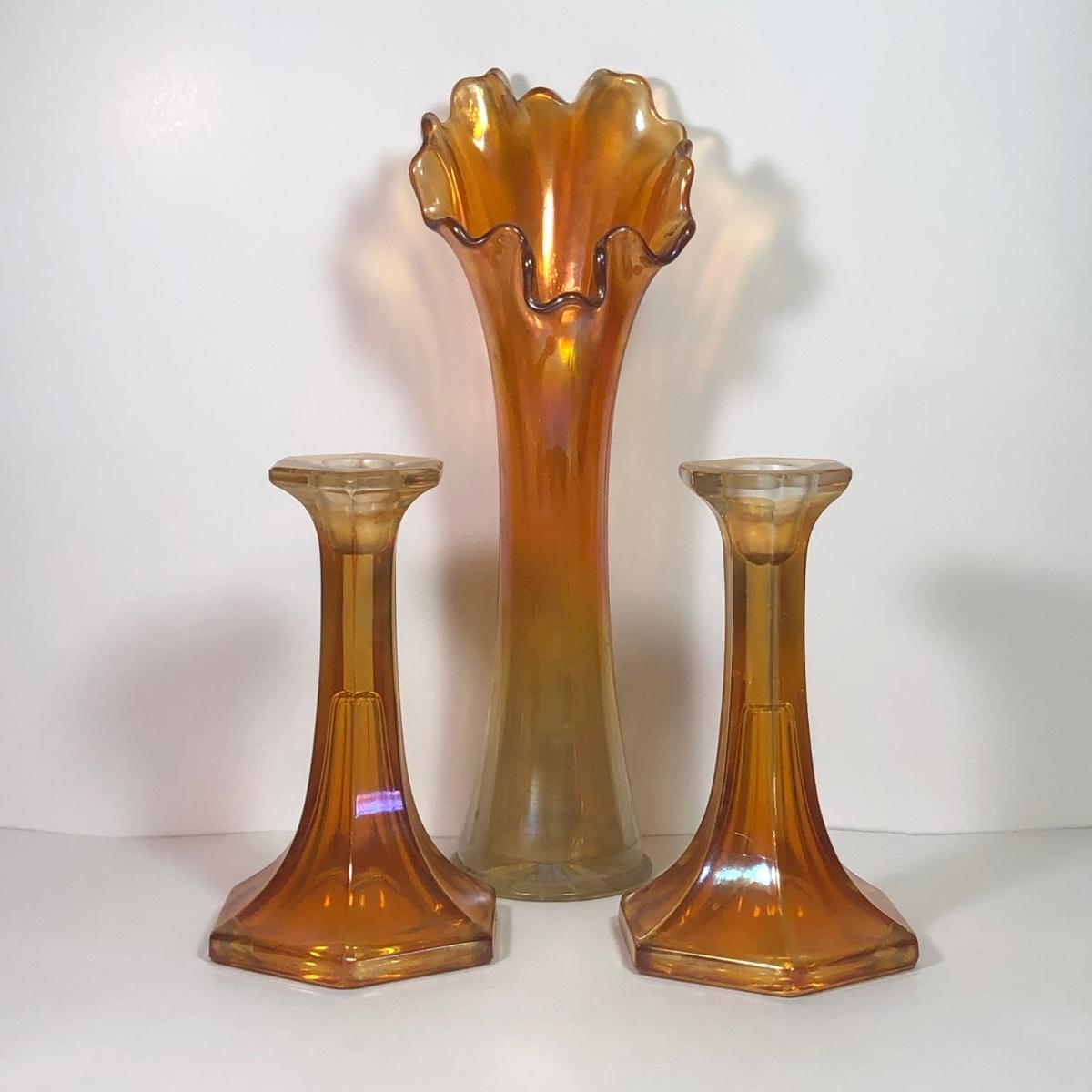 LOT 41M: Marigold Carnival Glass Vase & Pair of Amber Glass Candlestick Holders