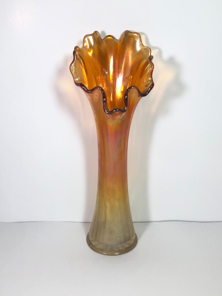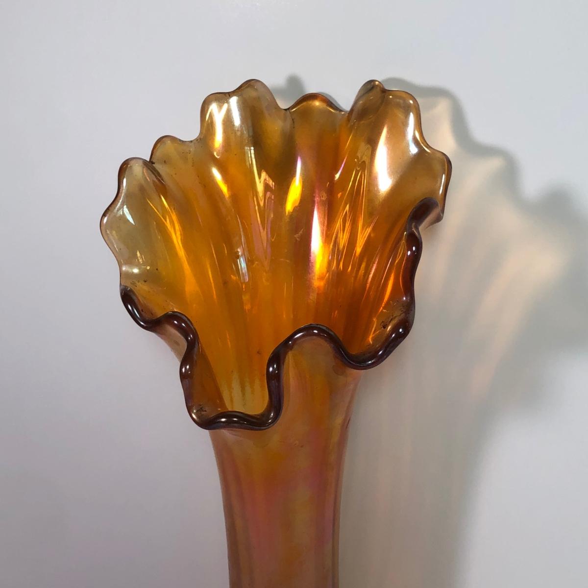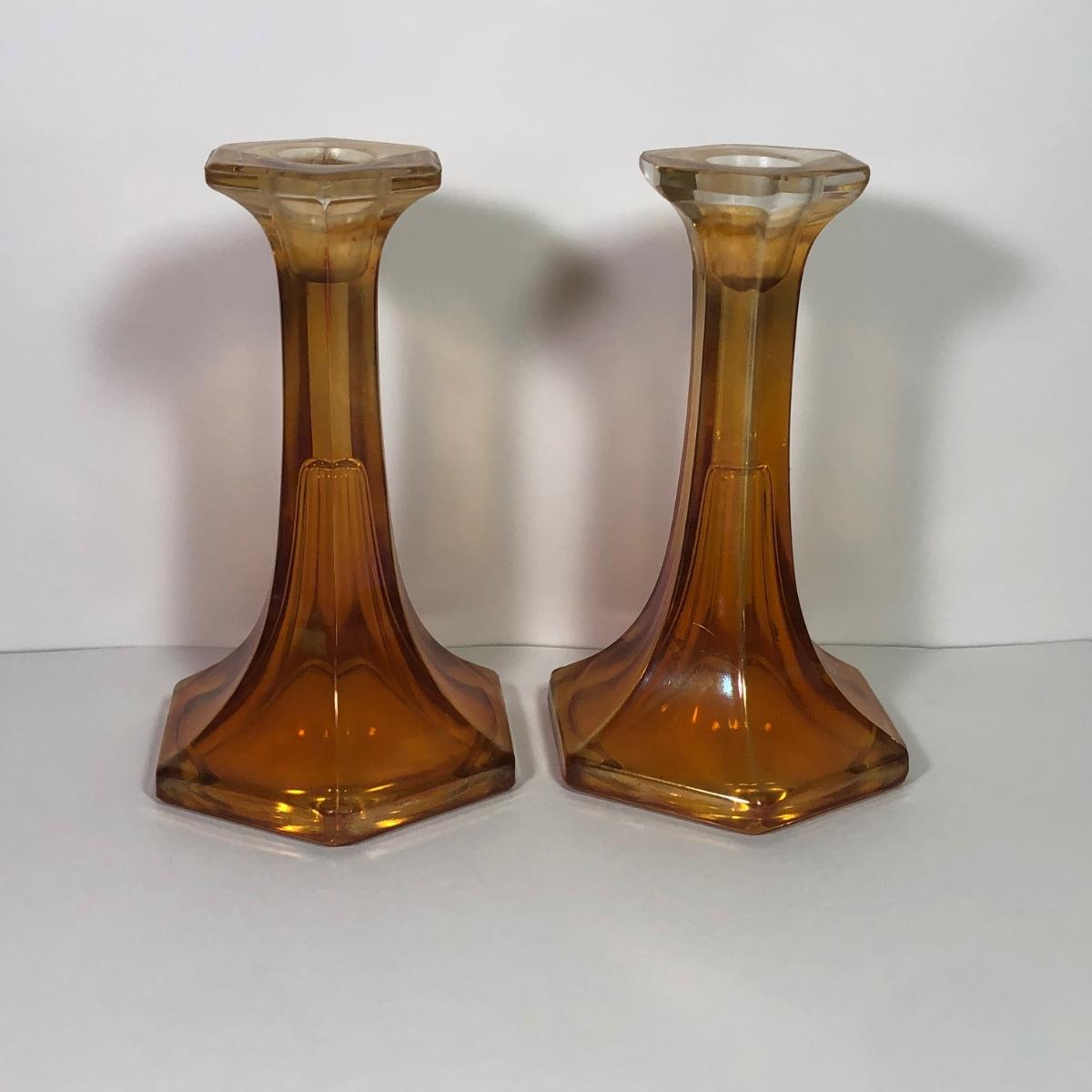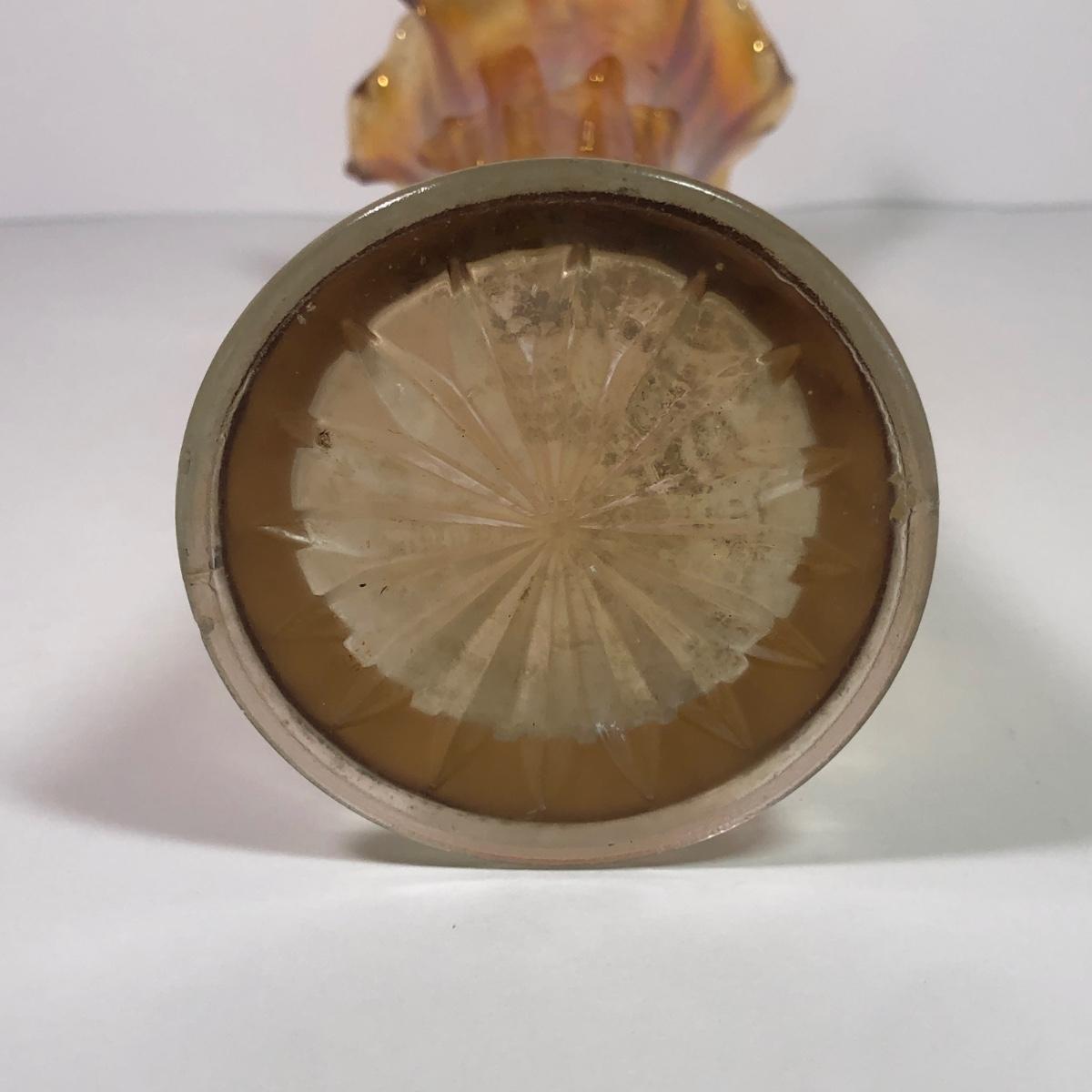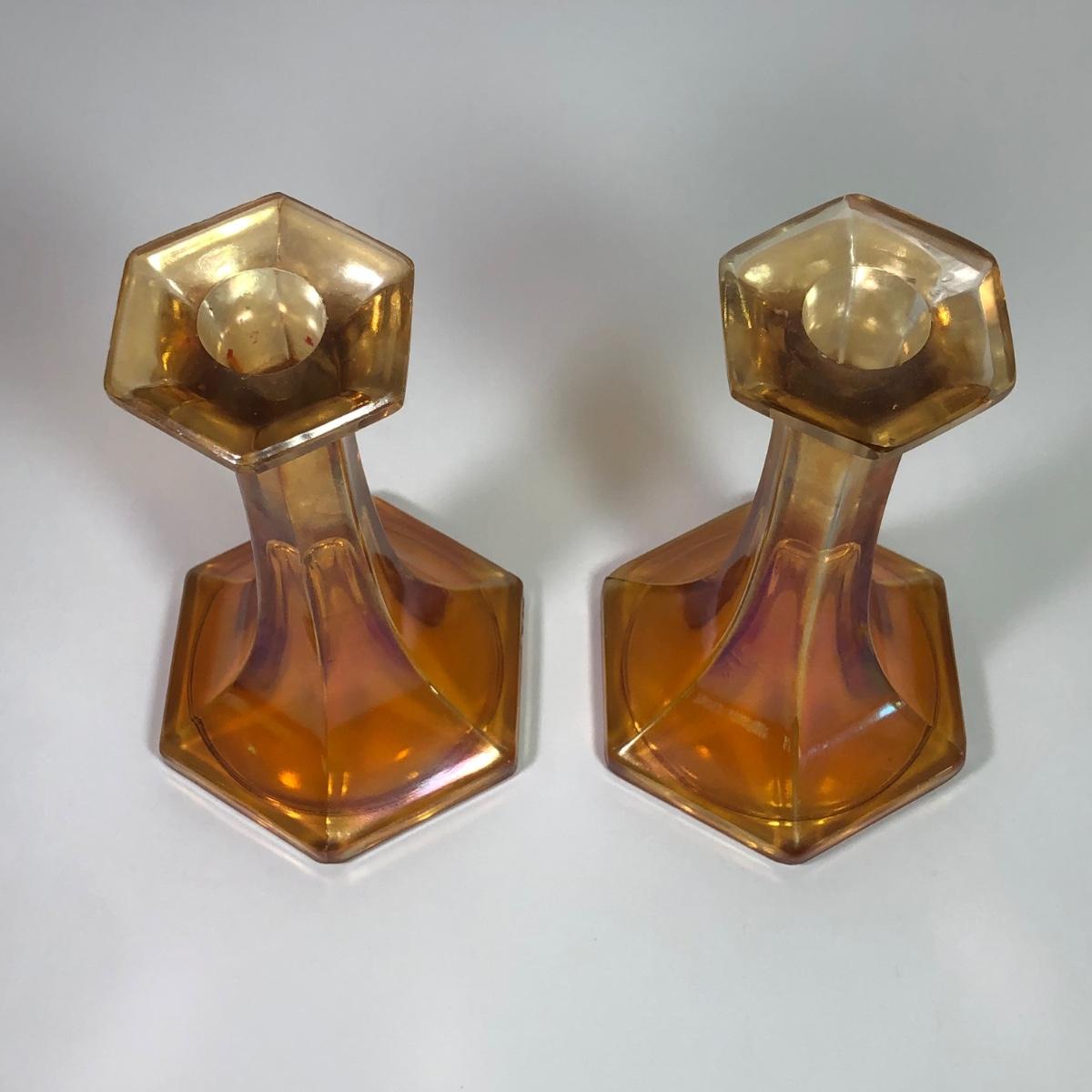 LOT 41M: Marigold Carnival Glass Vase & Pair of Amber Glass Candlestick Holders